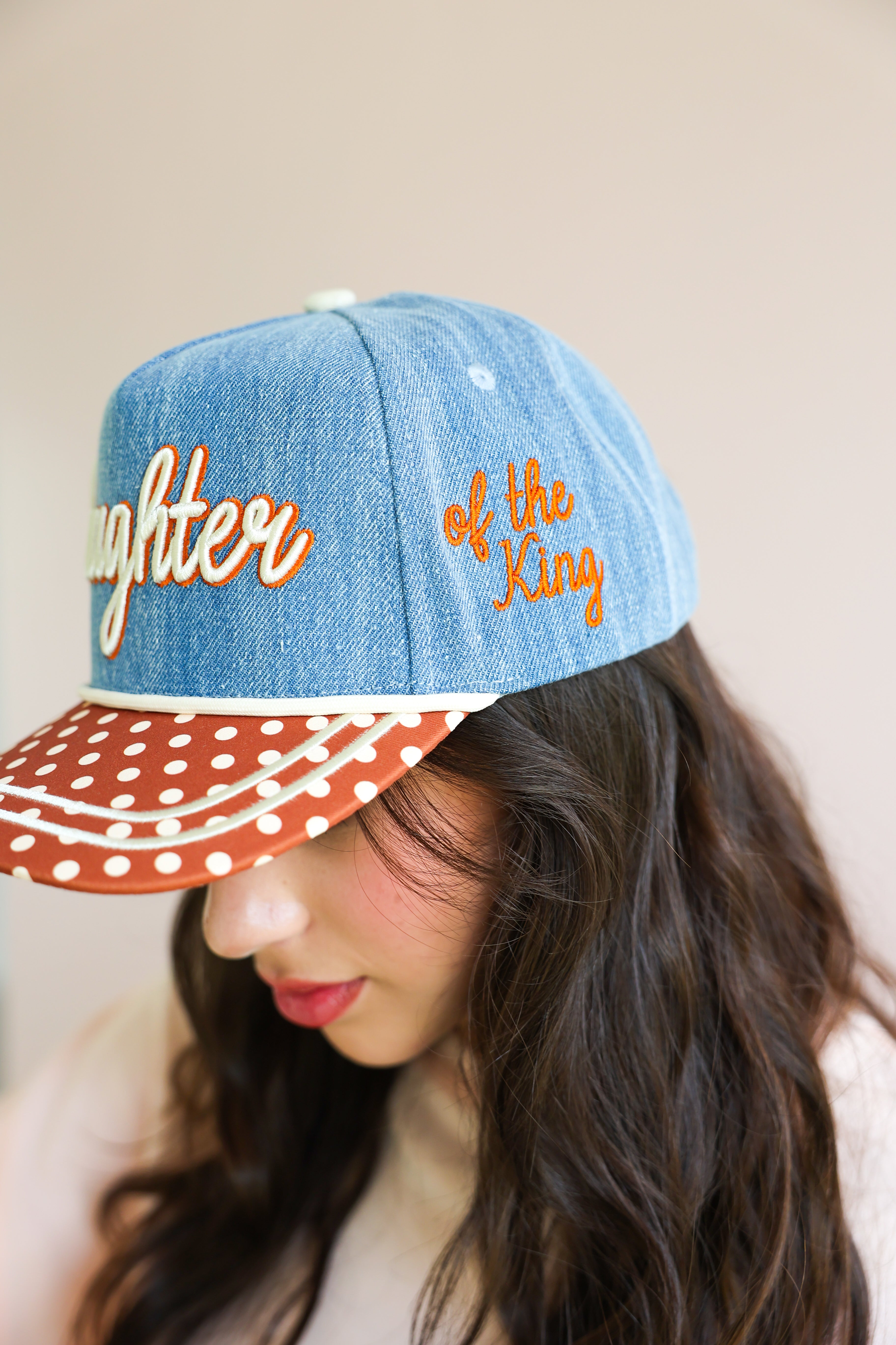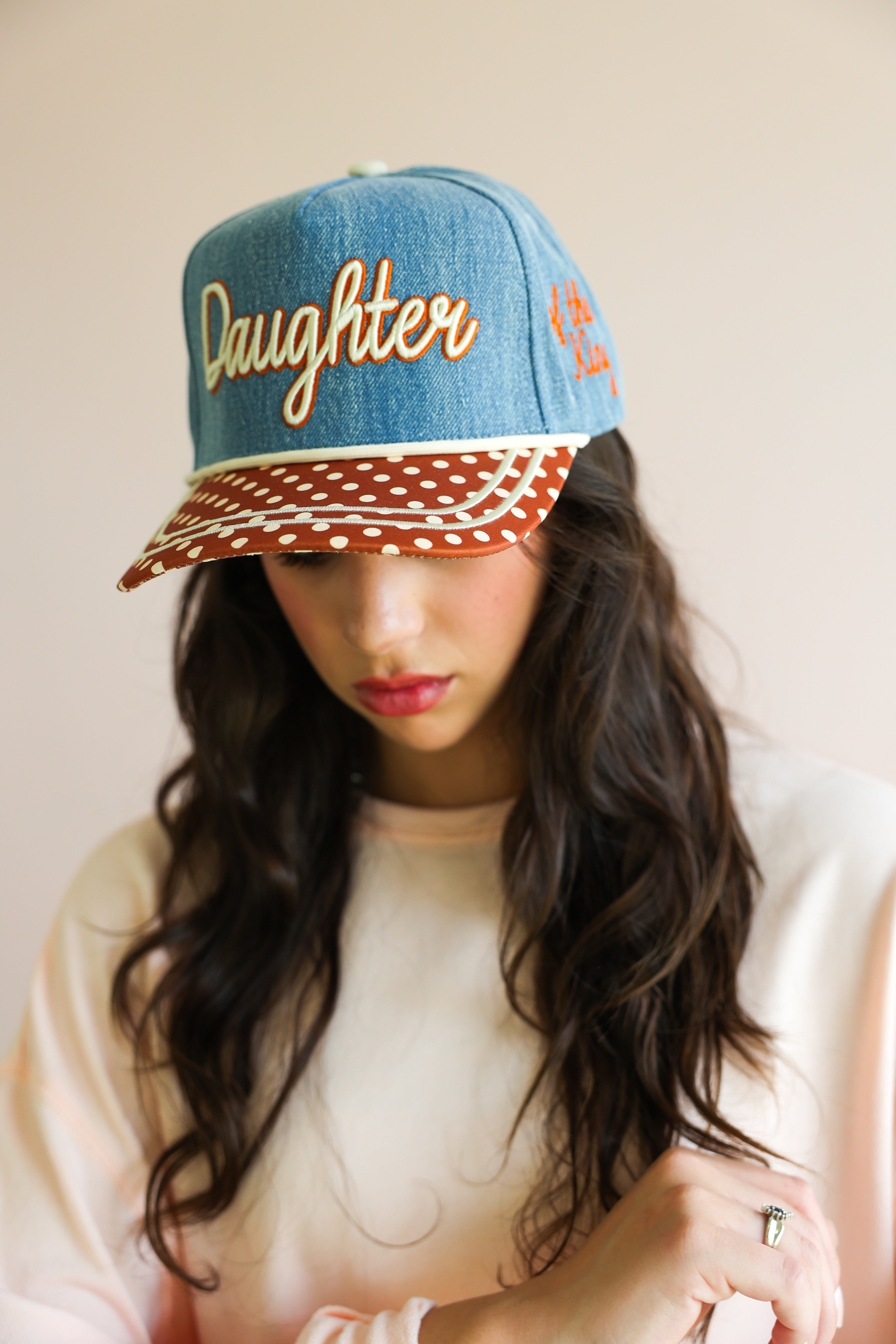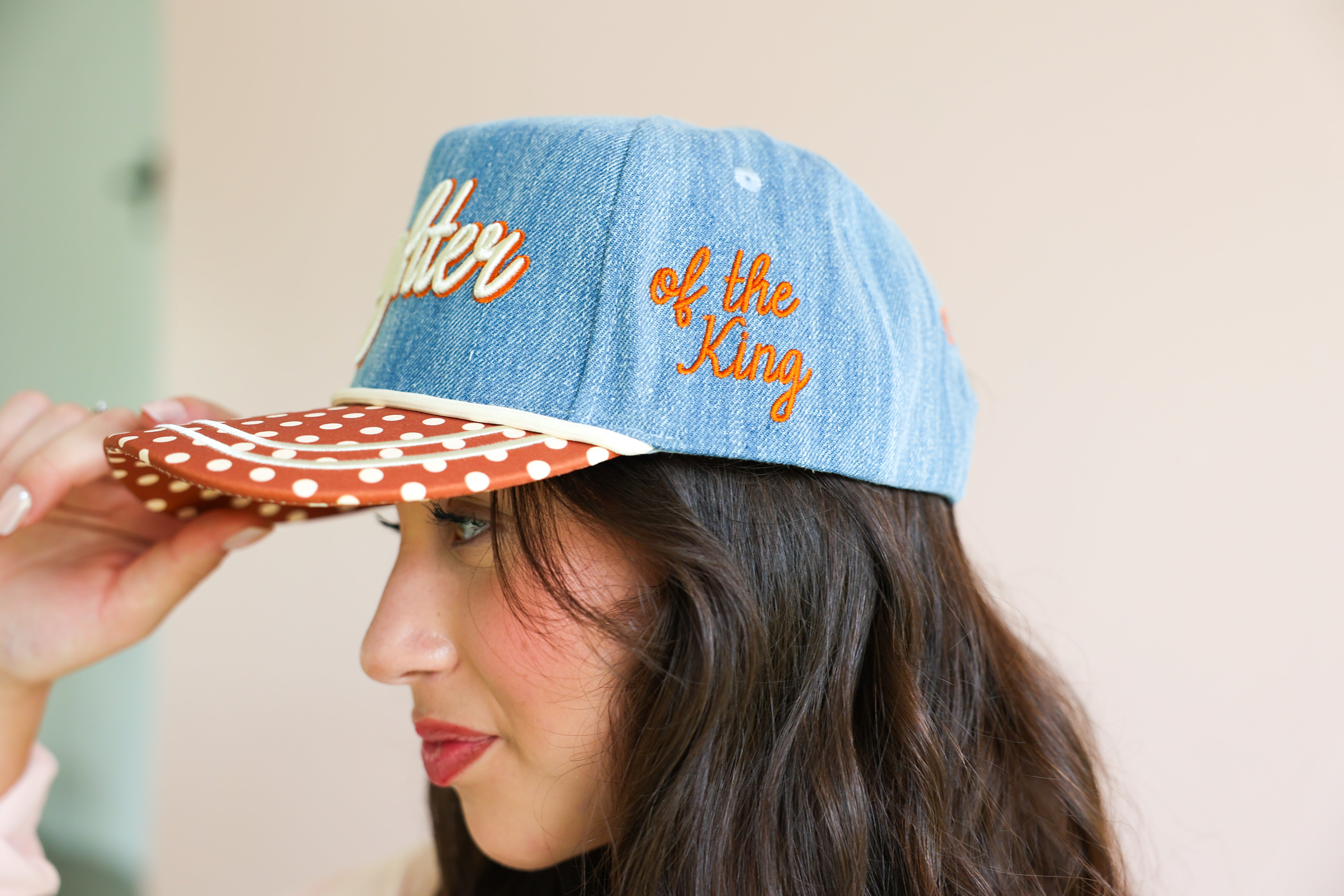 This elevated everyday cap features a soft denim crown with beautifully embroidered script reading “Daughter,” paired with a contrasting polka dot brim for a playful yet chic touch. The side detail, “of the King,” completes the message with a subtle but powerful reminder of your worth and purpose.