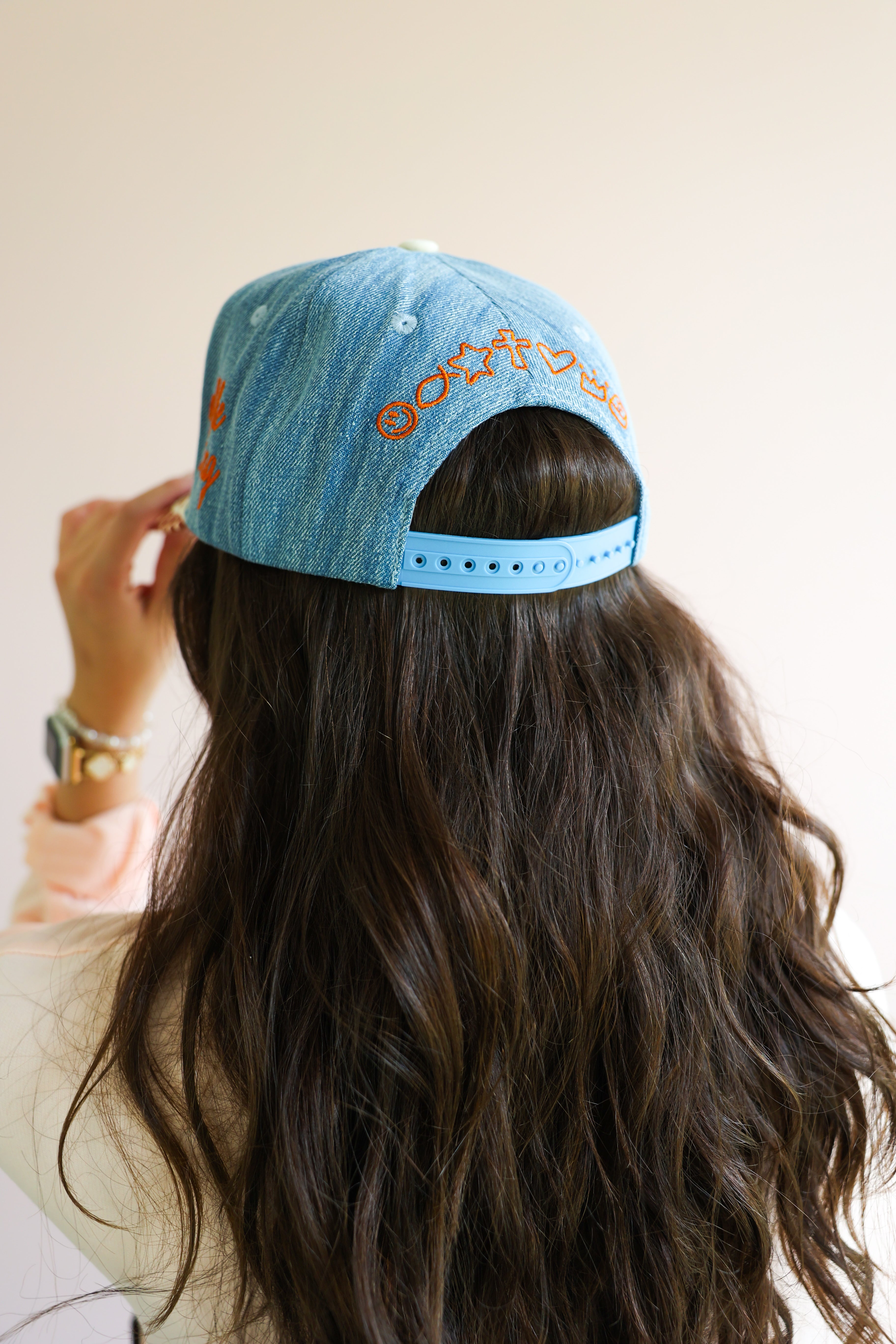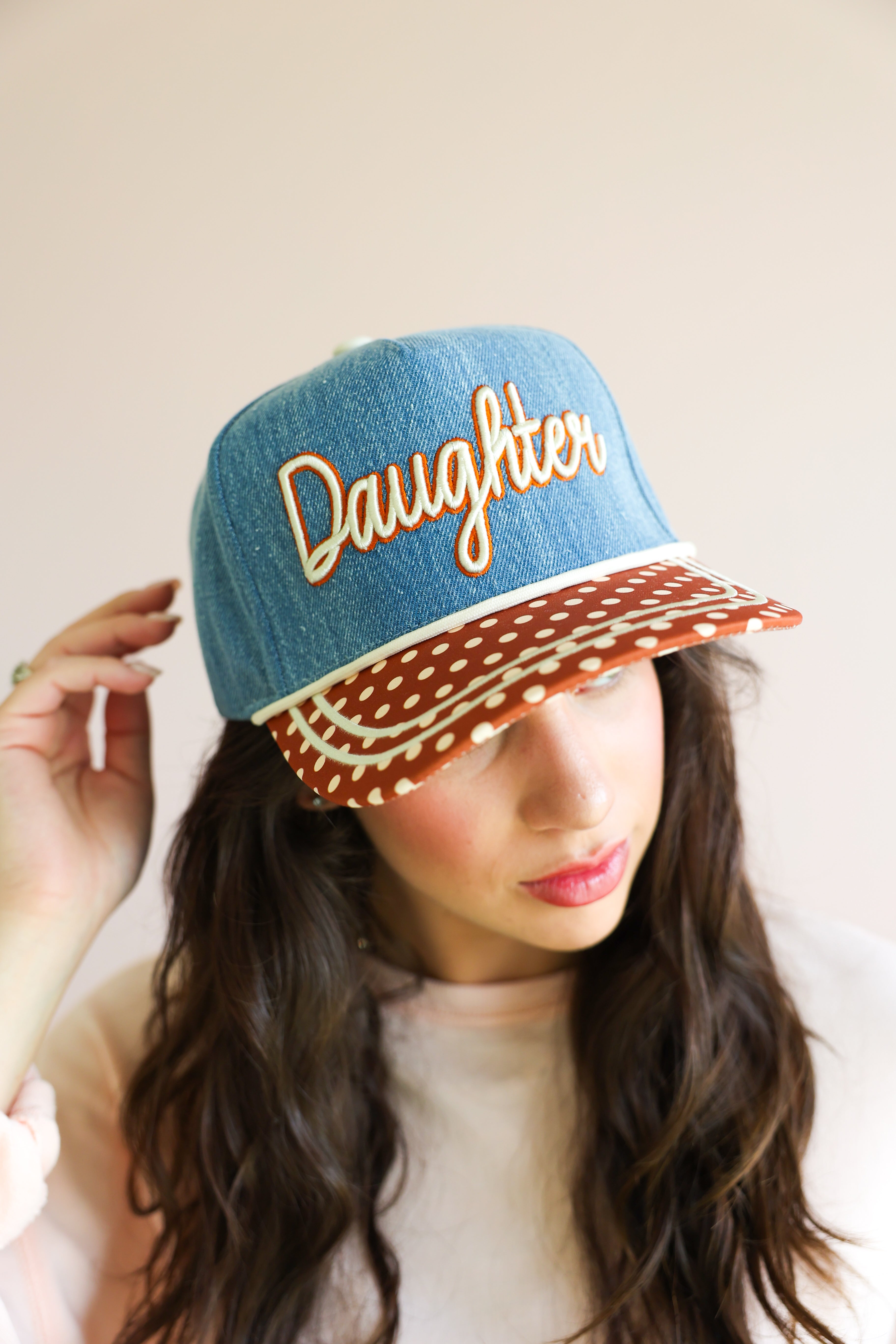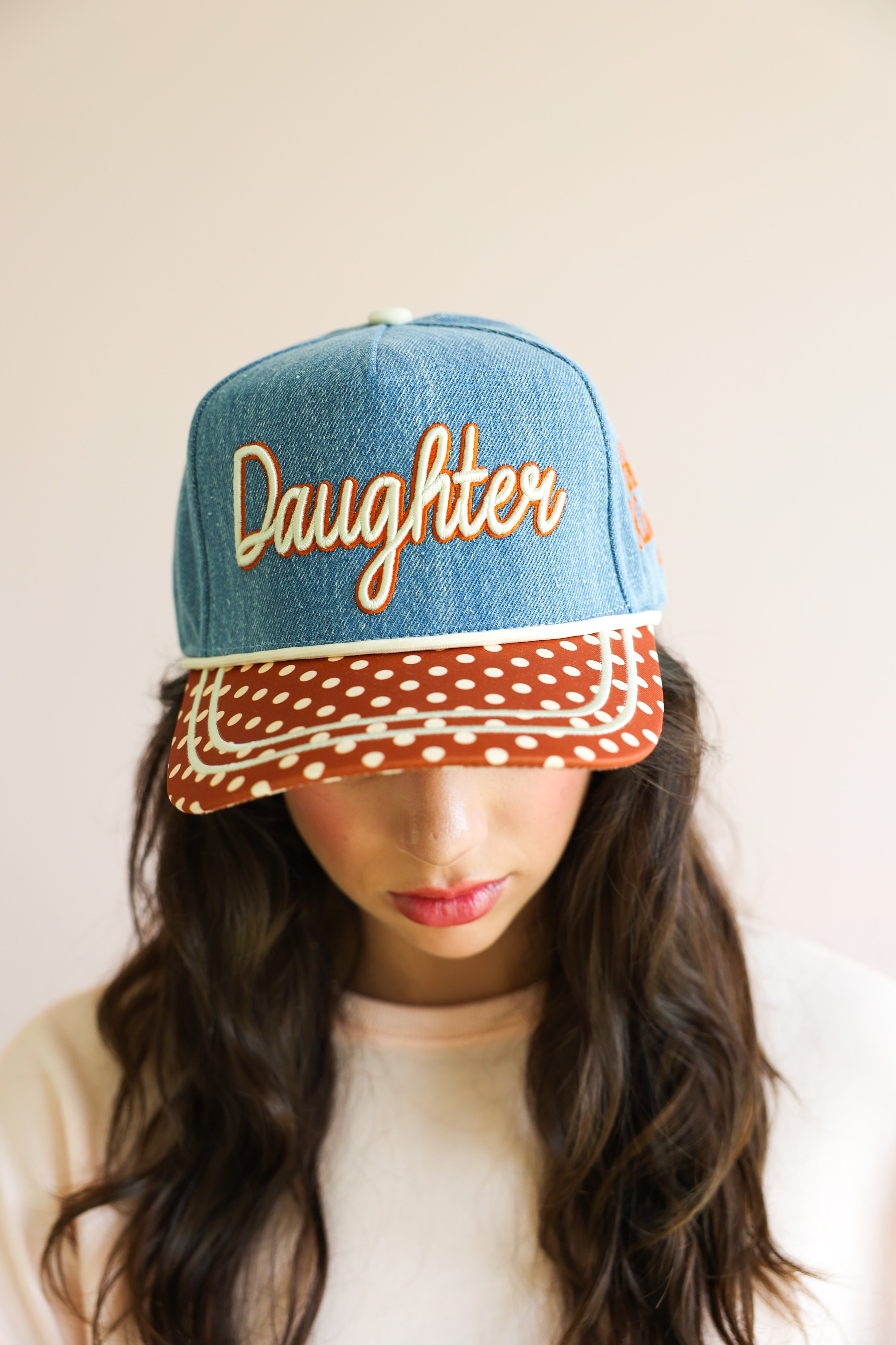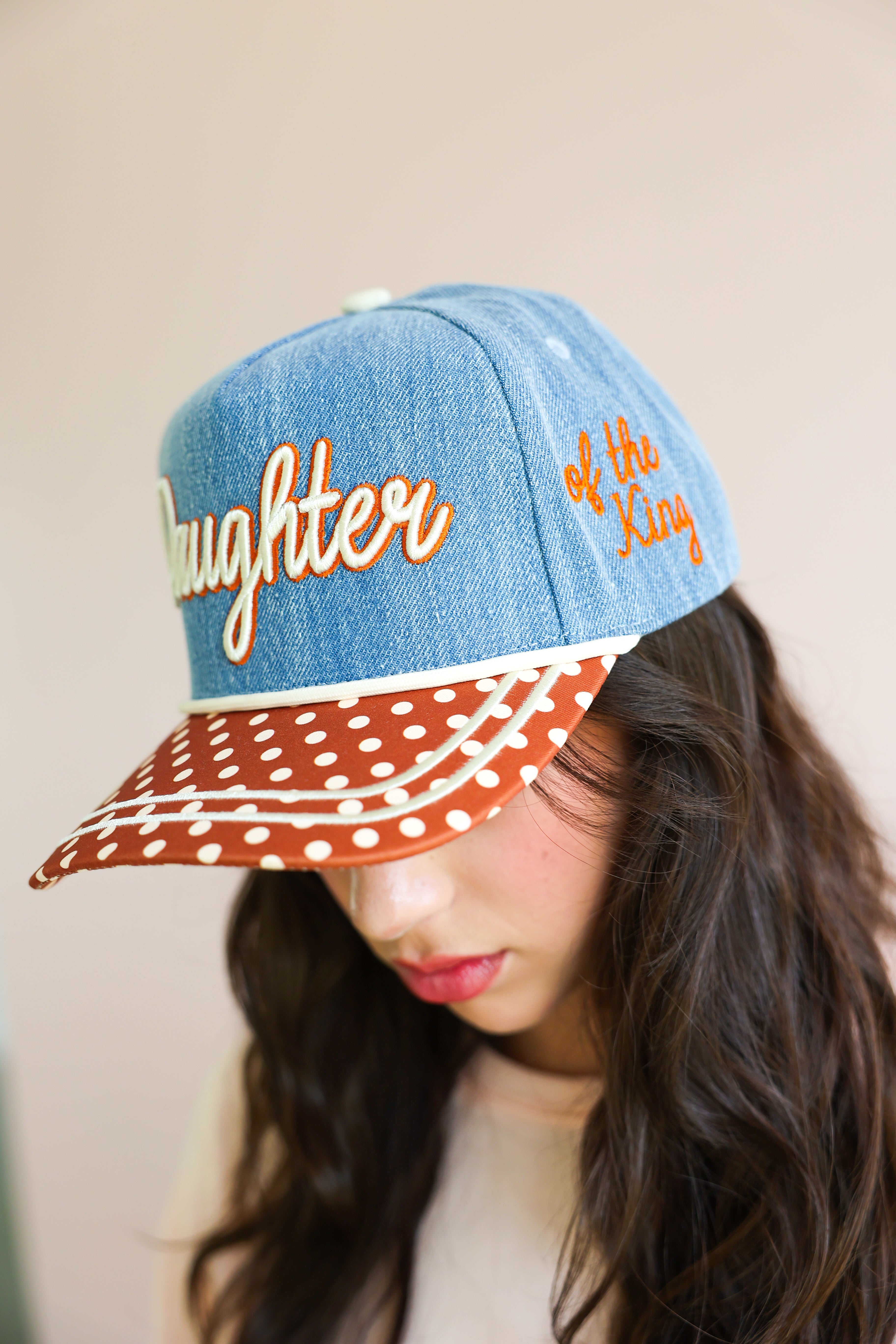 This elevated everyday cap features a soft denim crown with beautifully embroidered script reading “Daughter,” paired with a contrasting polka dot brim for a playful yet chic touch. The side detail, “of the King,” completes the message with a subtle but powerful reminder of your worth and purpose.