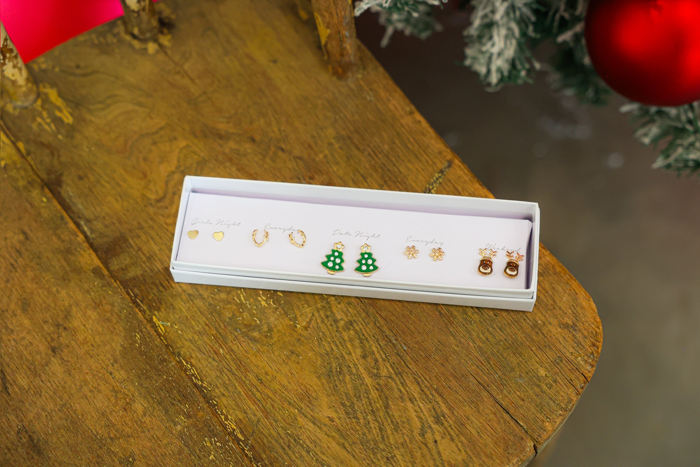 Celebrate the season with this festive five-piece earring collection. Mix and match holiday-inspired designs featuring elegant diamond studs, shimmering pearl studs, a charming Christmas tree, a playful stocking, and eye-catching red Christmas light studs. Perfect for rotating through holiday parties, family gatherings, or everyday festive flair. Each pair offers versatile styling options, whether you're dressing up for special occasions or adding a touch of seasonal cheer to casual looks. This complete set makes an ideal gift for earring lovers who appreciate variety and holiday spirit.