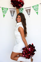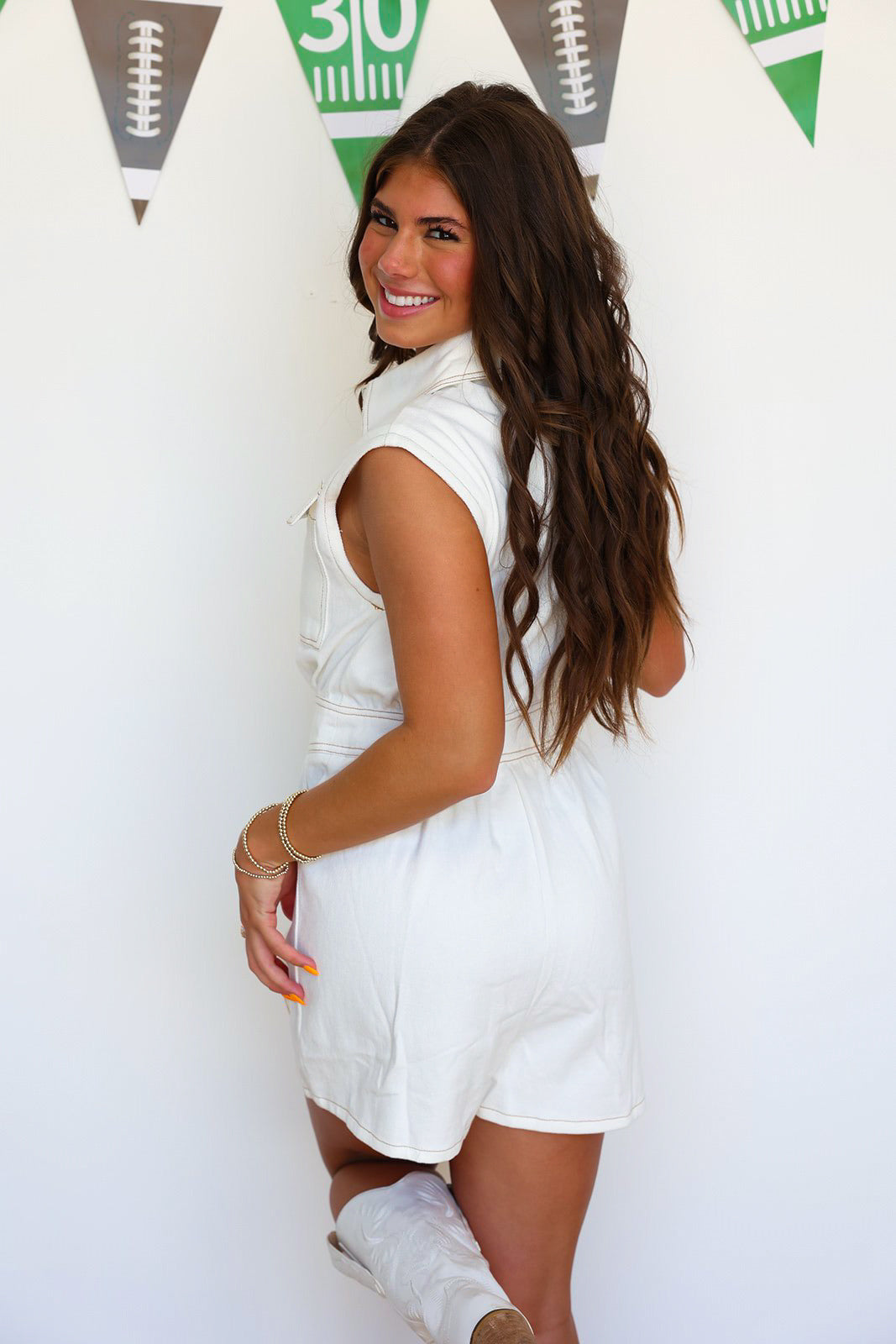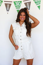 Elevate your summer wardrobe with this sleeveless denim romper featuring a chic collar and button-down front. The cinched waist flatters your silhouette, while convenient pockets add practicality without sacrificing style. Perfect for effortless, all-day comfort and a polished look.