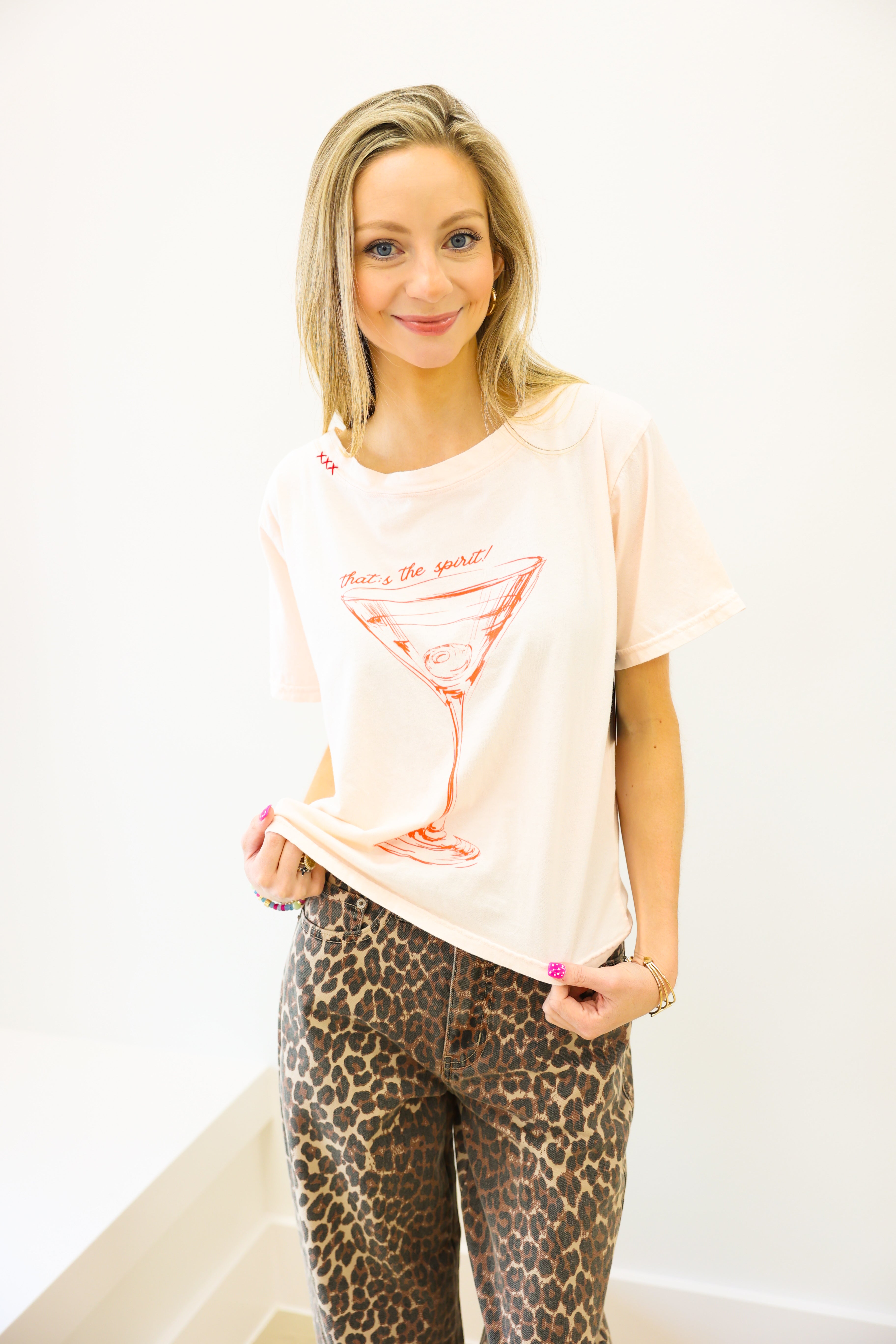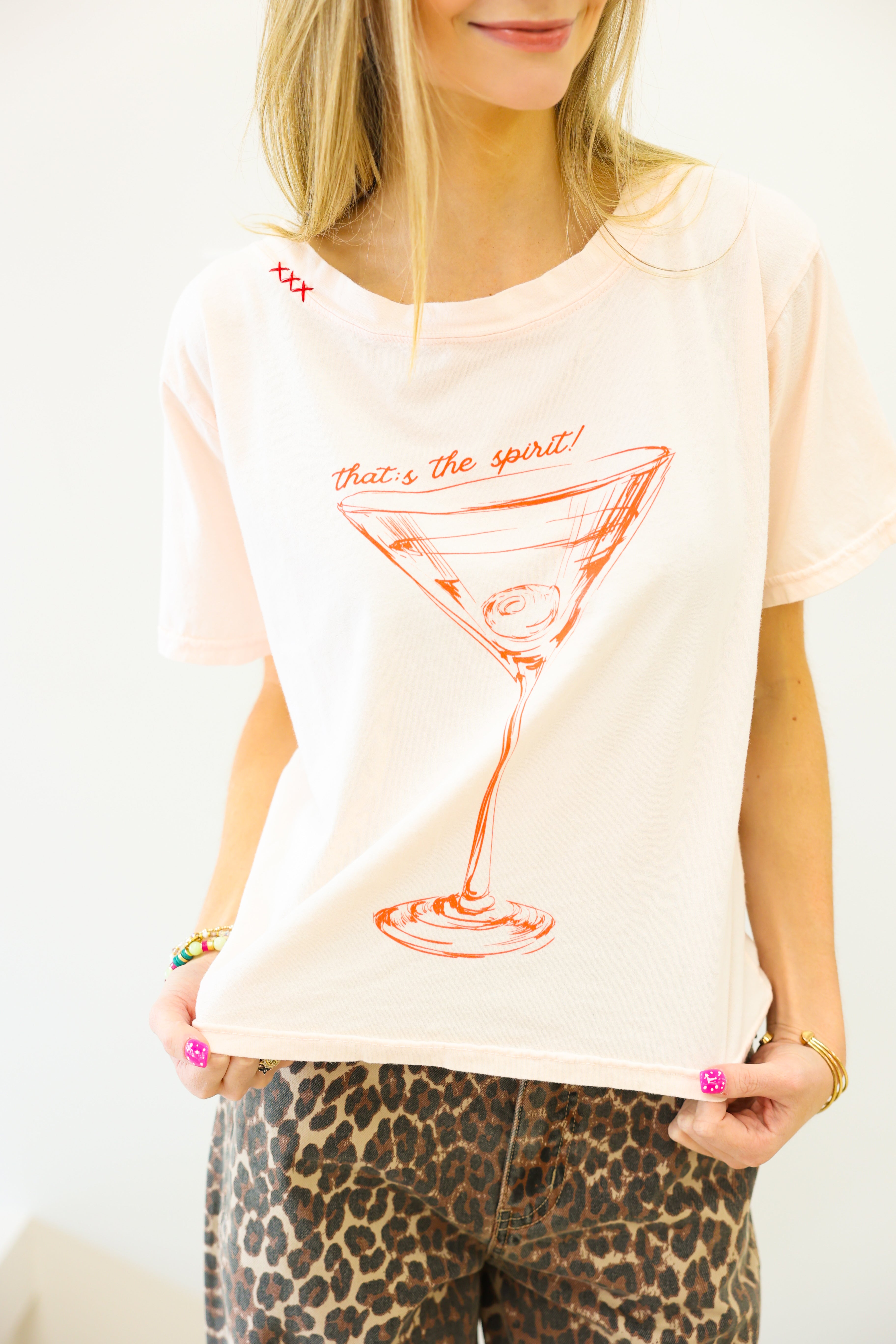 Introducing the That's the Spirit Wide Neck Tee! In pinky peach with a playful martini glass design, this tee is perfect for GNO or happy hour. With unique stitching details on the neckline, it's fun and flirty, adding an extra touch of style to your wardrobe. Cheers to that!