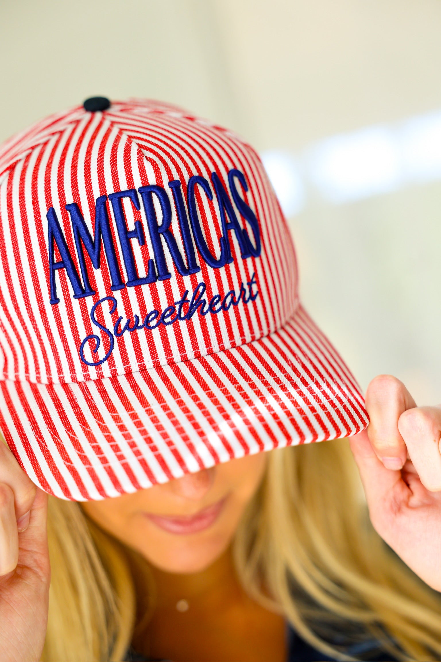 The America’s Sweetheart Striped Trucker Hat combines classic stripes with an easy, everyday silhouette. Lightweight and breathable, it’s a go-to accessory for errands, game days, and casual outings.