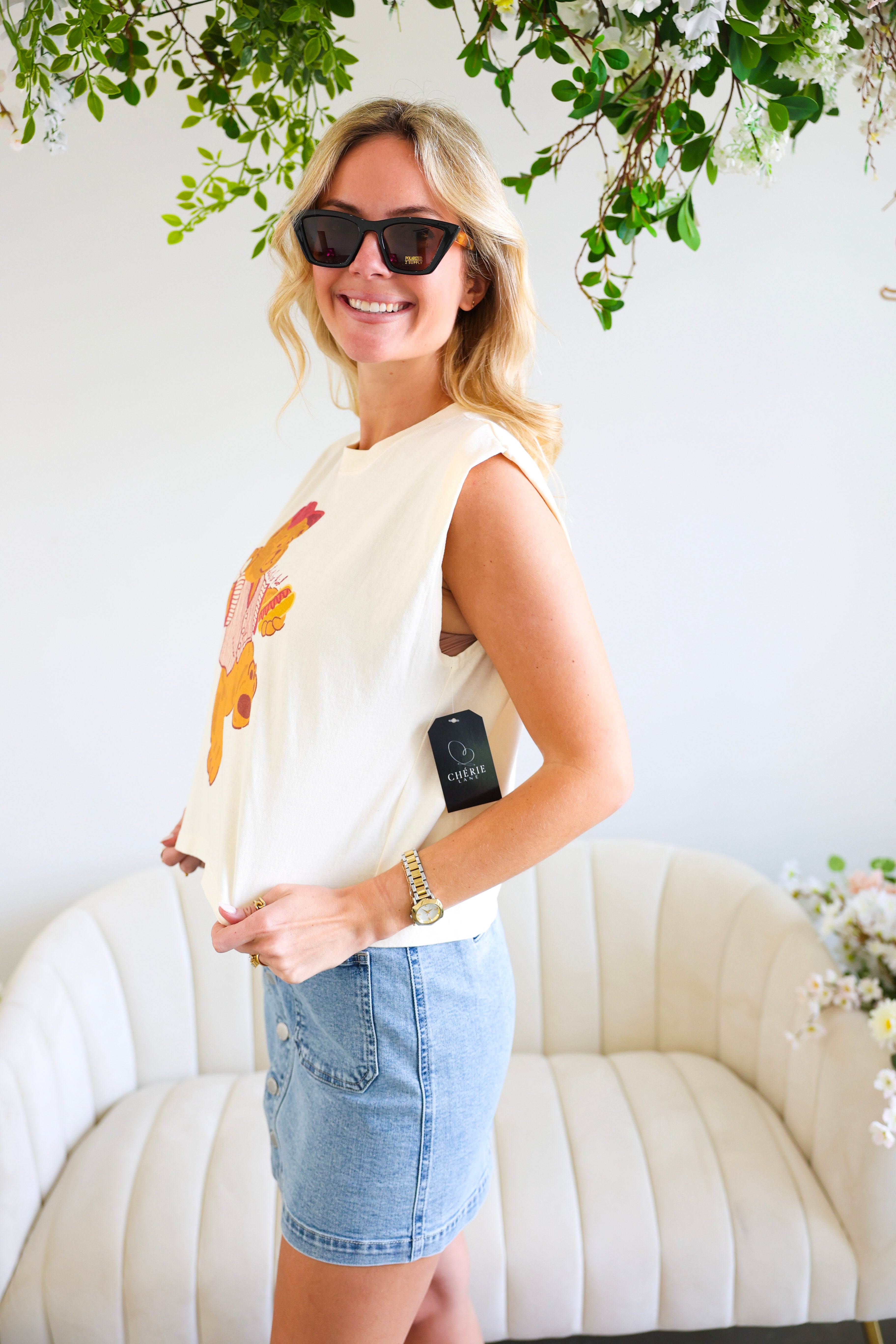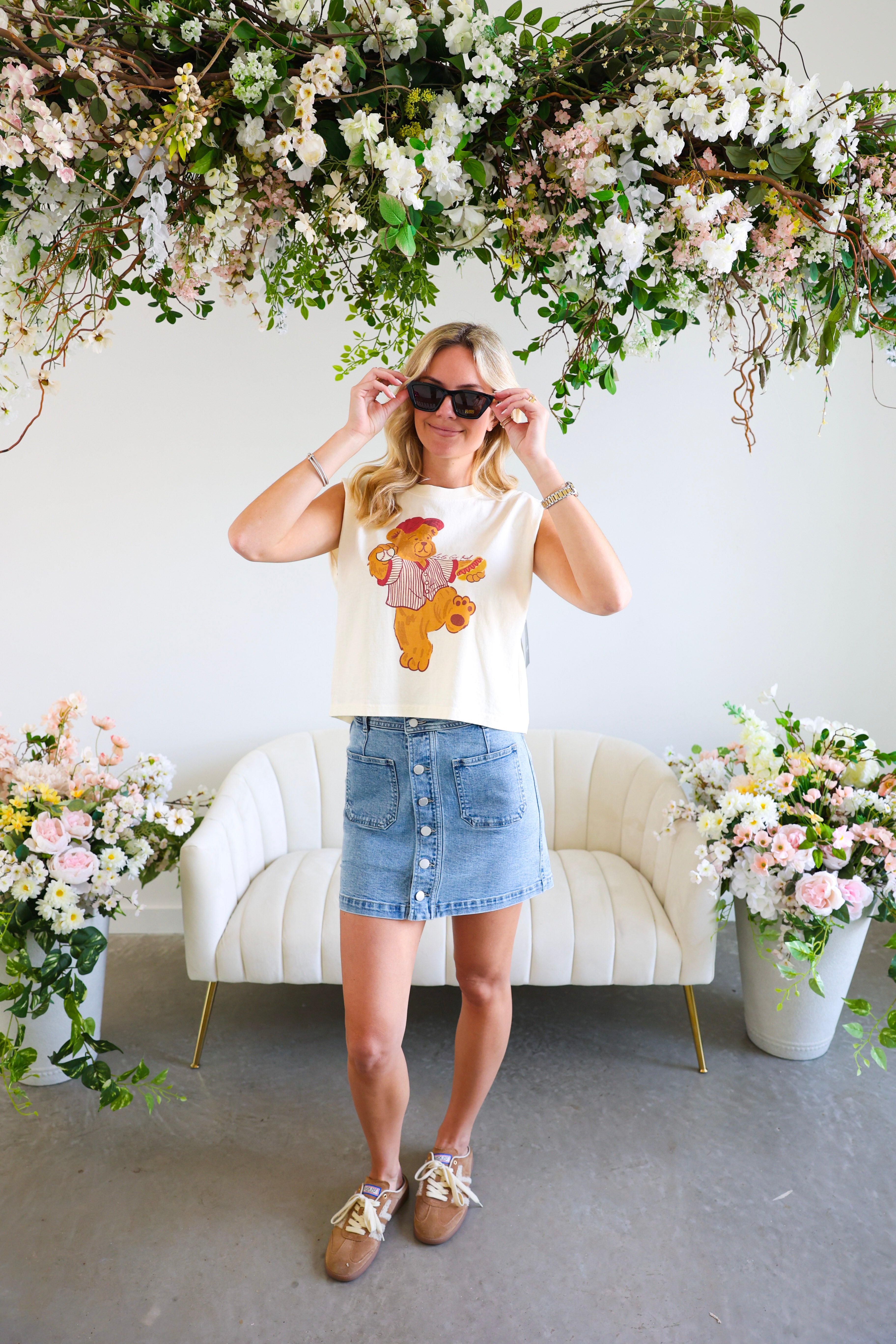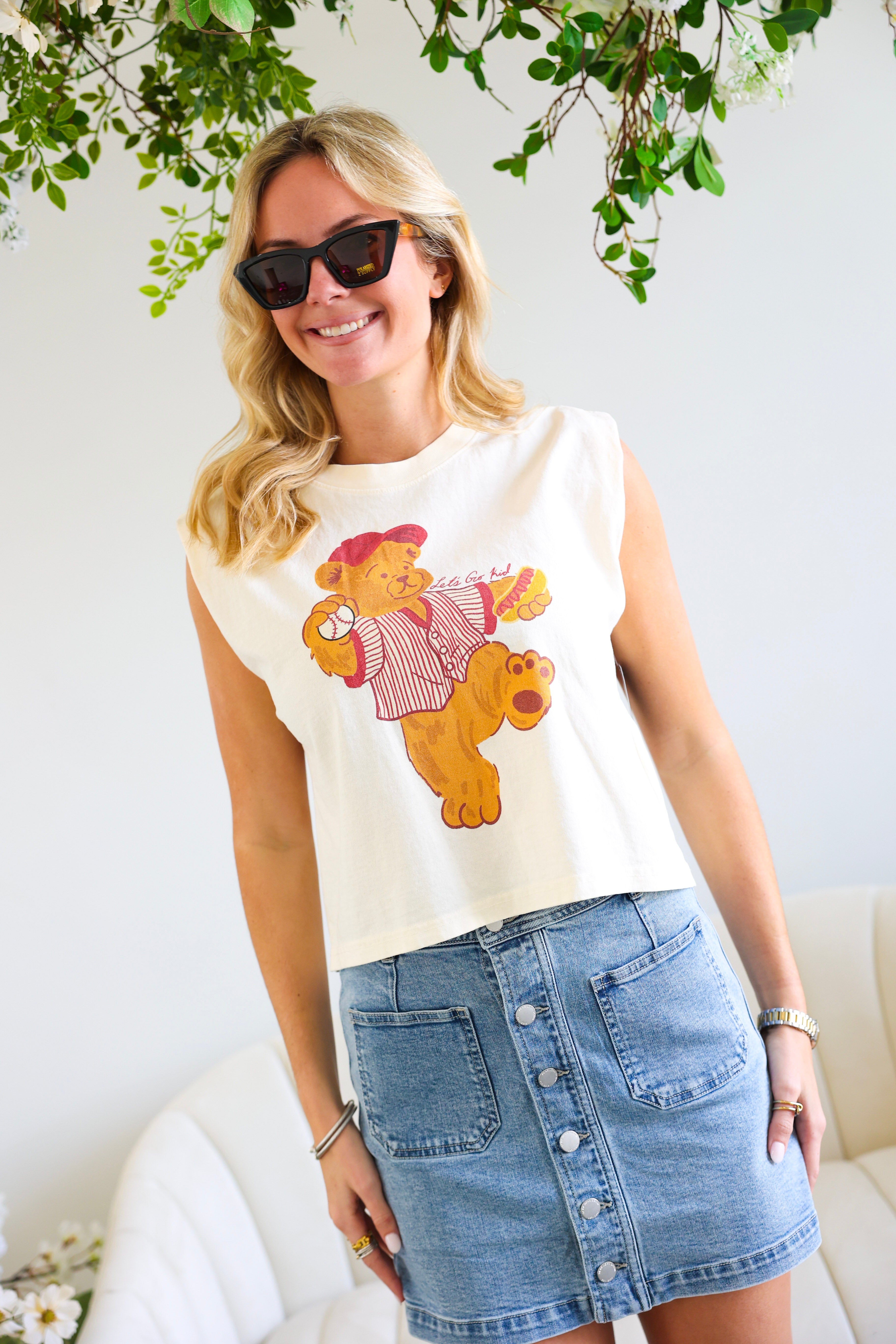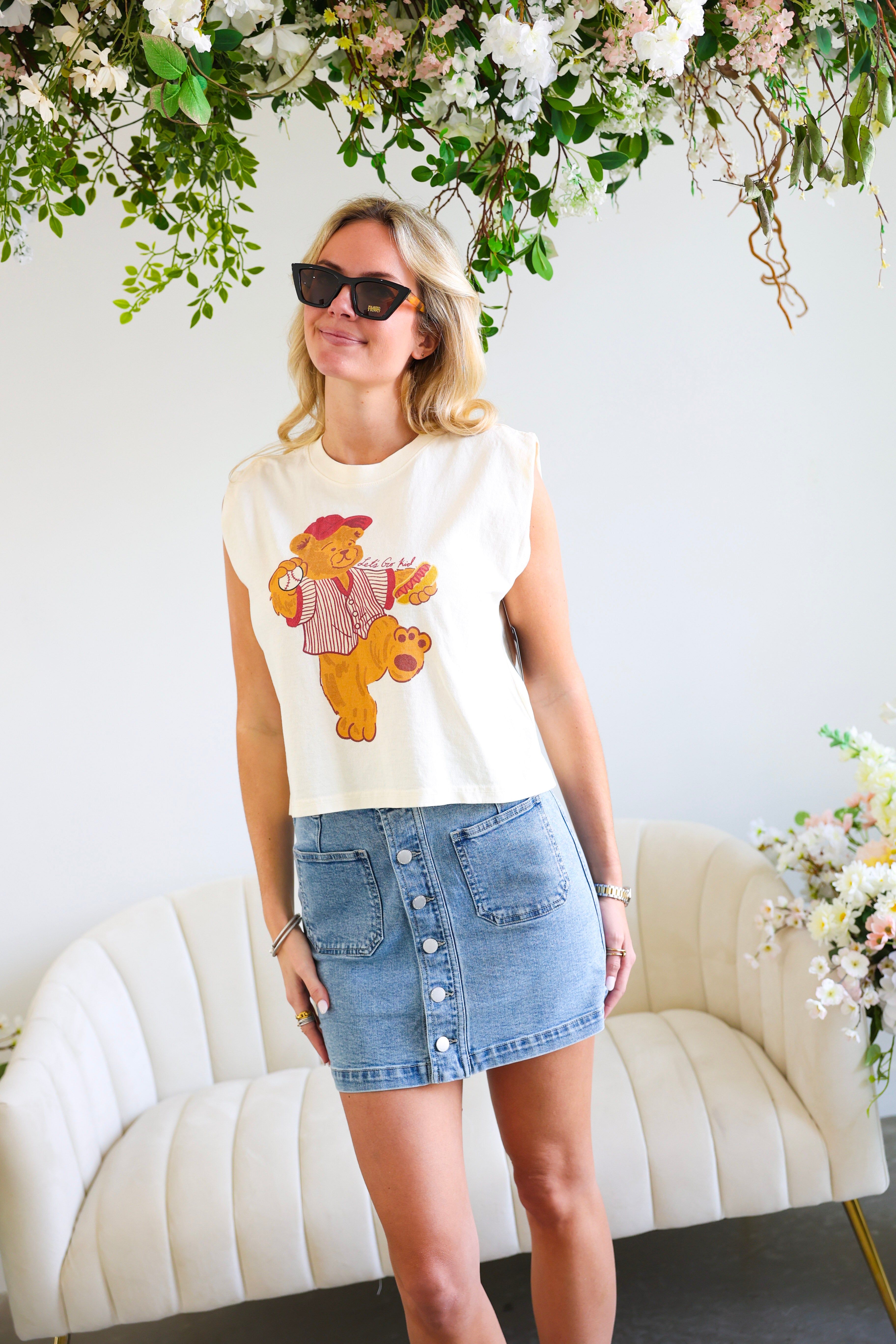 Style with denim shorts, sneakers, and a baseball cap for the ultimate laid-back look.