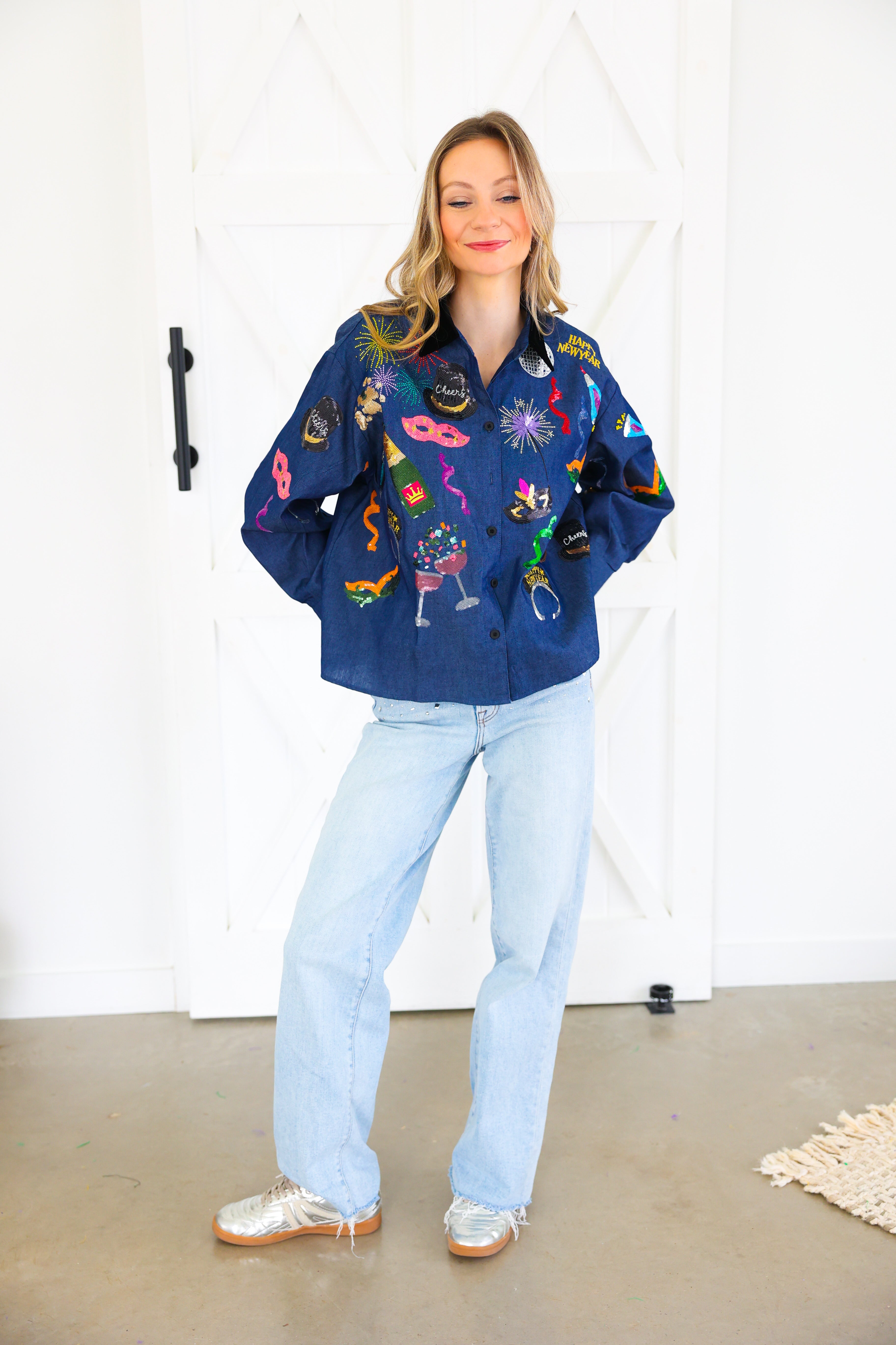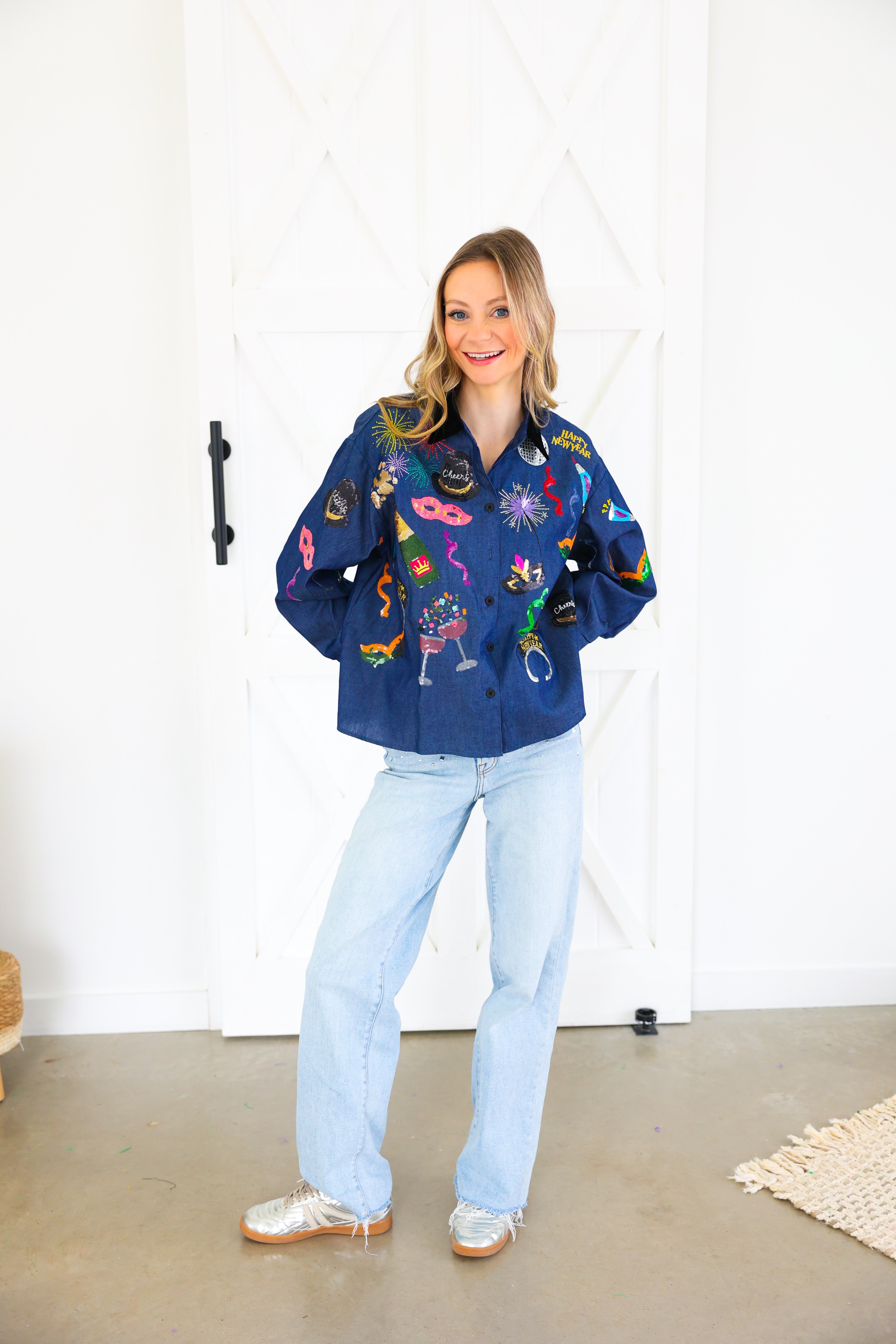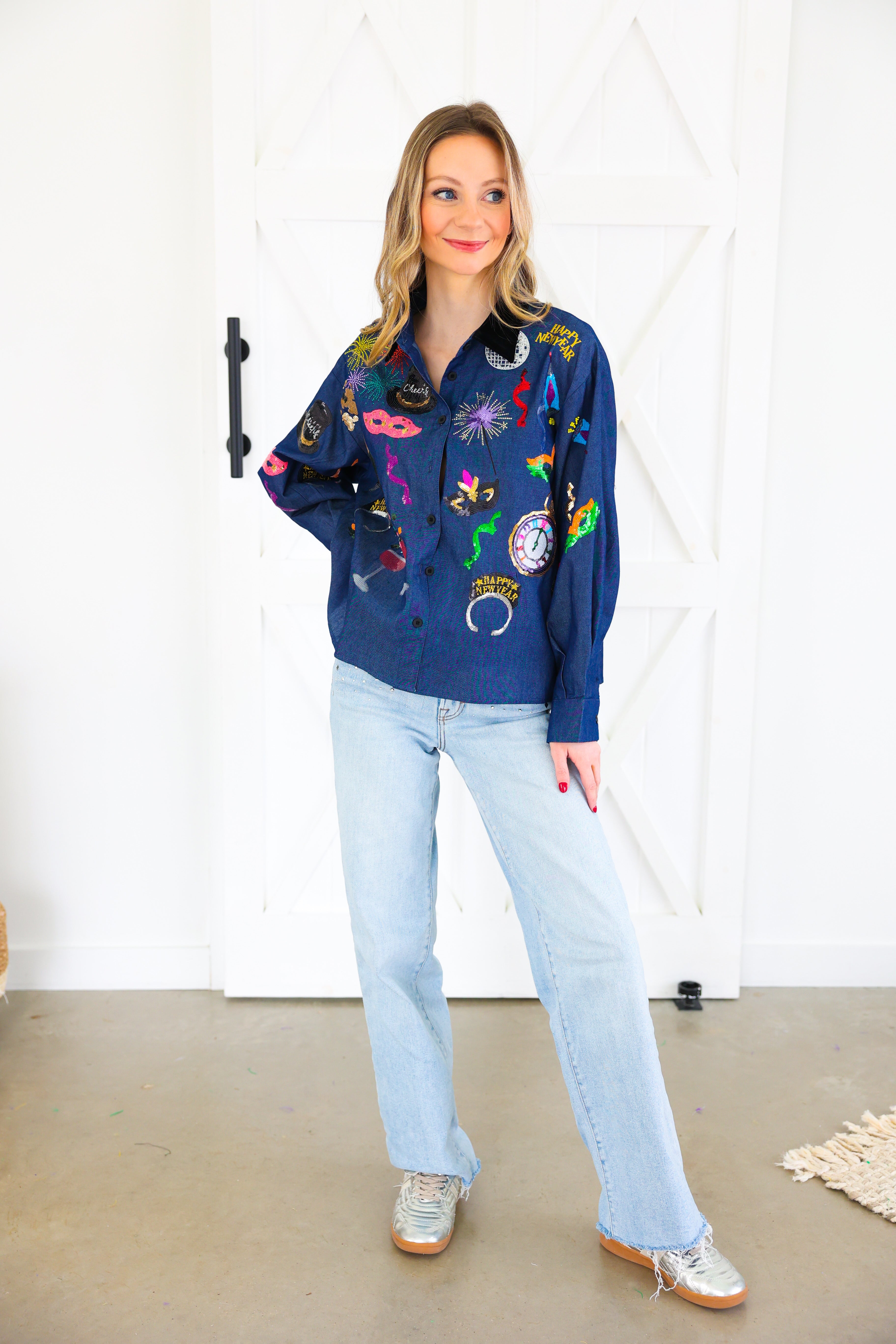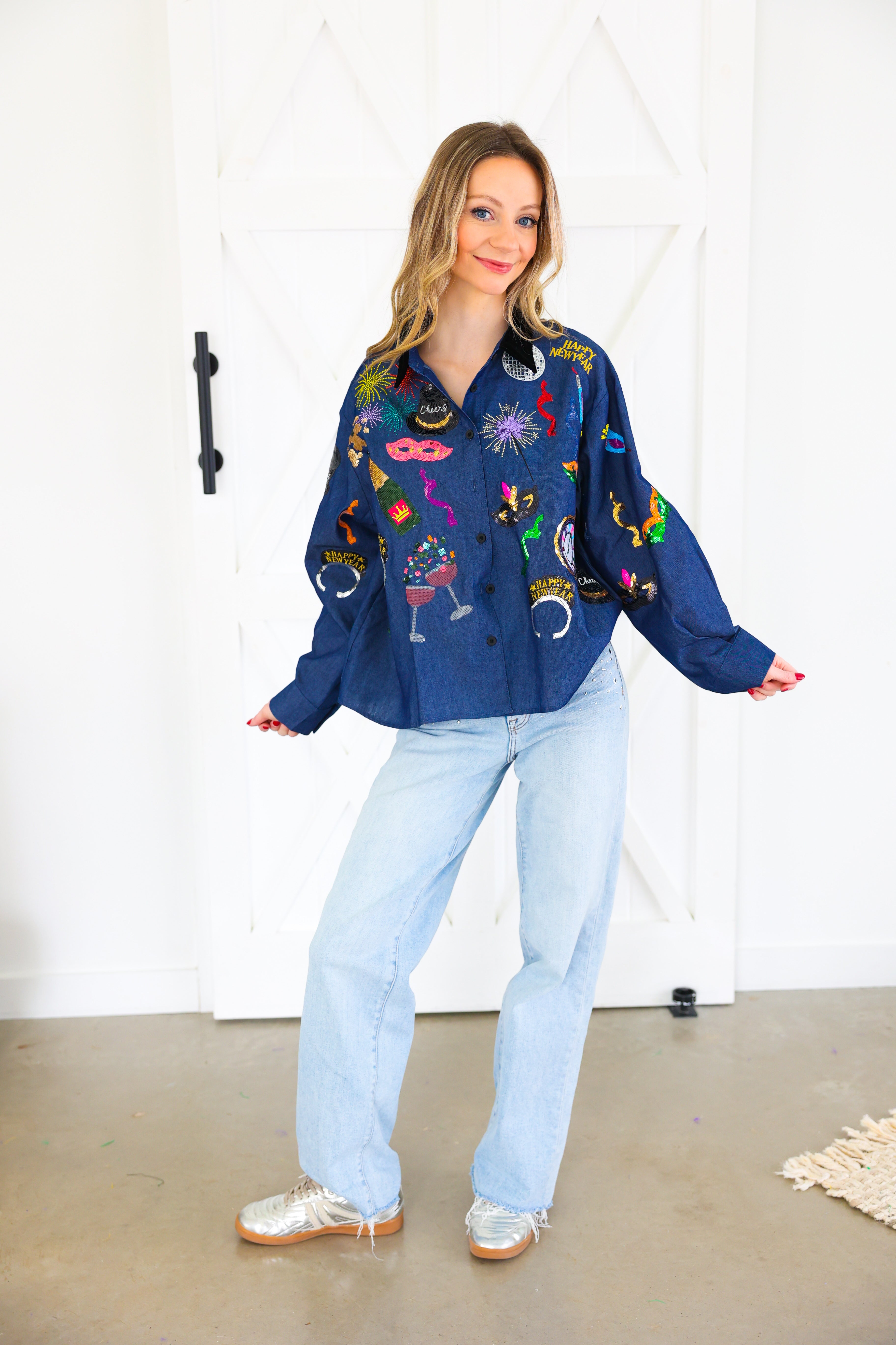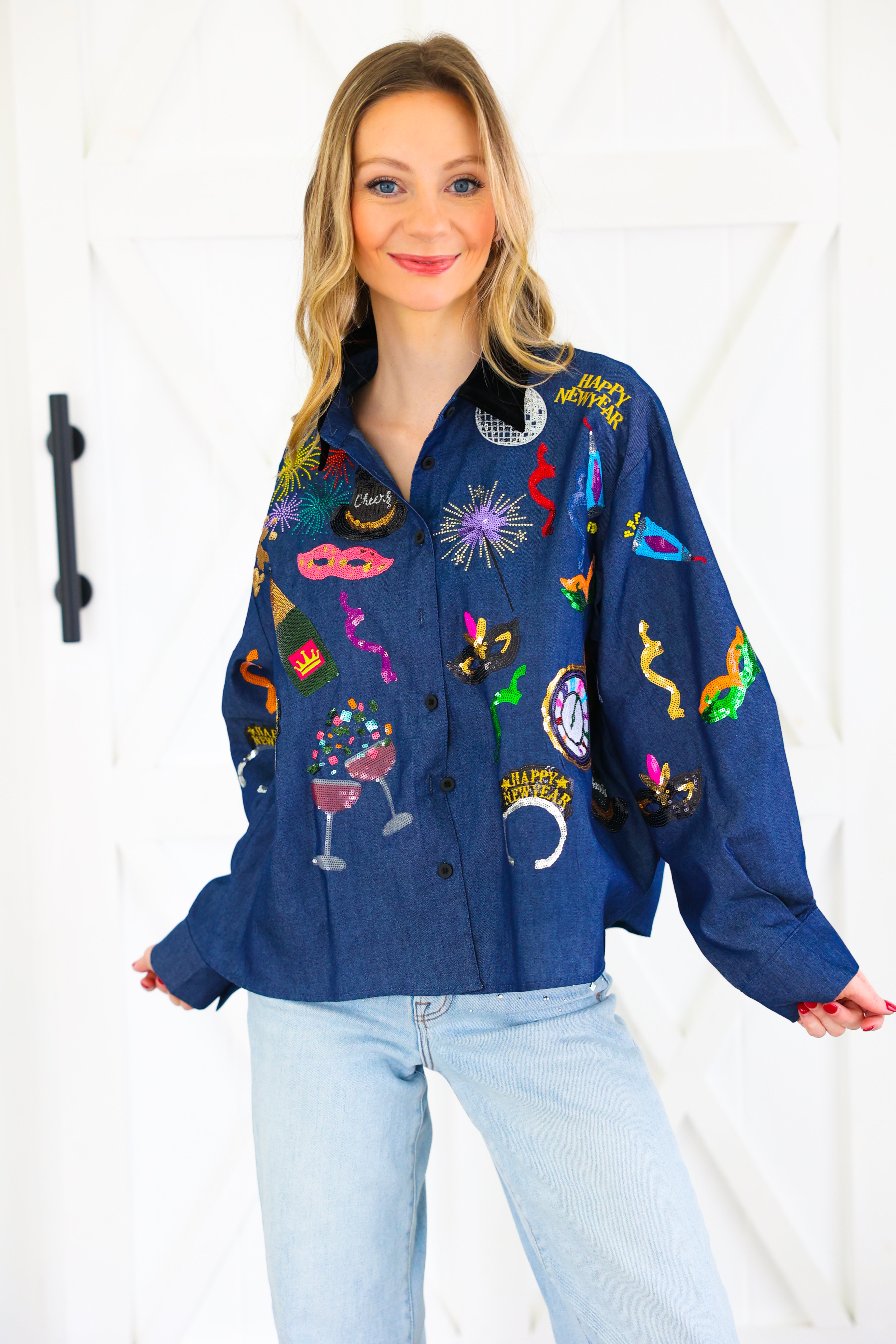 Celebrate in standout sparkle with this Denim NYE Icon Button Up Top by Queen of Sparkles — the perfect festive blouse for your New Year’s Eve outfit, holiday parties, and winter celebrations! 🥂✨