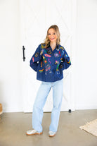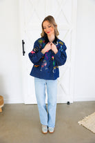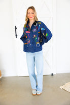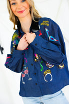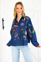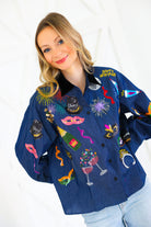 This denim button-down is covered in playful NYE icons — champagne bottles, cocktails, sparkles, clocks, confetti, party hats, masquerade masks, and more — each embellished with sequins and beads for major shine. Paired with a luxe black velvet collar, this top brings the perfect mix of glam + chic. 🪩💖