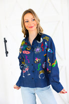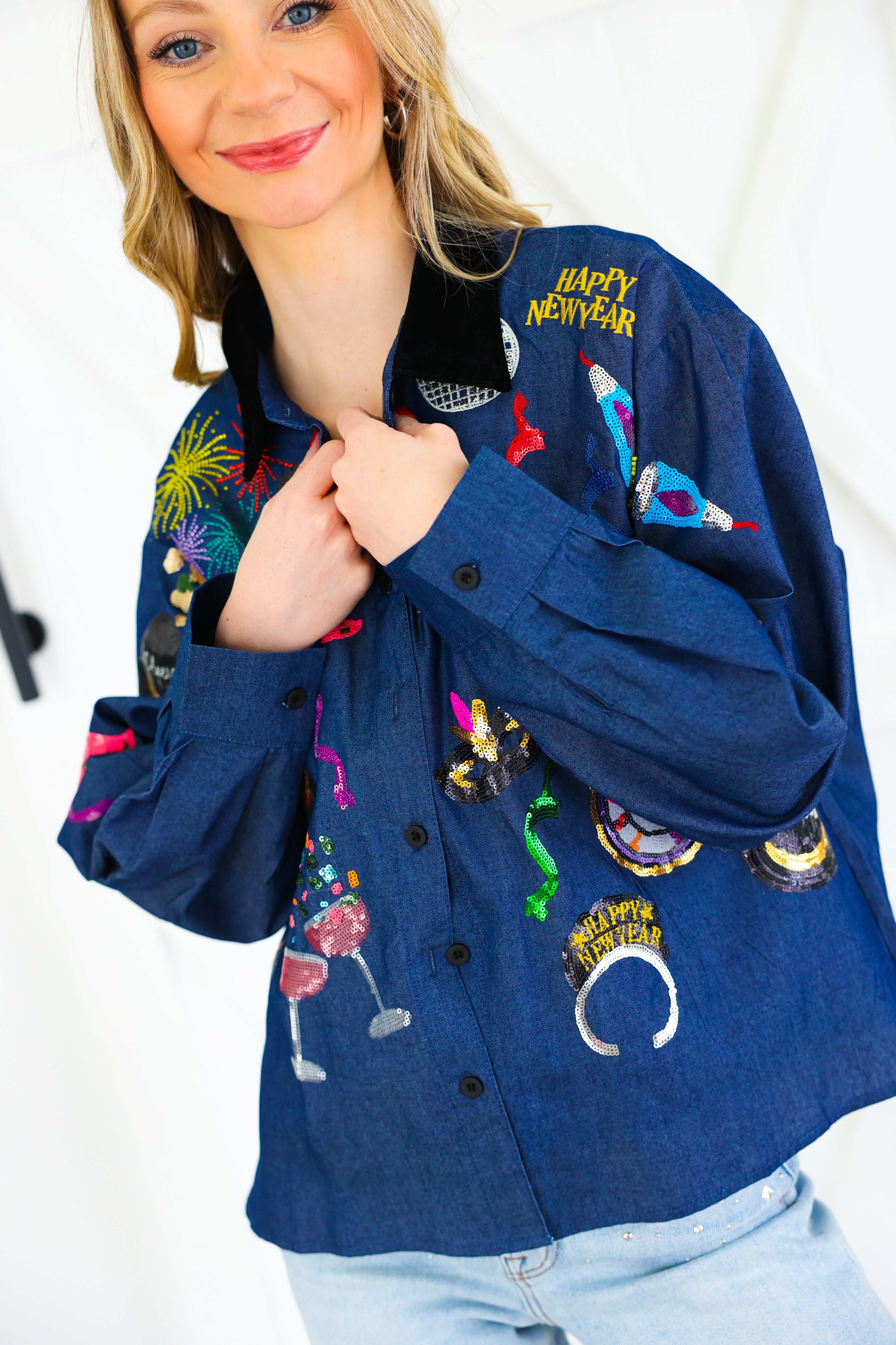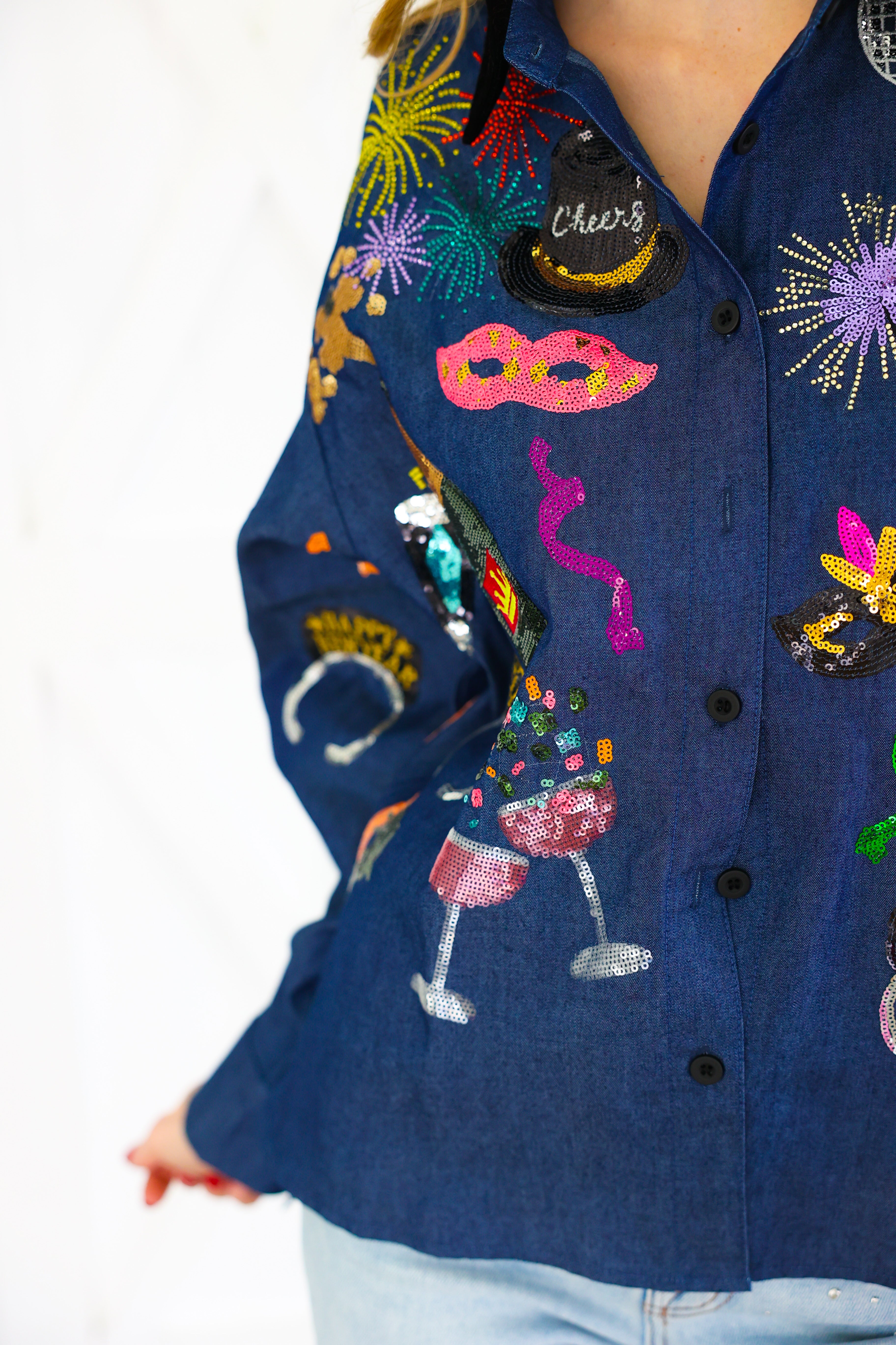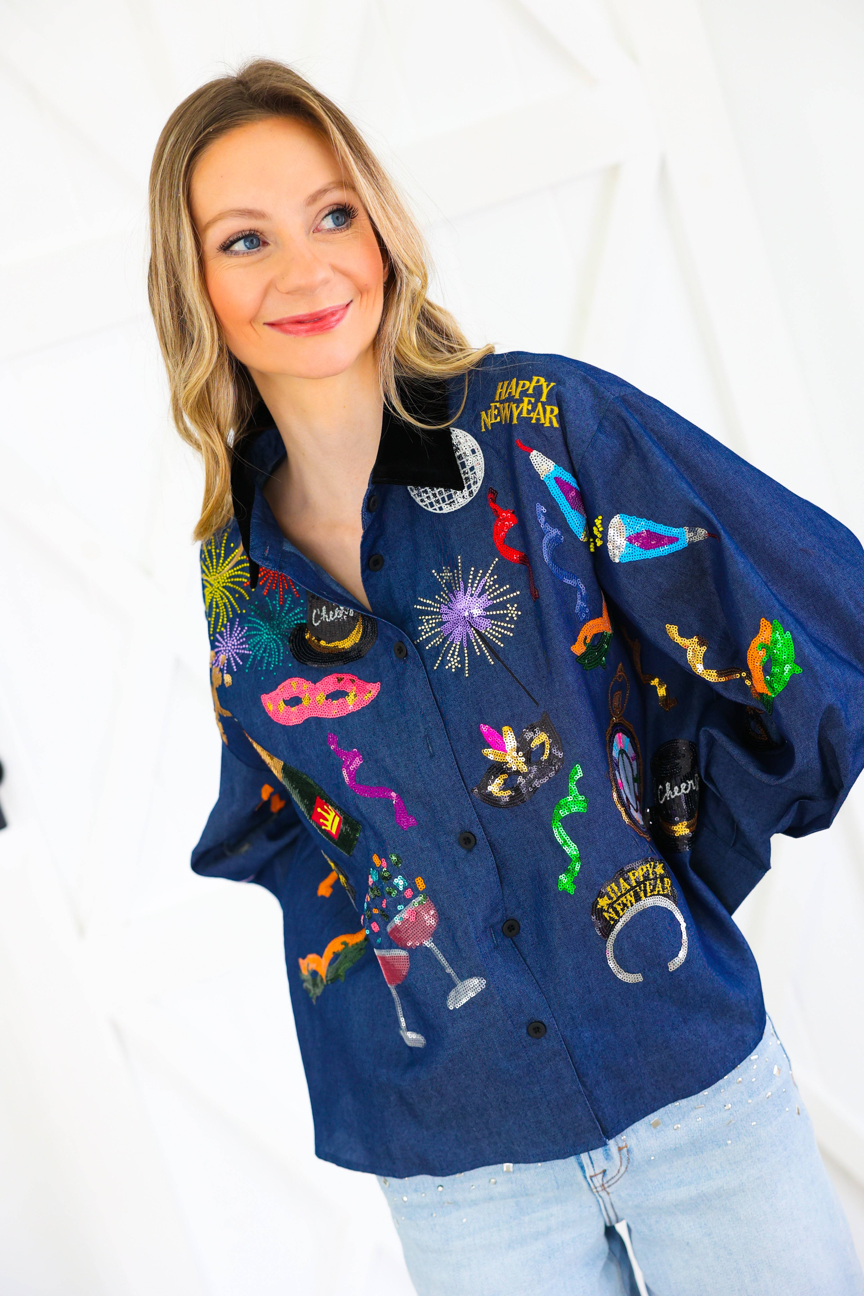 • Denim button-up with sequin + beaded NYE icons 🎆🍾