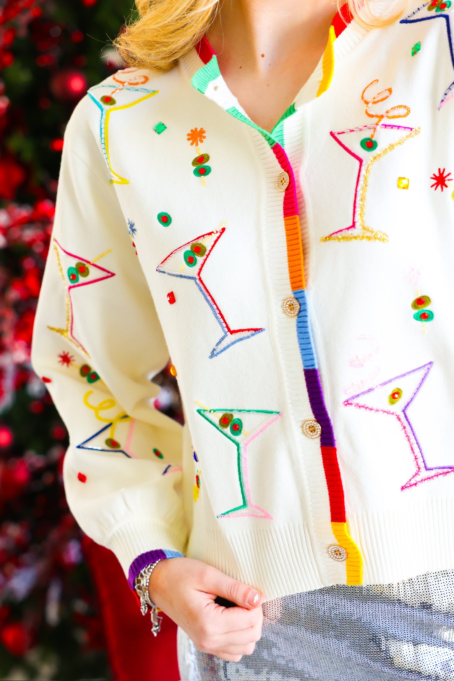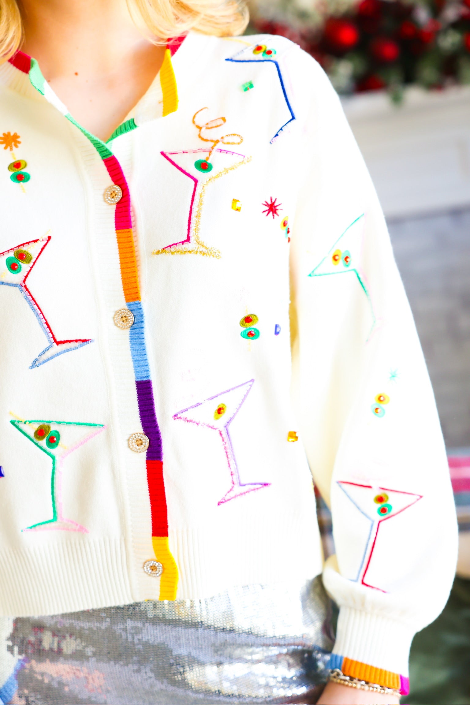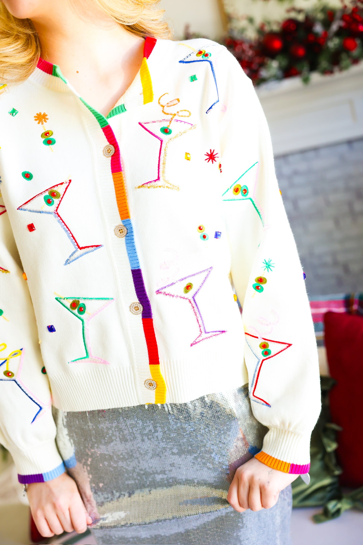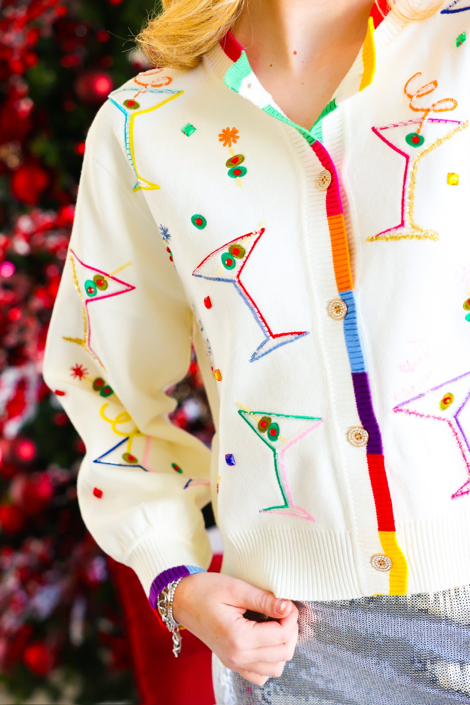 White Multi Cosmo & Martini Button Up Cardigan With Rainbow Trim Queen of Sparkles