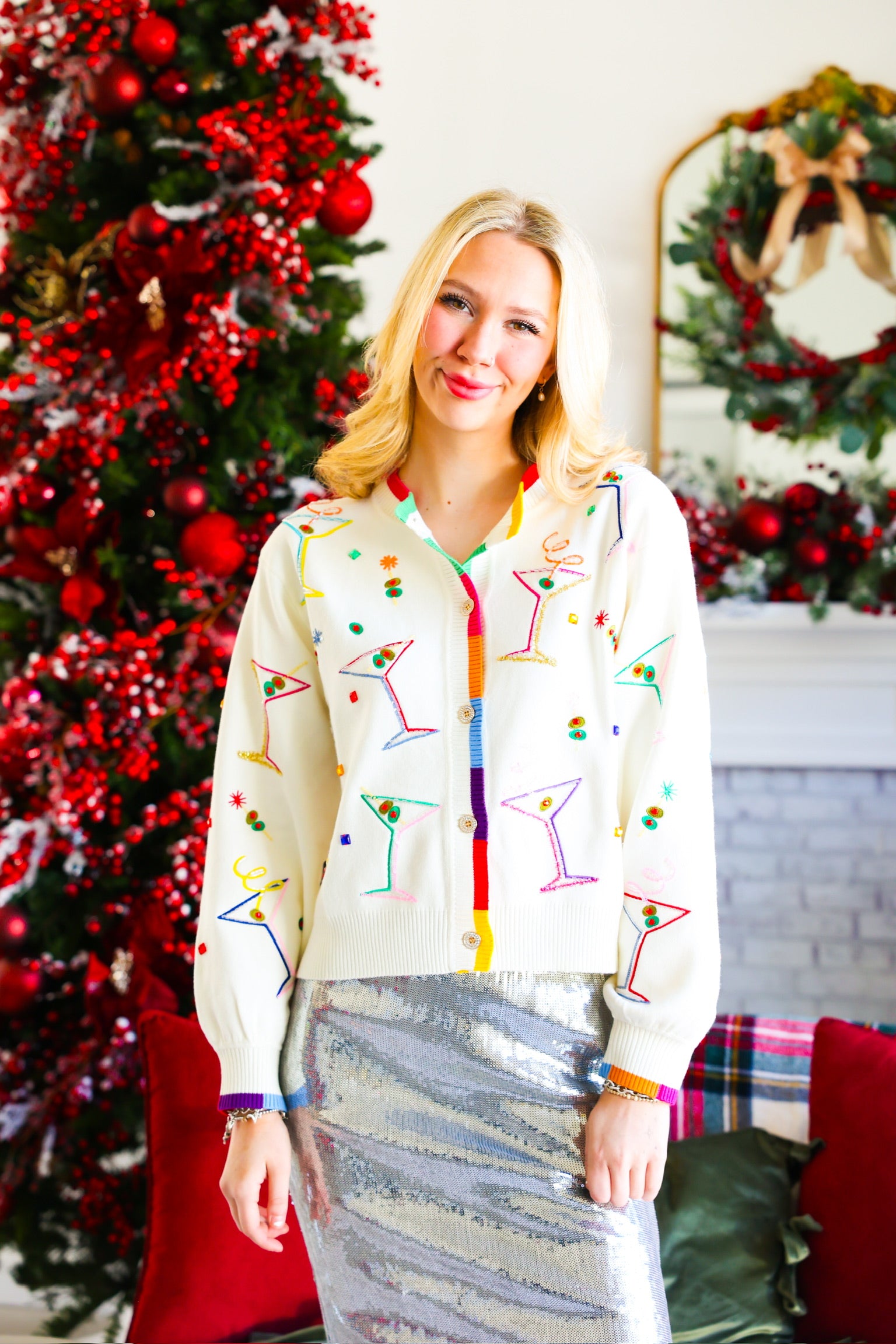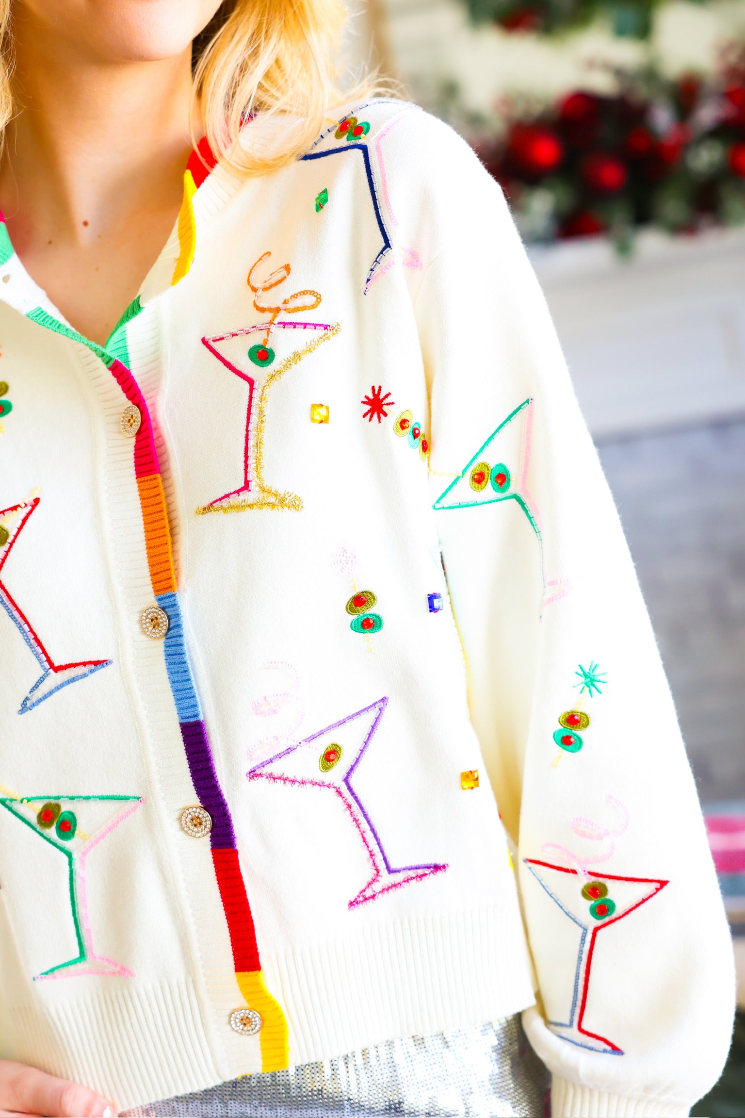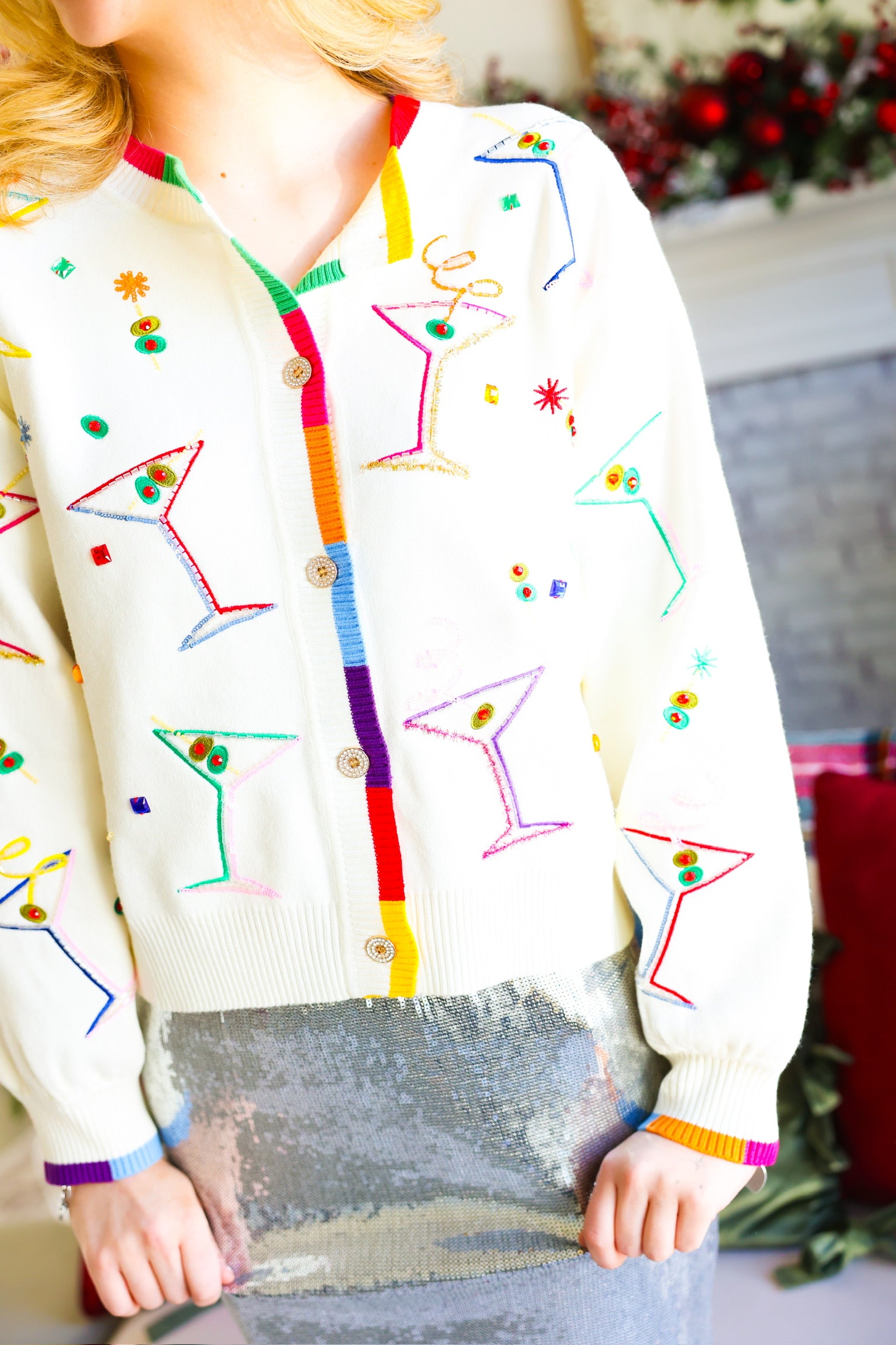 White Multi Cosmo & Martini Button Up Cardigan With Rainbow Trim Queen of Sparkles