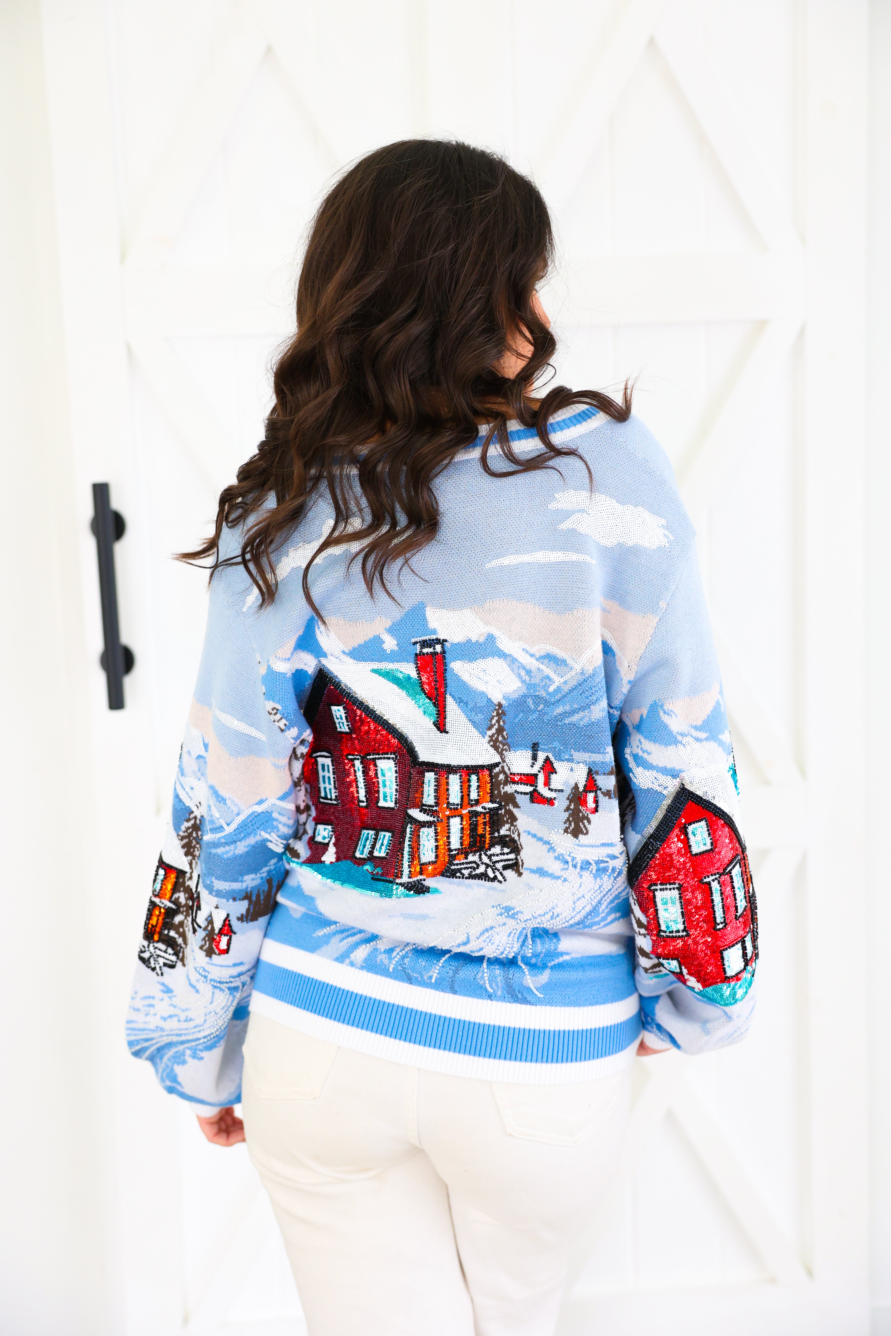 Blue & White Snowy Town Scene Button Up Cardigan Queen of Sparkles