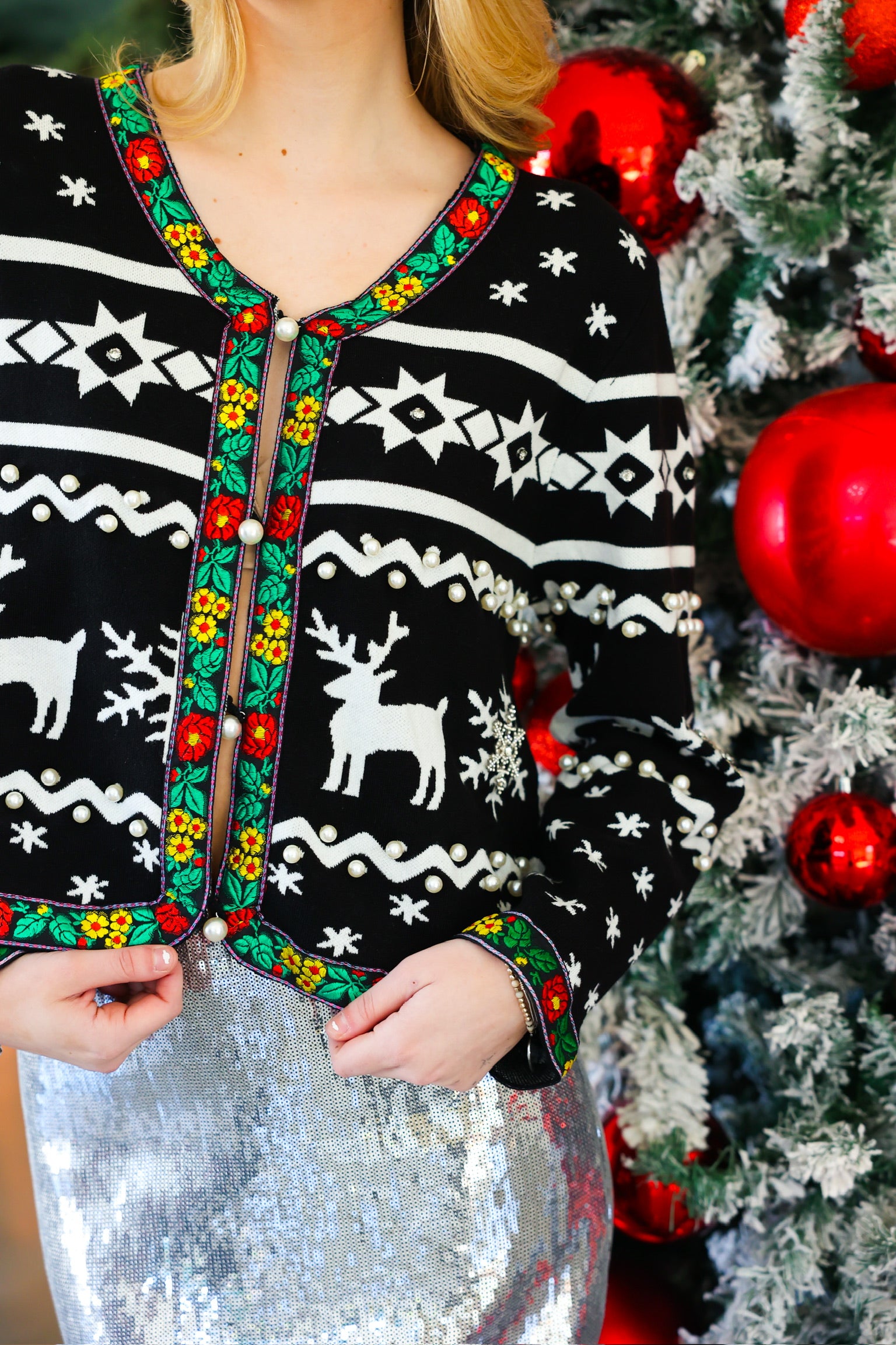 Black & White Nordic Flower Trim Reindeer Pearl Button Up Cardigan Queen of Sparkles