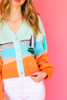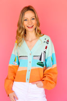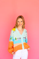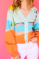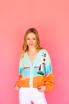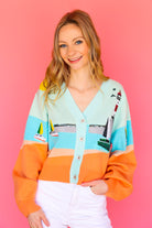 Upgrade your spring wardrobe with our Queen of Sparkle Multi Sail & Light House Button Up Cardigan! This must-have cardigan features beautiful tan, pale blue, and tangerine orange hues, along with sparkling sequined light houses and sailboats. Add a touch of whimsy and shine to your outfits with this unique and stylish piece!