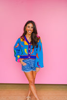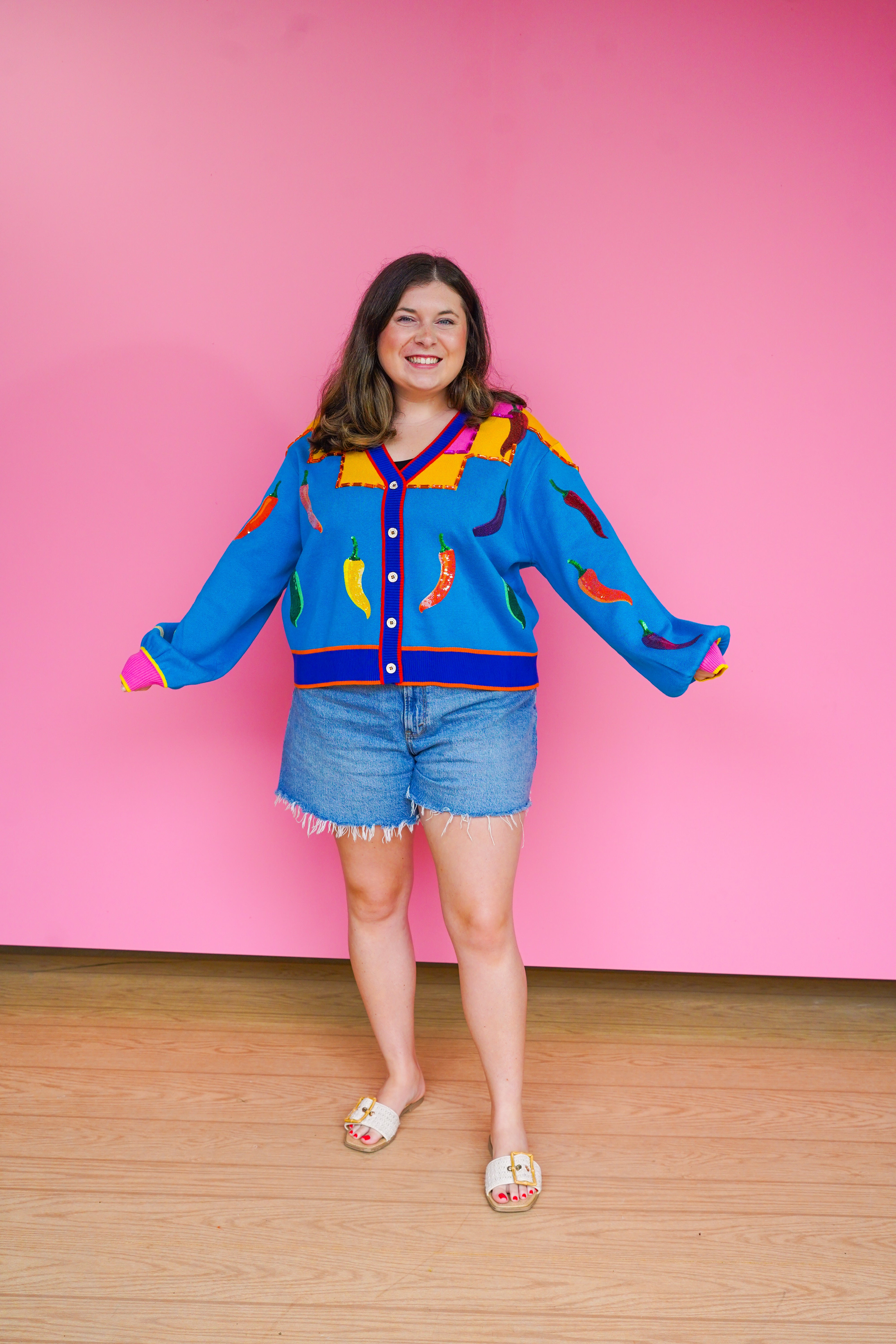 Elevate your style with the Royal Blue Multi Chili Pepper Cardigan Queen of Sparkles. Perfect for celebrating Cinco de Mayo, this cardigan adds a touch of playfulness and flair to any outfit. Stand out in a sea of plain cardigans and be the queen of sparkles with this unique and eye-catching piece!