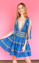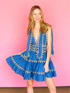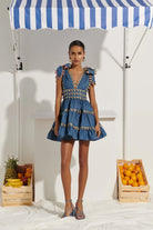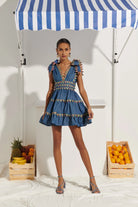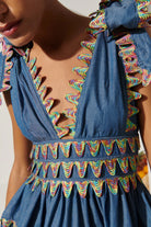 Flirty and full of flair, the Cheli Dress is a denim mini with serious impact. Designed with a plunging neckline, bold ruffle trim, and embroidered details in yellows, greens and oranges, it’s a perfect blend of sweet and statement. The tiered skirt gives it that playful, swishable volume you’ll want to dance in.