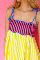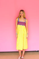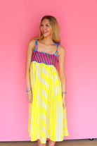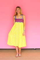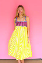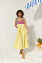 Bright, breezy, and made to move, the Lola Dress pairs a fitted, candy-striped bodice with a flowing yellow skirt in crisp cotton. Playful tie straps and an open back add an effortless charm that feels right at home under the sun.