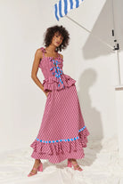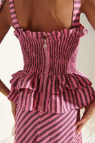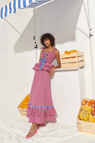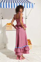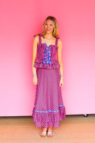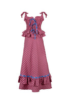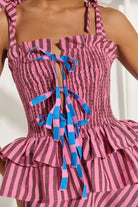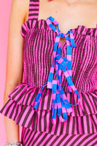 Turn heads in the Sofía Dress, a vibrant showstopper crafted in bold fuchsia and dark purple stripes with playful pops of electric blue. The smocked bodice flatters your figure while the double-tiered ruffle waist adds volume and flair. Finished with contrast bows and a sweeping hemline, it’s designed to move with you from day to night.