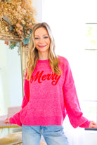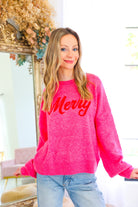 The “Merry” Sweater is your go-to look for instant holiday cheer. Made from a cozy, soft knit, this cheery pink pullover features festive red script that spells out “Merry” in joyful style. With its relaxed fit and classic crew neckline, it’s perfect for everything from gift wrapping to clinking glasses at your next holiday happy hour. Pair it with a plaid mini or sparkly accessories for a look that’s equal parts sweet and spirited.