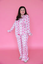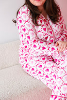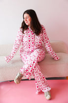 Get ready to feel the love with our pink hearts pajama top! With a button down design and comfortable collar, you'll be sure to have a cozy and stylish sleep. Don't forget to pair it with our matching pants for a complete and adorable pajama set.