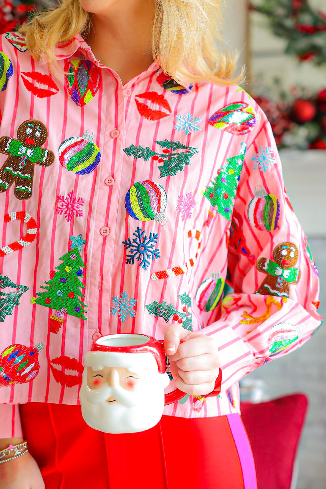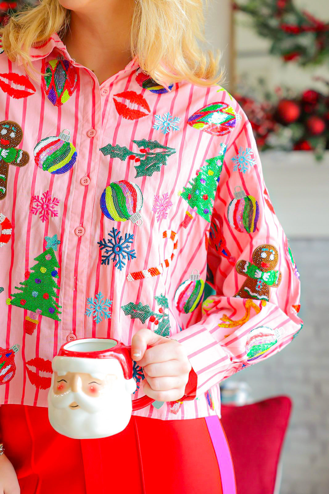 Light Pink & Red Stripe Christmas Icons Button Up Top Queen of Sparkles