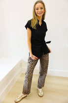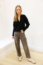 Make a statement in the print of the season. The Westward in Cool Cat is a high rise jean with a trending barrel leg silhouette and a tan and black cheetah inspired print. Featuring a cinched waist, bowed leg, and slightly tapered ankle.