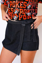 A fresh twist on a classic, this wrapped denim skort features a braided waist tie that adds just the right touch of texture and shape. The wrap-style front gives it a skirt-like flow, while the built-in shorts keep it comfortable and functional. Pair it with the matching jacket (ILT4164-2, sold separately) for a coordinated denim moment or style it solo with a crisp tee for everyday cool.