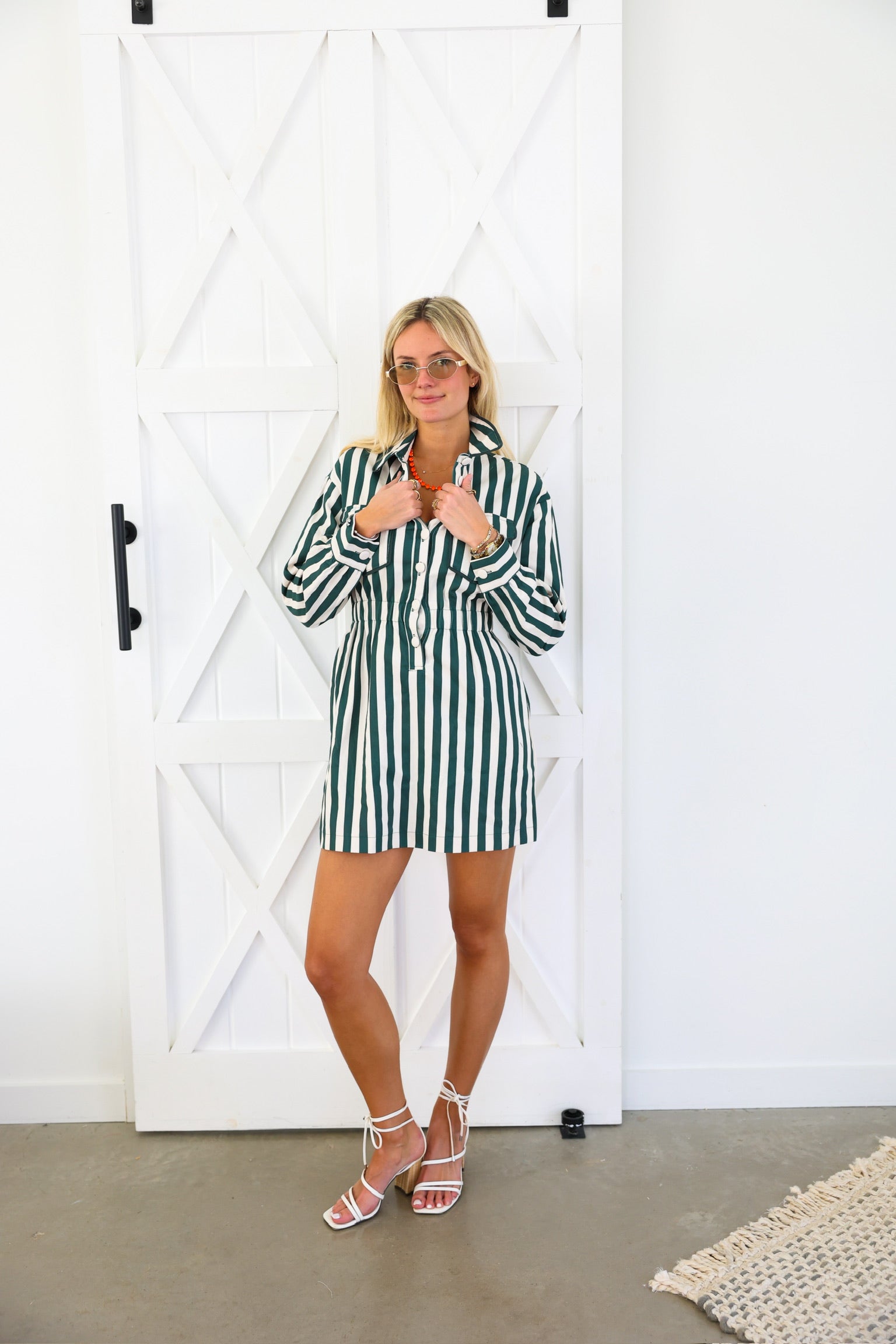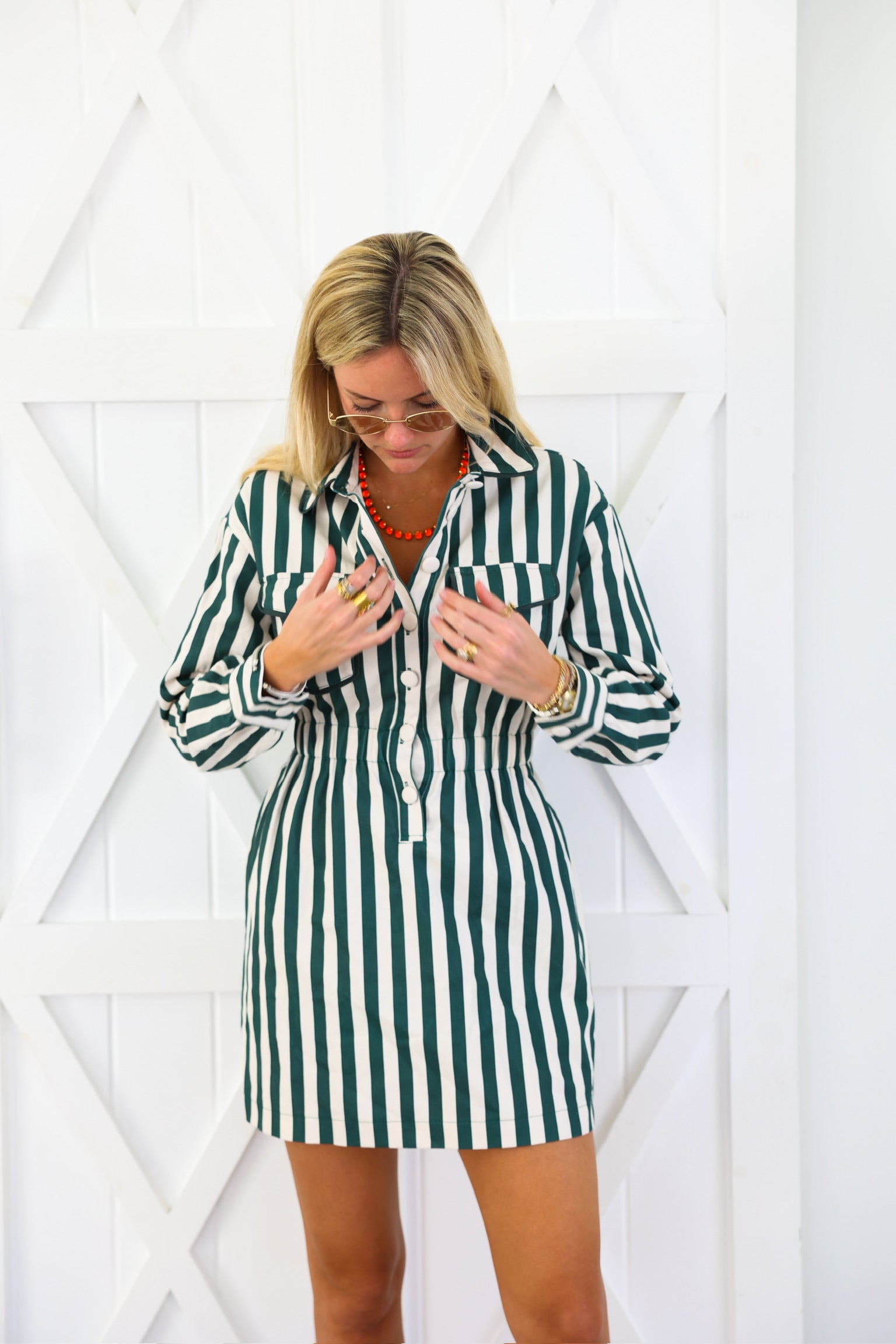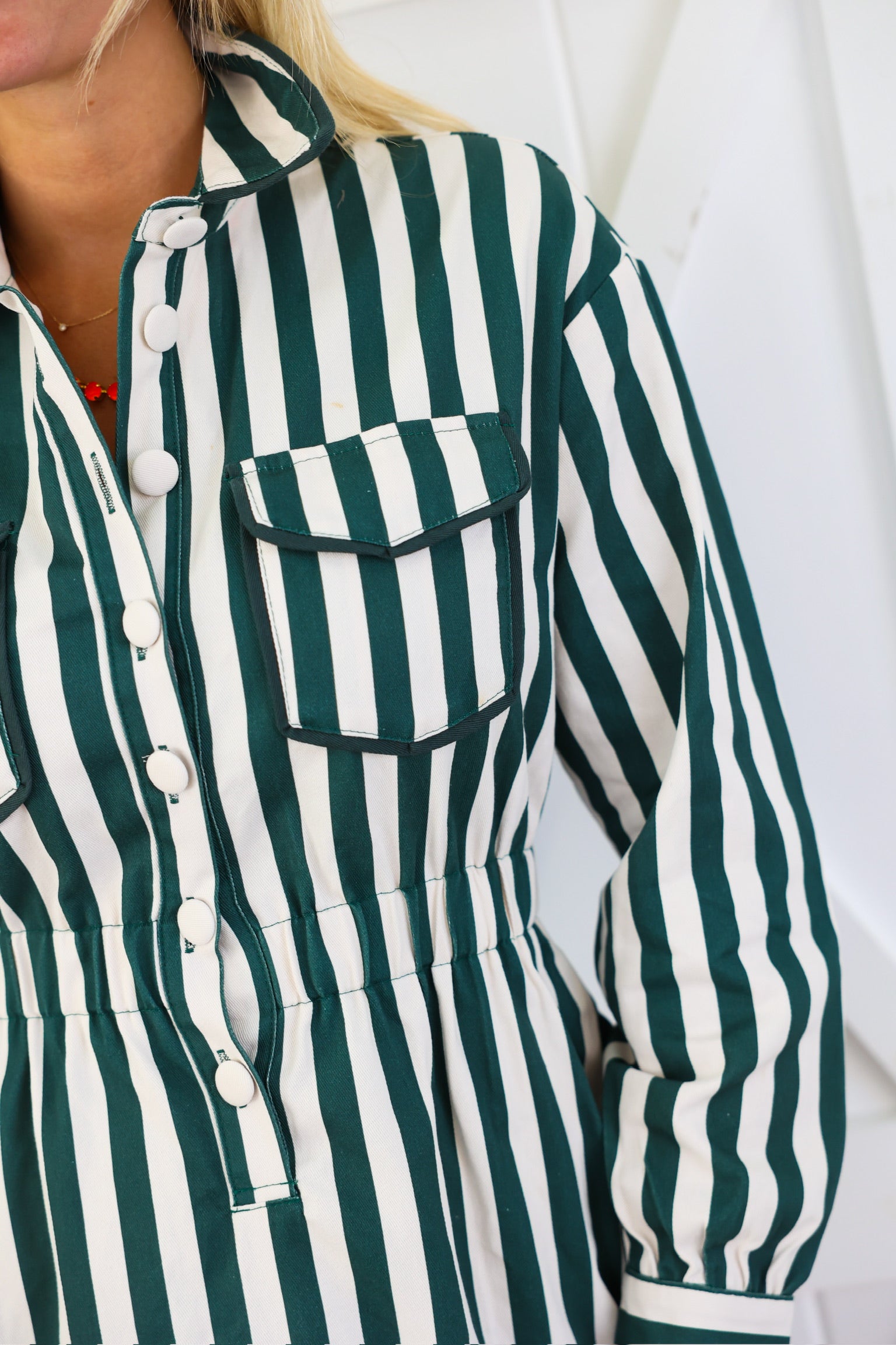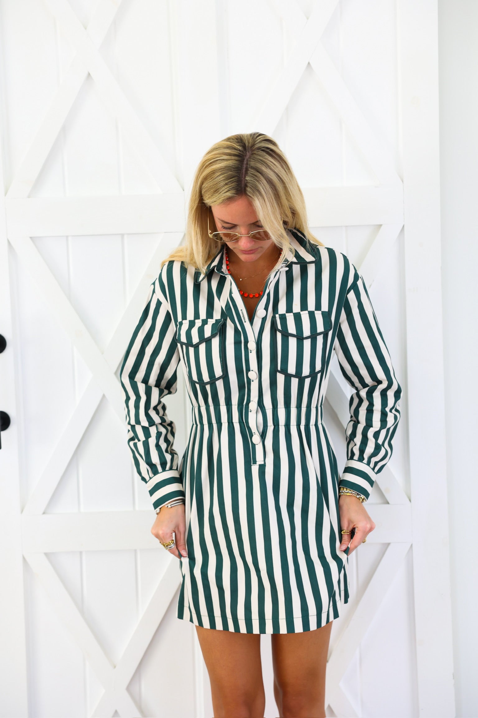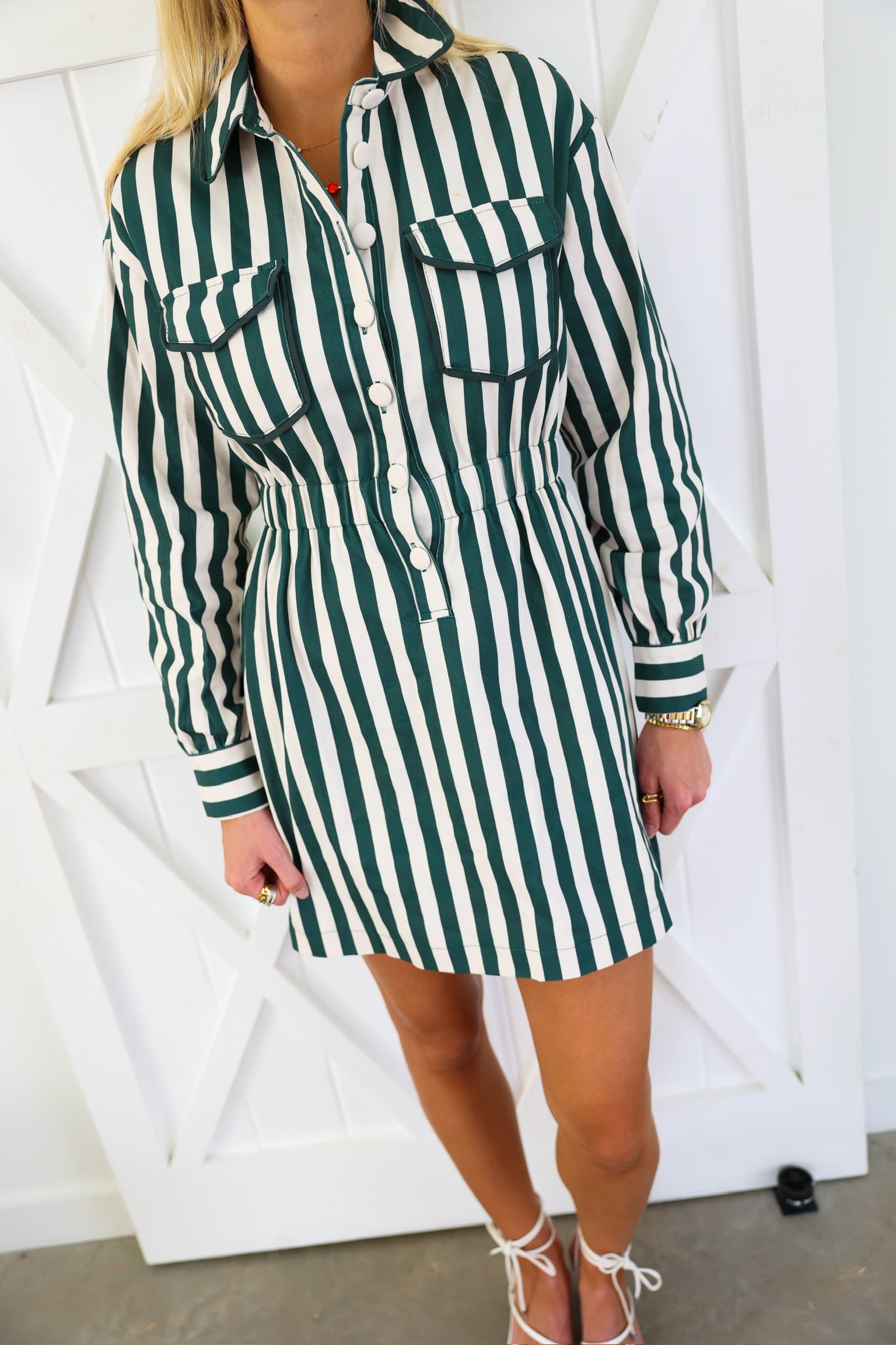 Vertical Striped Waist Elastic Band Shirt Dress | Green