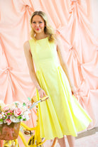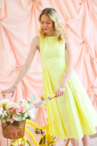 Bright, cheerful, and effortlessly polished, the Sunshine Breeze Sleeveless Midi Dress from THML is made for warm days and easy styling. Crafted in a lightweight cotton blend, this dress features a clean sleeveless silhouette with a softly structured bodice and a gently gathered skirt that creates beautiful movement without feeling fussy.