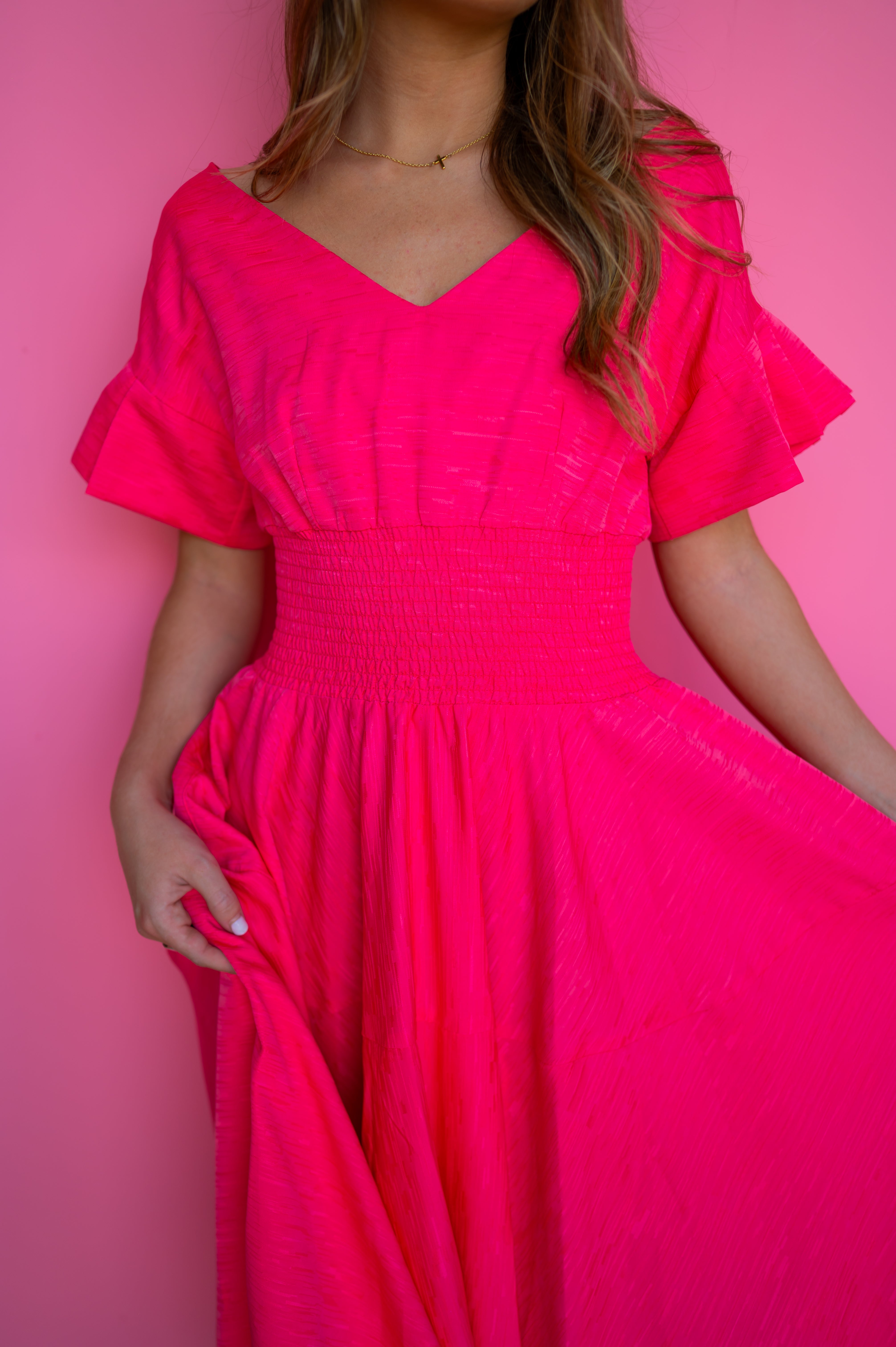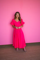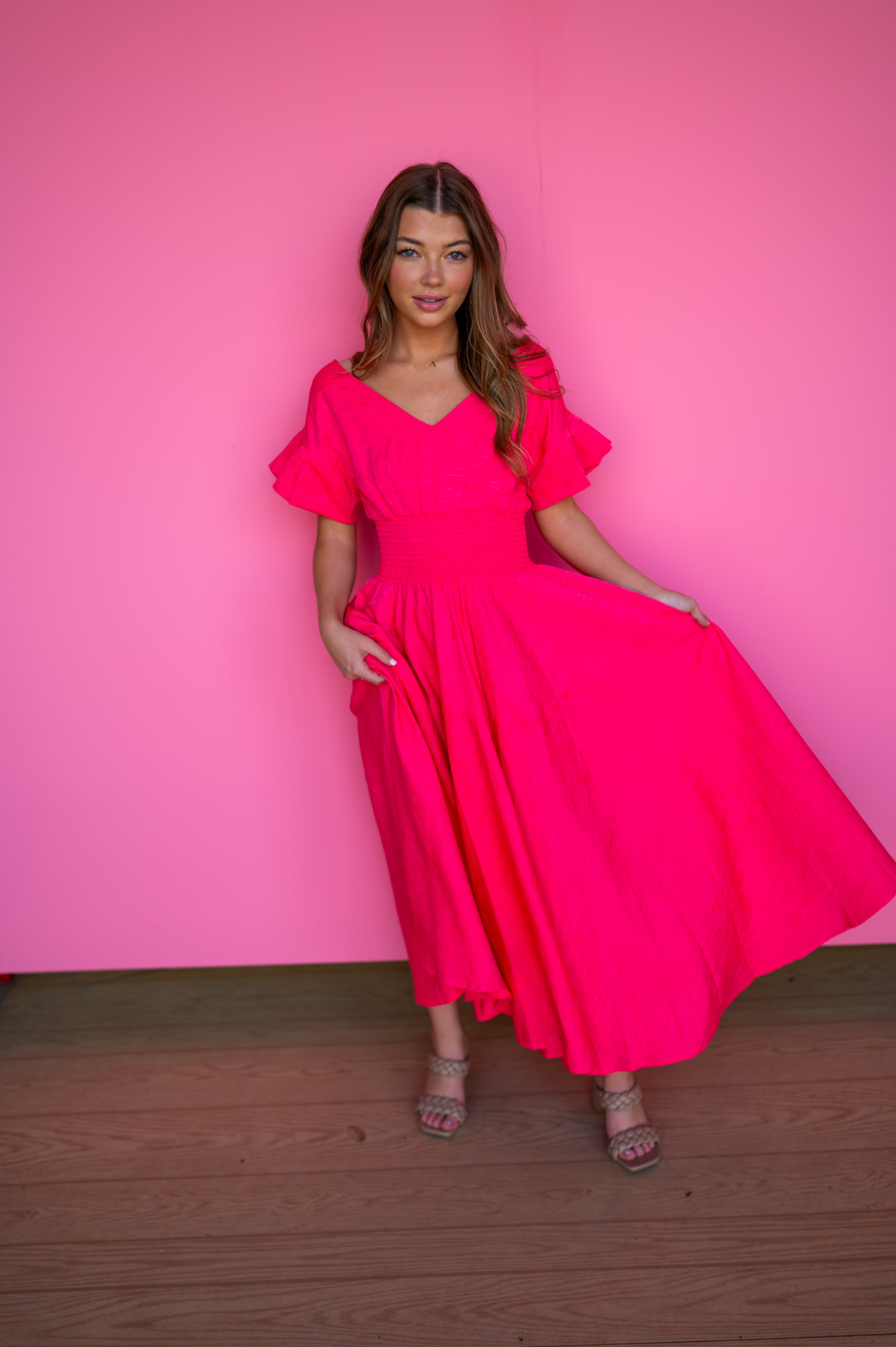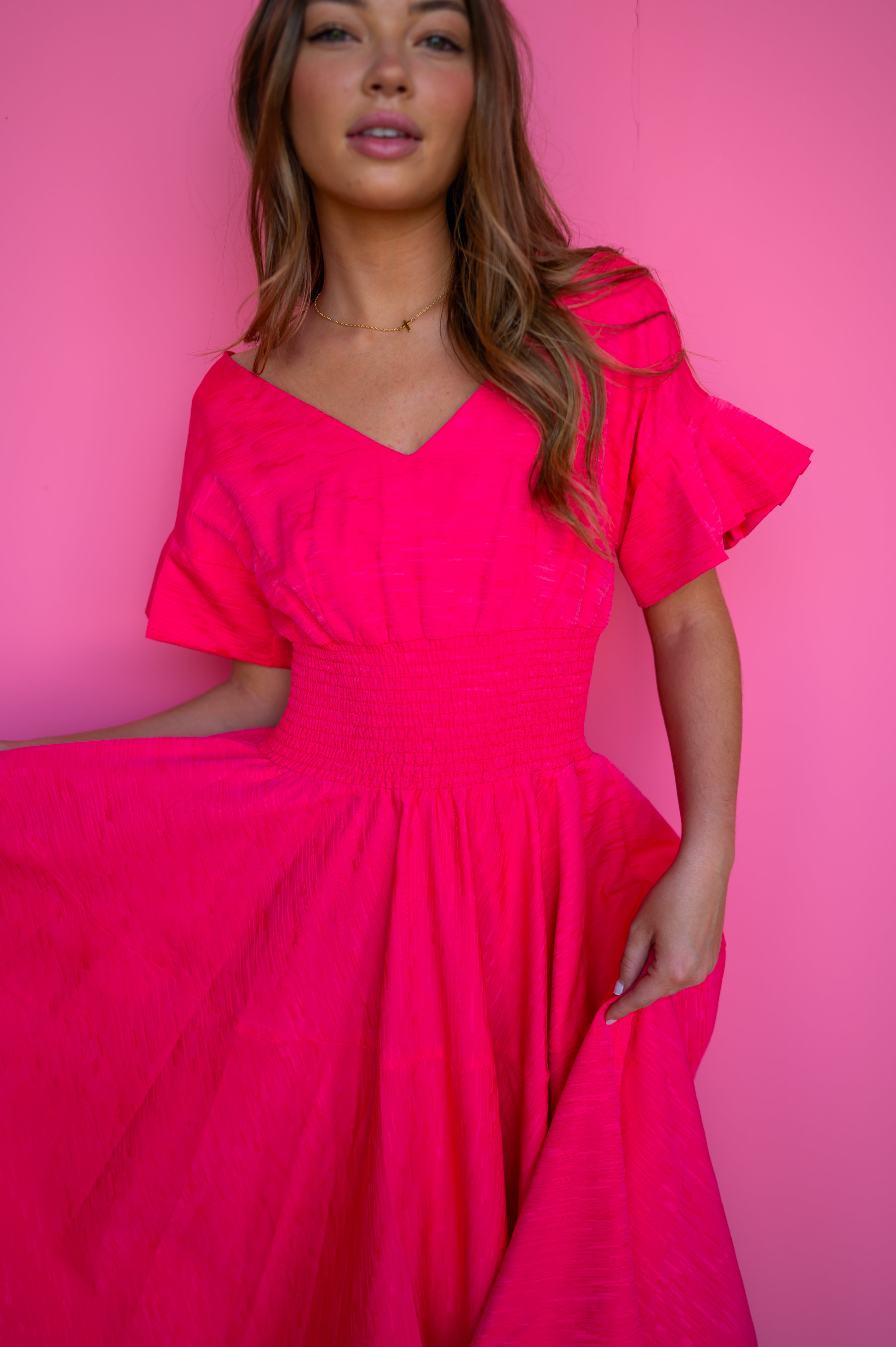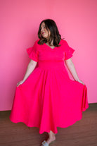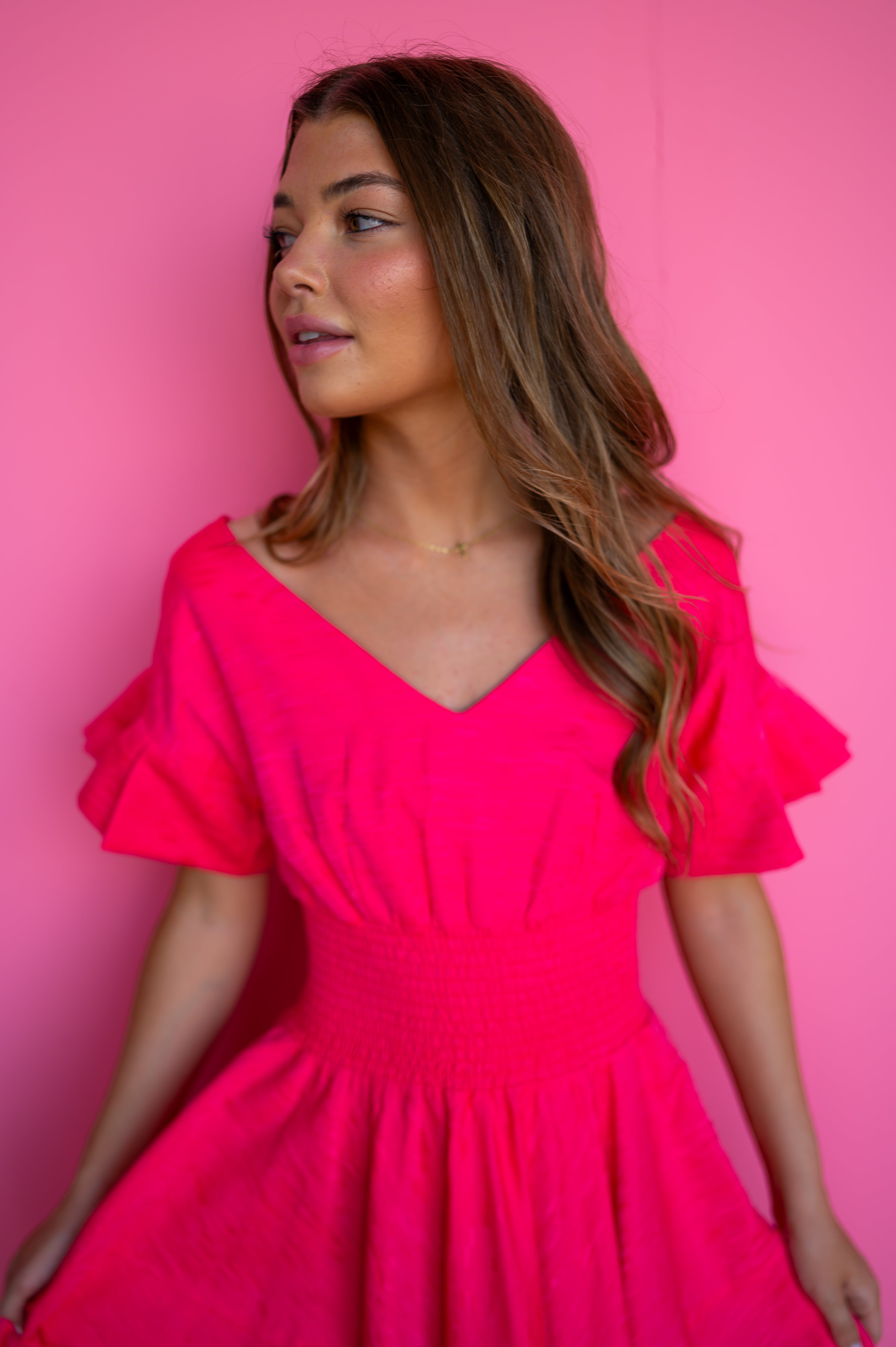 Add a playful pop to your wardrobe with the Molly Bracken Joan Pink Dress. Featuring ruffle sleeves and a smocked waist, this dress is perfect for any occasion. Stay comfortable and stylish with this quirky and fun piece.