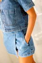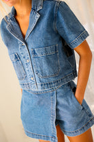 Flirty meets functional in this Elan Light Wash Denim Front Wrap Buckle Skort. Designed with the look of a chic mini skirt and the comfort of built-in shorts, this piece gives you effortless style with confidence to move. The front wrap silhouette is finished with a subtle buckle detail for a modern edge, while the light-wash denim keeps it classic and endlessly wearable.