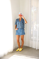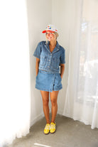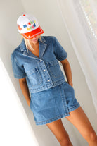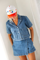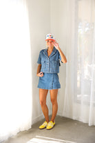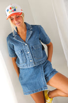 Effortlessly cool with a modern edge, the Elan Cropped Denim Short Sleeve Jacket is your new go-to layering piece. Designed with a relaxed, boxy silhouette, this lightweight denim jacket features short sleeves, oversized front patch pockets, and a classic button-front closure. The cropped length hits just right to pair perfectly with high-waisted skirts, shorts, or denim—making it ideal for warm-weather styling.