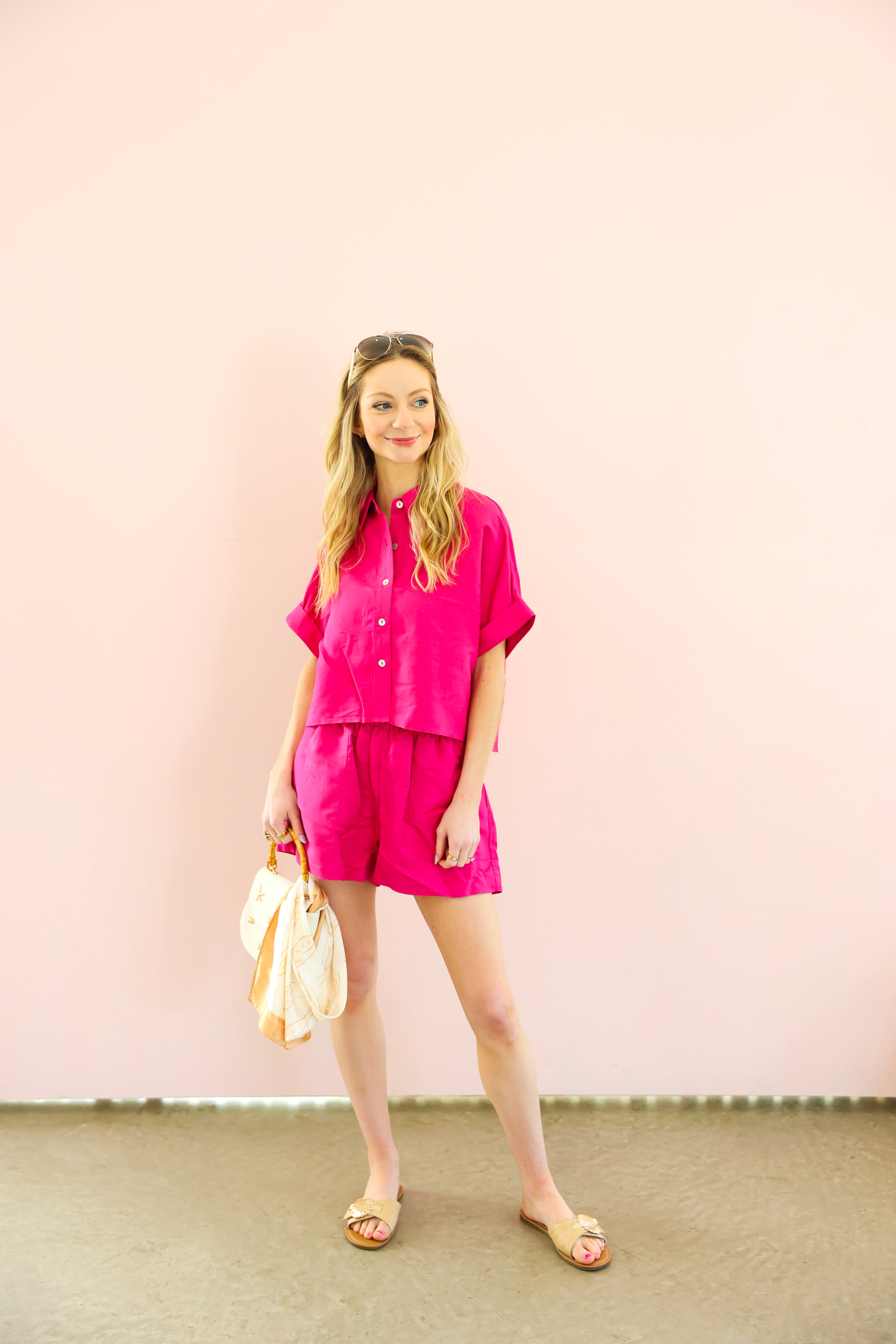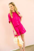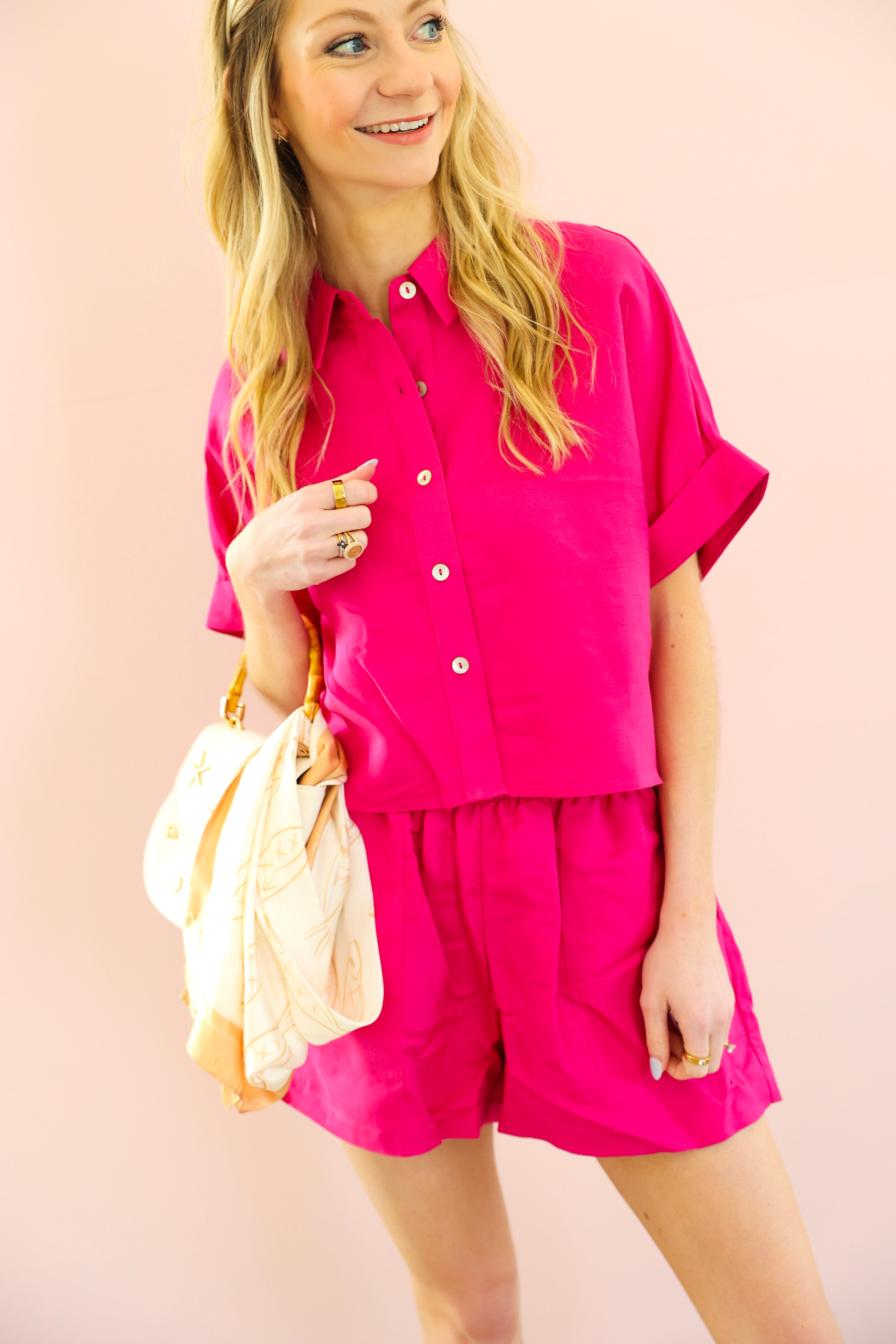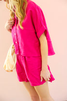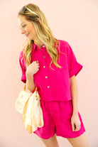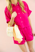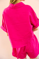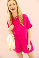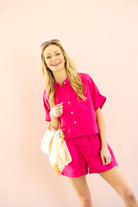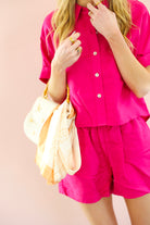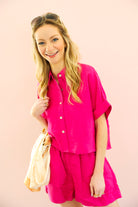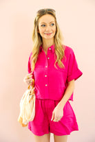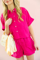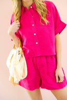 Bright, polished, and effortlessly chic. The Elan Sunset Button-Up Top features a vibrant fuchsia color with a modern cropped silhouette that brings a fresh twist to a classic button-down style. The structured collar and rolled short sleeves add a tailored touch while keeping the look relaxed and easy to wear.