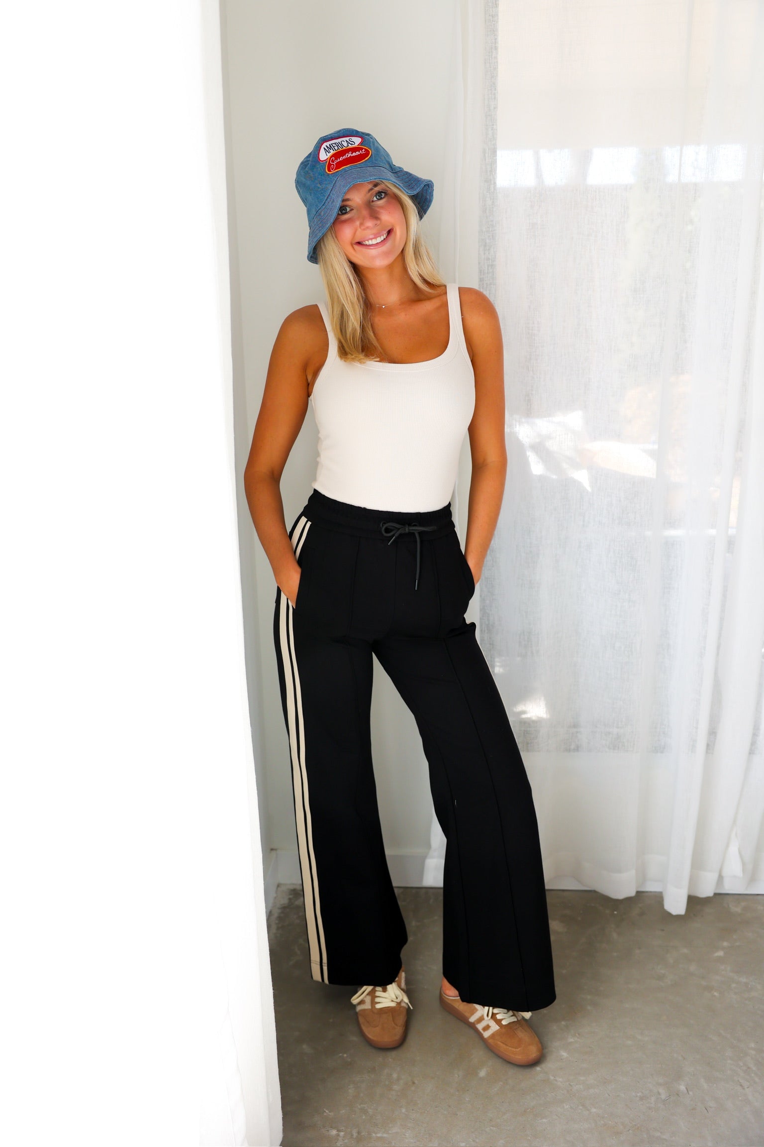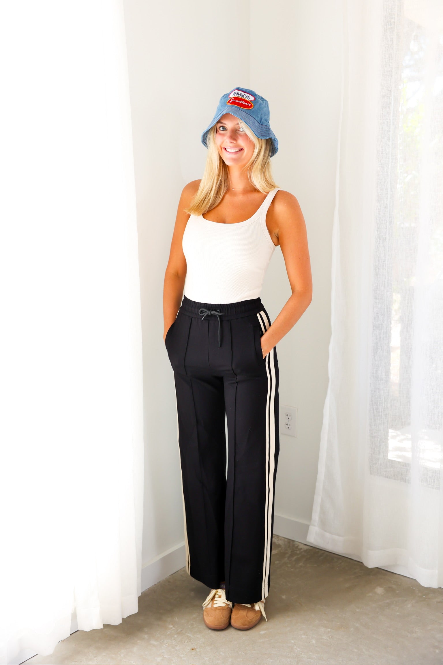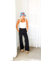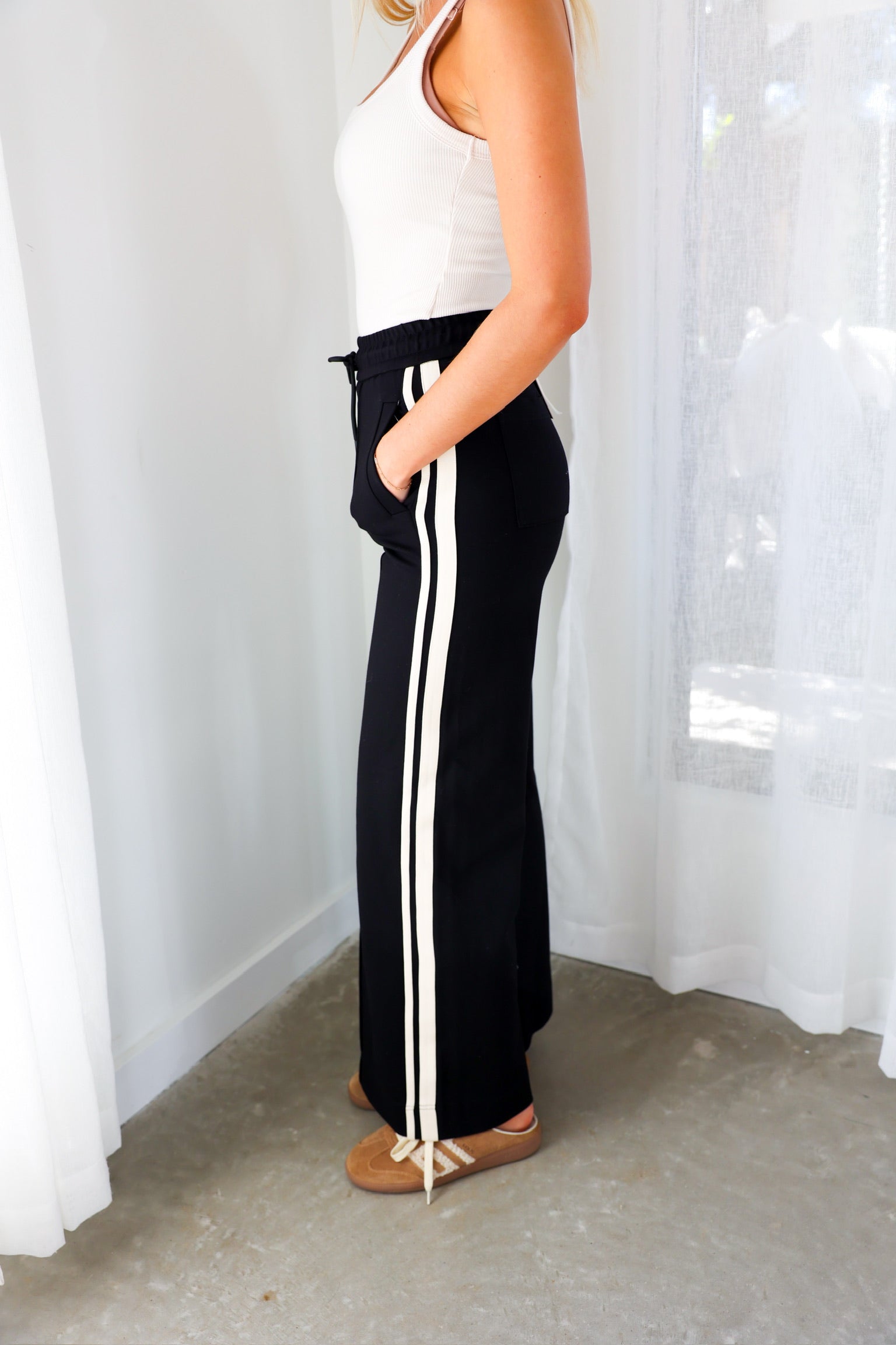 Sporty meets polished in the Elan Black Side Stripe Wide Leg Pant—a modern take on effortless everyday style. Designed with a relaxed wide-leg silhouette, these pants feature contrast side stripes that add a sleek, athletic edge while still feeling elevated enough for everyday wear. The elastic drawstring waistband keeps the fit comfortable and flexible, making these an easy grab-and-go piece you’ll reach for again and again.
