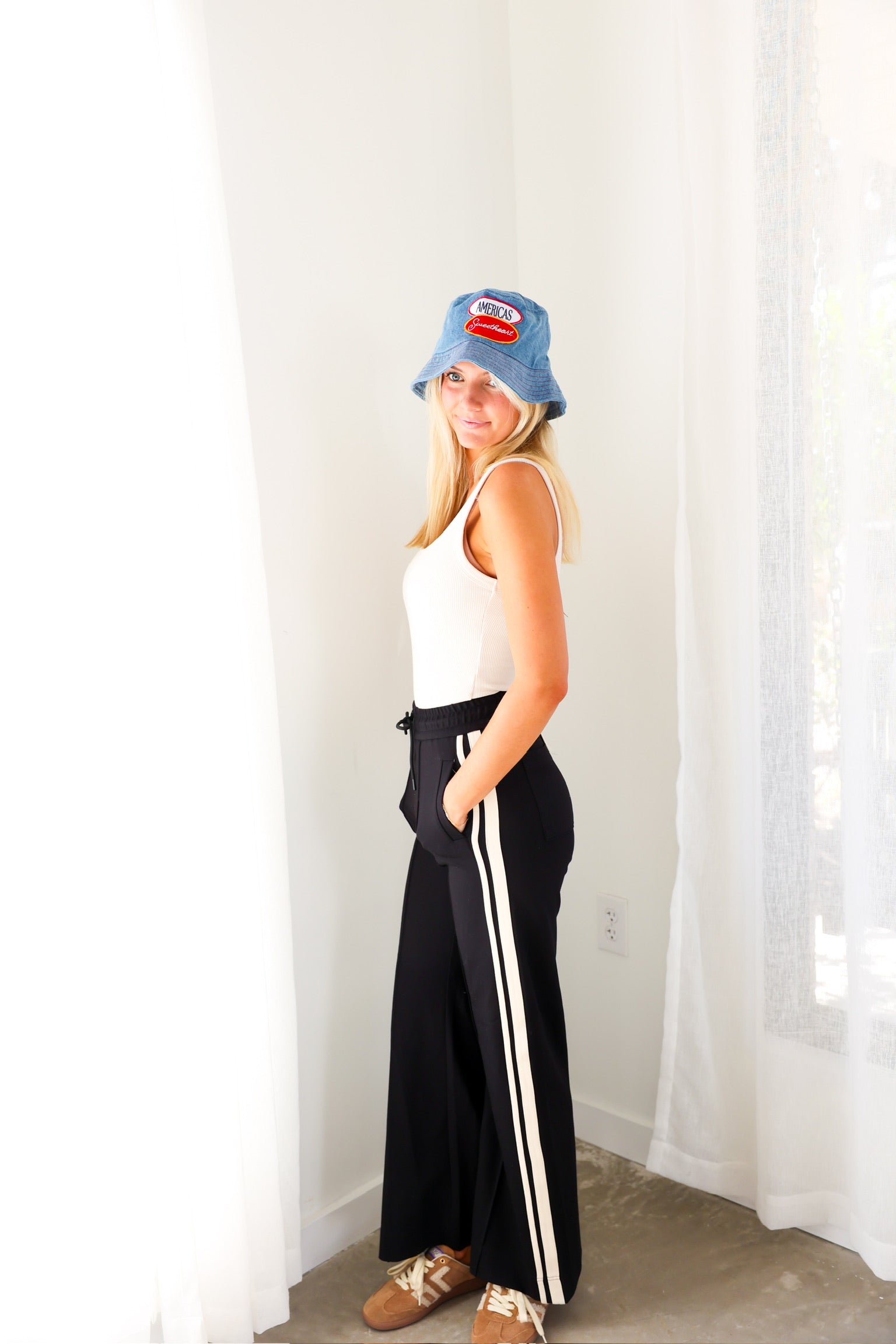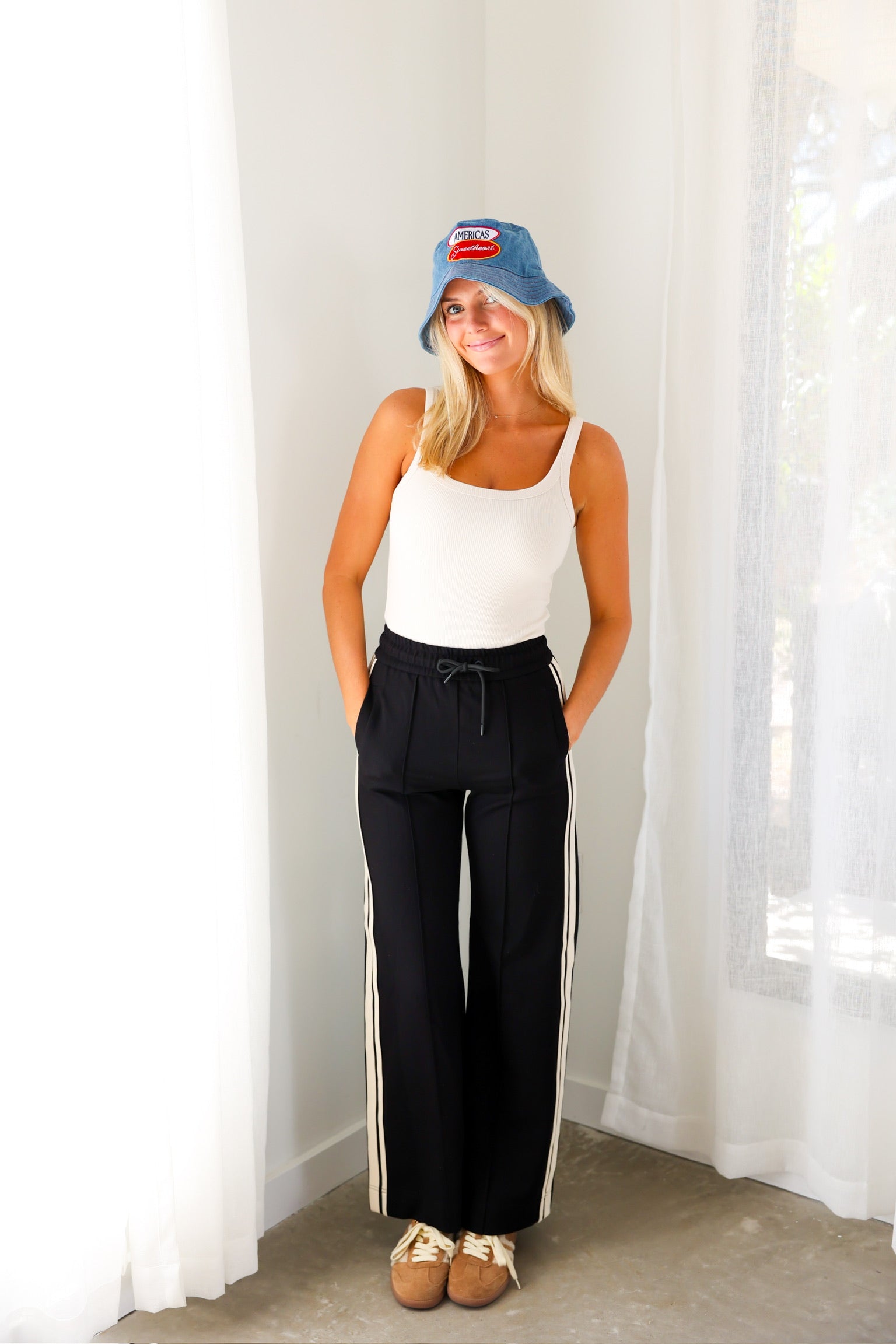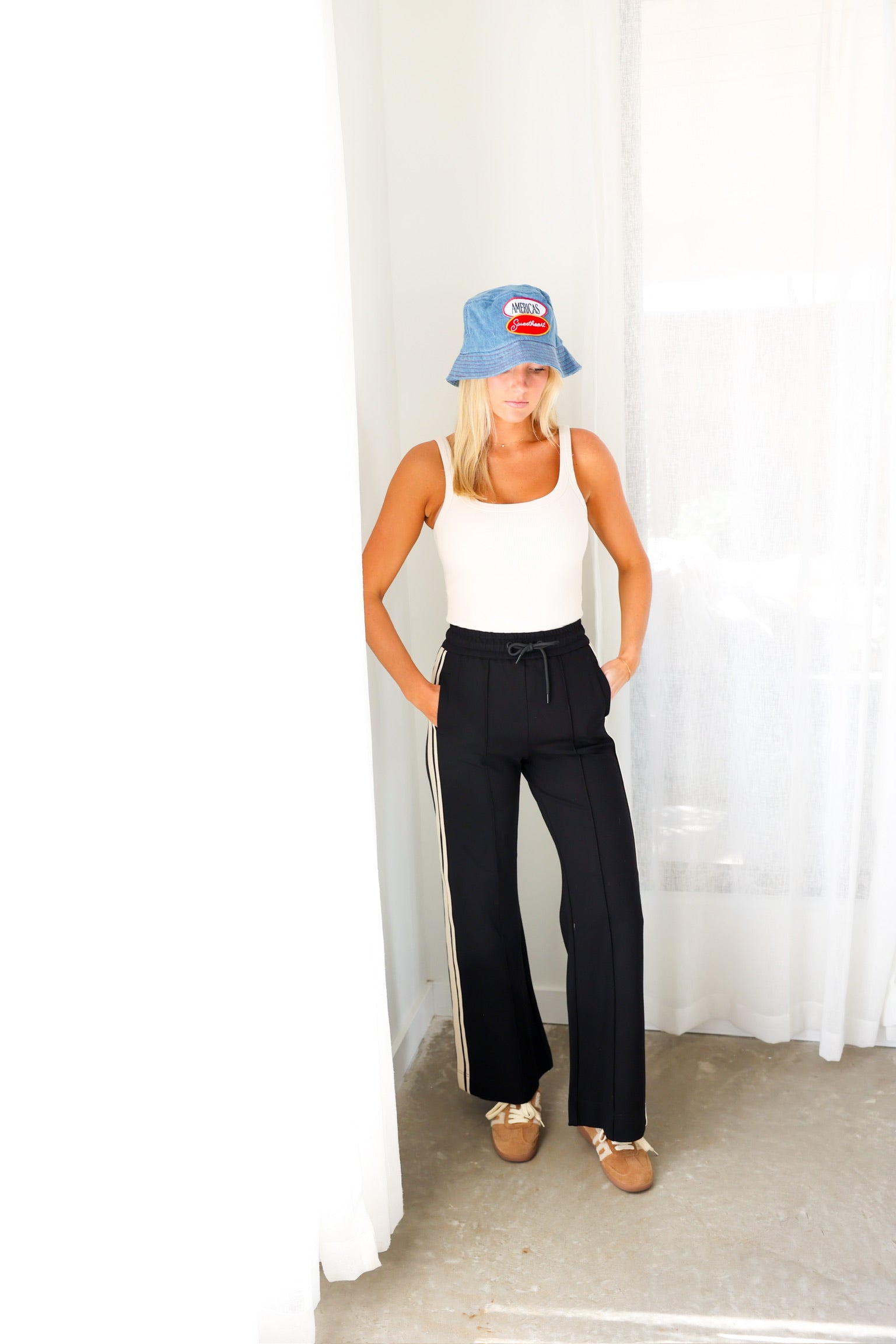 Sporty meets polished in the Elan Black Side Stripe Wide Leg Pant—a modern take on effortless everyday style. Designed with a relaxed wide-leg silhouette, these pants feature contrast side stripes that add a sleek, athletic edge while still feeling elevated enough for everyday wear. The elastic drawstring waistband keeps the fit comfortable and flexible, making these an easy grab-and-go piece you’ll reach for again and again.