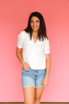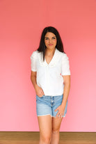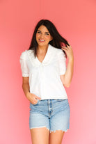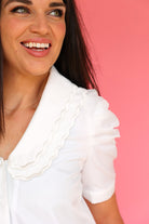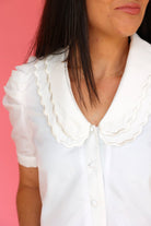 Bursting with summertime charm, the Cameron Top in White Taffeta is your new go-to for playful sophistication. Designed with a bold scalloped collar, delicate front covered button closures, and softly ruched shoulders, this top is a fresh take on vintage-inspired femininity. Crafted from a rich, organically crinkled silk, the fabric is incredibly lightweight and breathable—ideal for warm-weather days when style and comfort are a must.