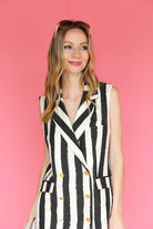 A modern take on the classic blazer dress, the Veronica Dress in Stripe Noir features a sharp lapel collar, double-breasted button closure, and a clean, tailored fit. The painterly stripe print adds dynamic contrast, making it a bold yet versatile piece for your elevated everyday wardrobe. Structured, stylish, and effortlessly polished with its luxurious linen fabric. Pair with gold accessories for a refined, elevated look!