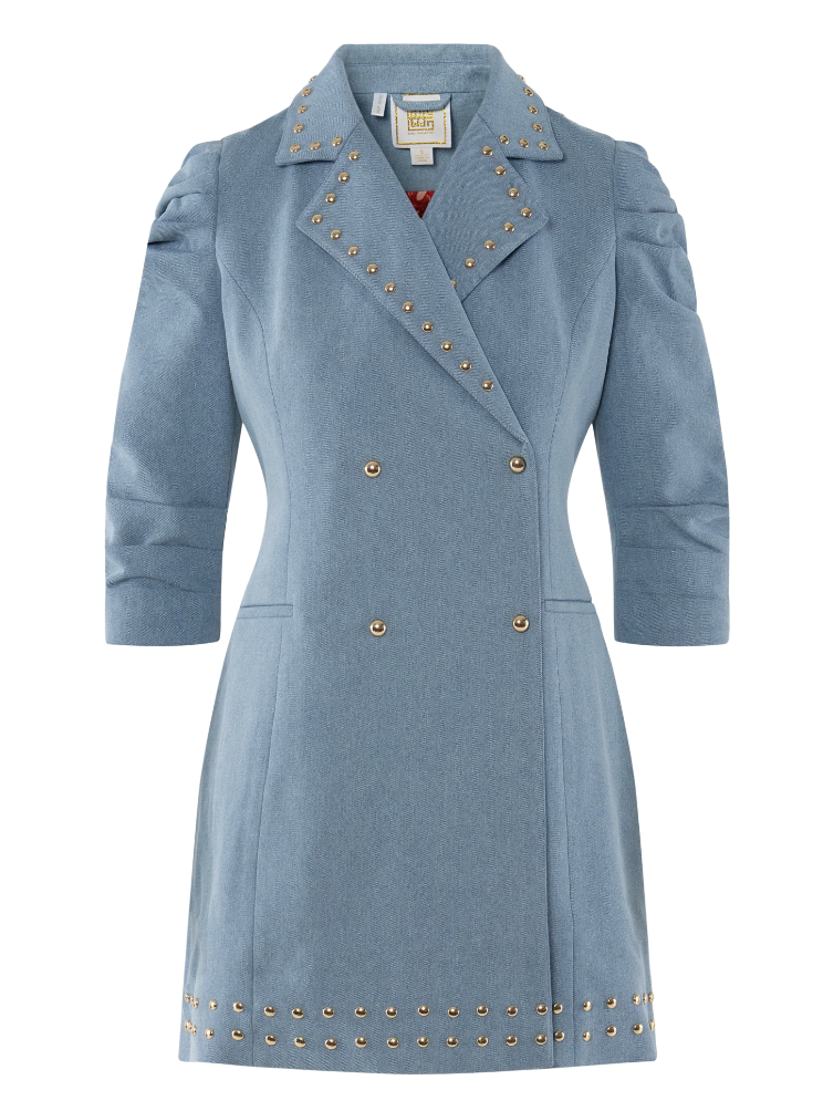 The Bradshaw Dress in Denim is a tailored blazer-style mini designed with a flattering, structured silhouette. The sharp lapel is accented with gold studs, complemented by a double-breasted front with gold snap closures. Quarter-length sleeves are finished with subtle ruching at the shoulders and hems for added shape. The skirt is trimmed with a row of gold studs, tying the design together with a refined yet bold touch. Fully lined in our signature bandana print, this style blends classic tailoring with statement-making details.