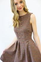 The Vivi Dress in Tweed brings playful charm to a tailored silhouette. Designed with a fitted bodice that flows into a flared skater-style skirt, this dress creates subtle volume for a flattering shape. The wool-blend tweed offers a timeless, heritage-inspired touch, while gold stud hardware at the bodice and shoulder seams highlights its polished detailing. An exposed gold zipper at the back, complete with our signature logo pull, adds a modern edge to this classic look.