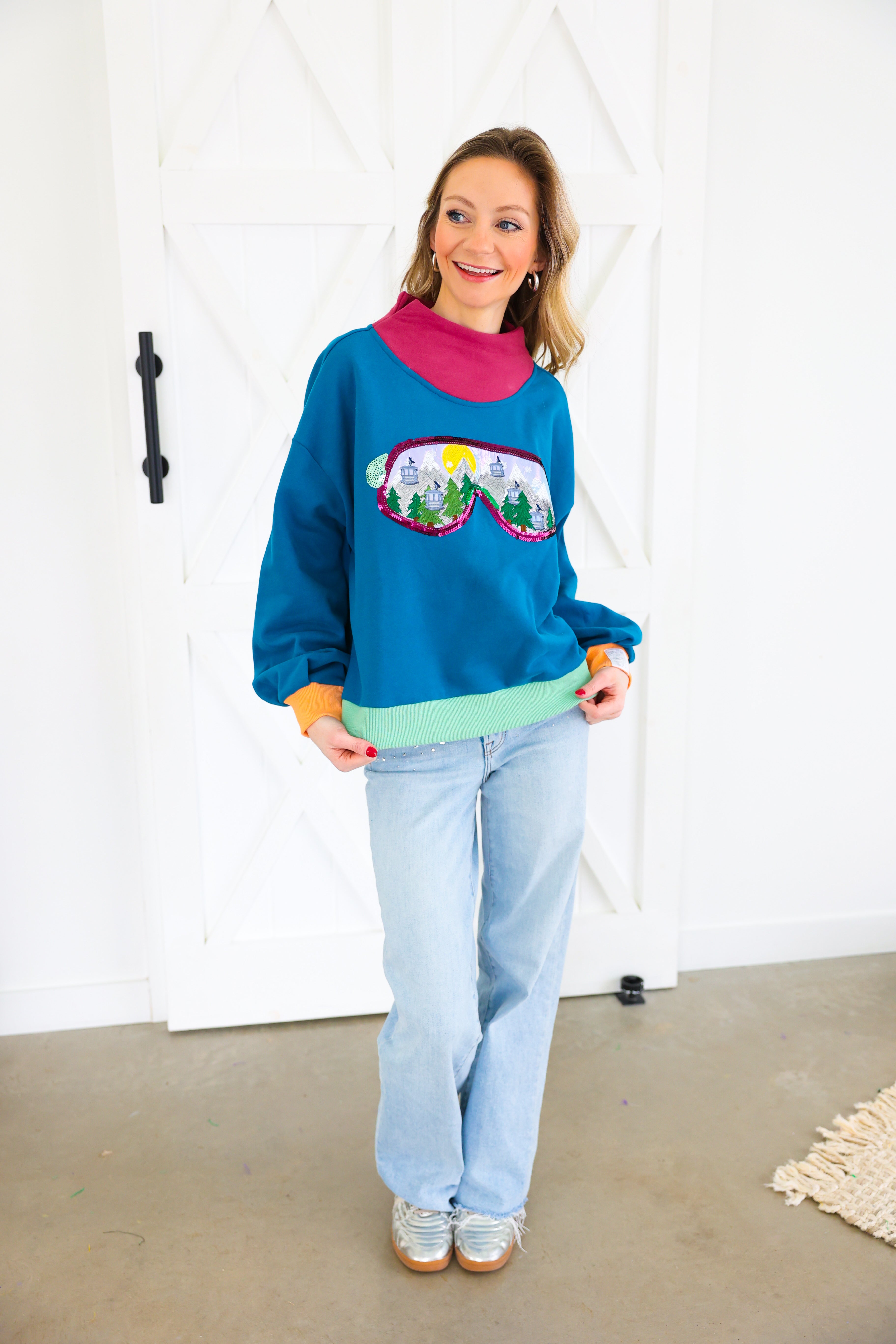 Colorblock Ski Goggle With Reflection Mock Neck Sweatshirt Queen of Sparkles
