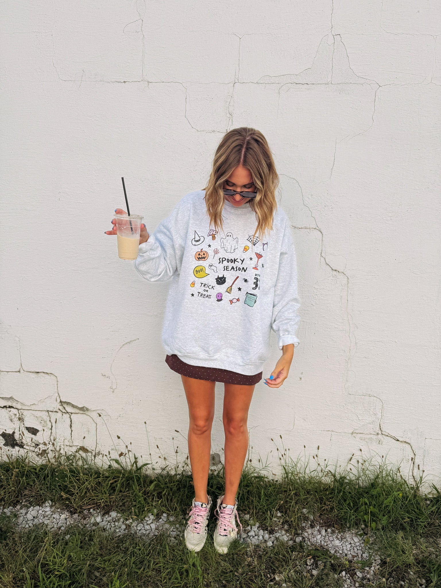 Celebrate Halloween in cozy style with our Spooky Season Sweatshirt. Its oversized fit adds an extra layer of comfort perfect for chilly autumn nights or festive gatherings. Designed with fun in mind, this sweatshirt makes it easy to embrace the spooky vibe while staying warm and relaxed all season long. Make your Halloween wardrobe both playful and practical with this must-have piece!