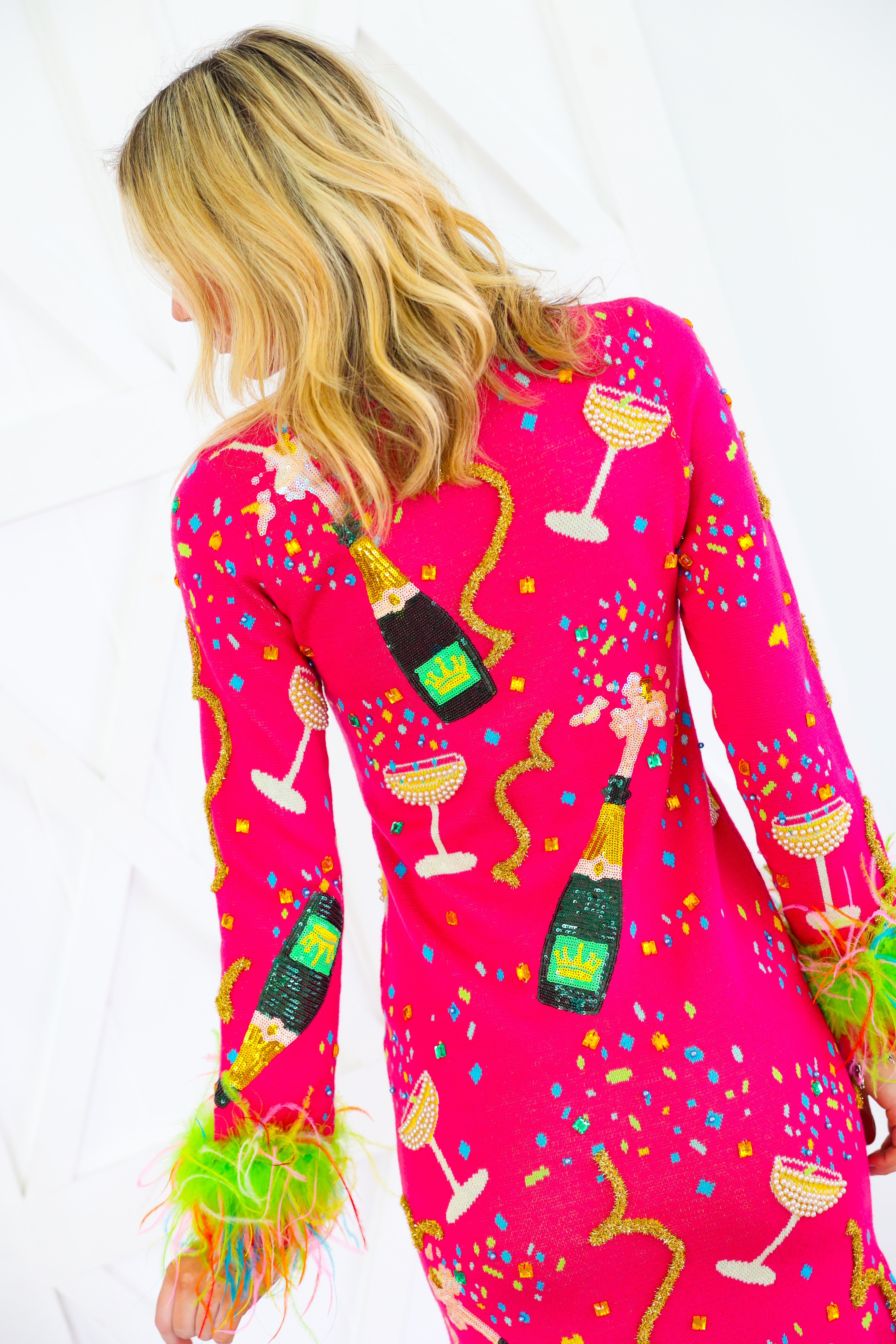 Hot Pink Popping Champagne Bottle & Coupe Feather Sleeve Midi Dress Queen of Sparkles