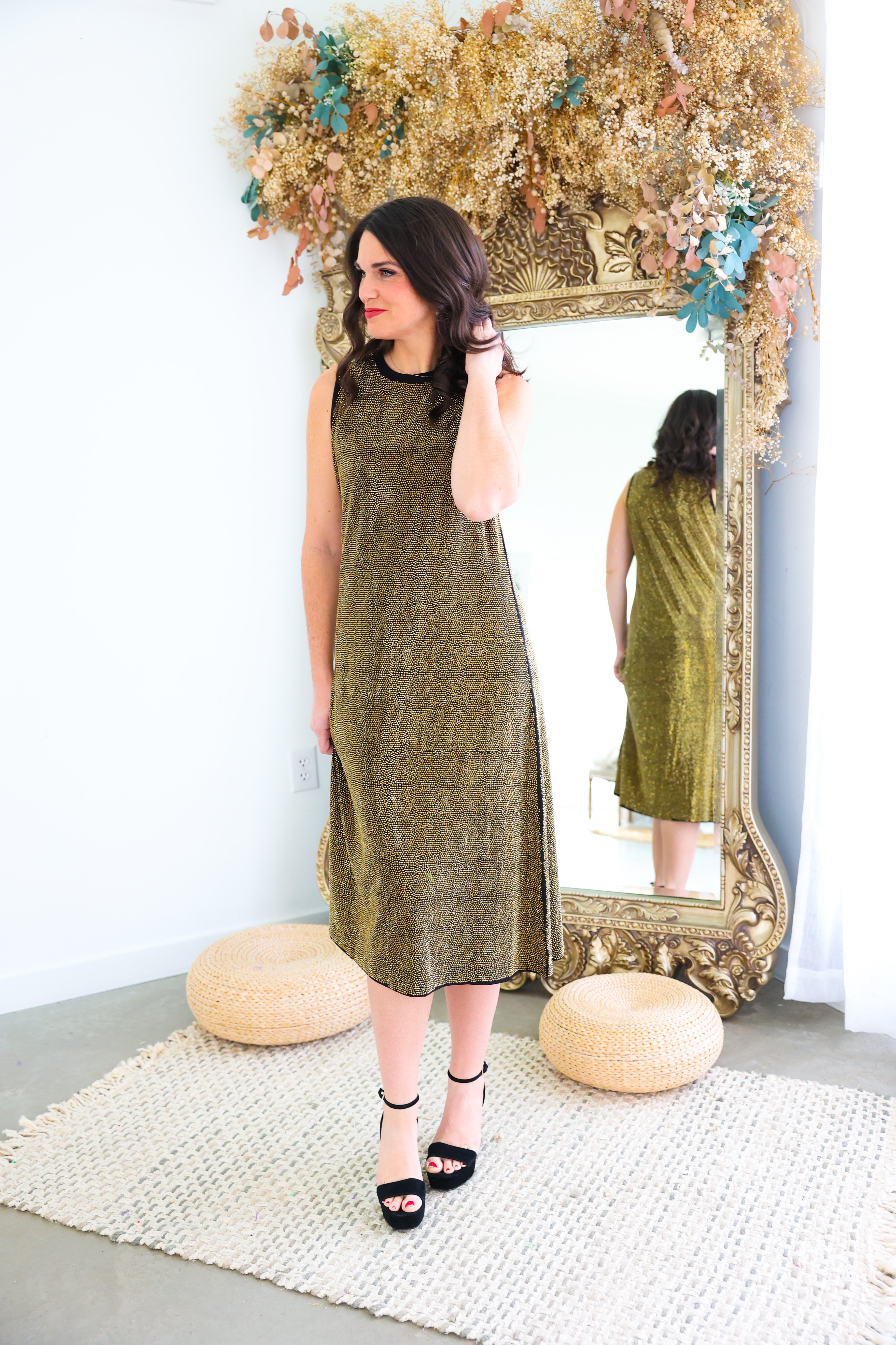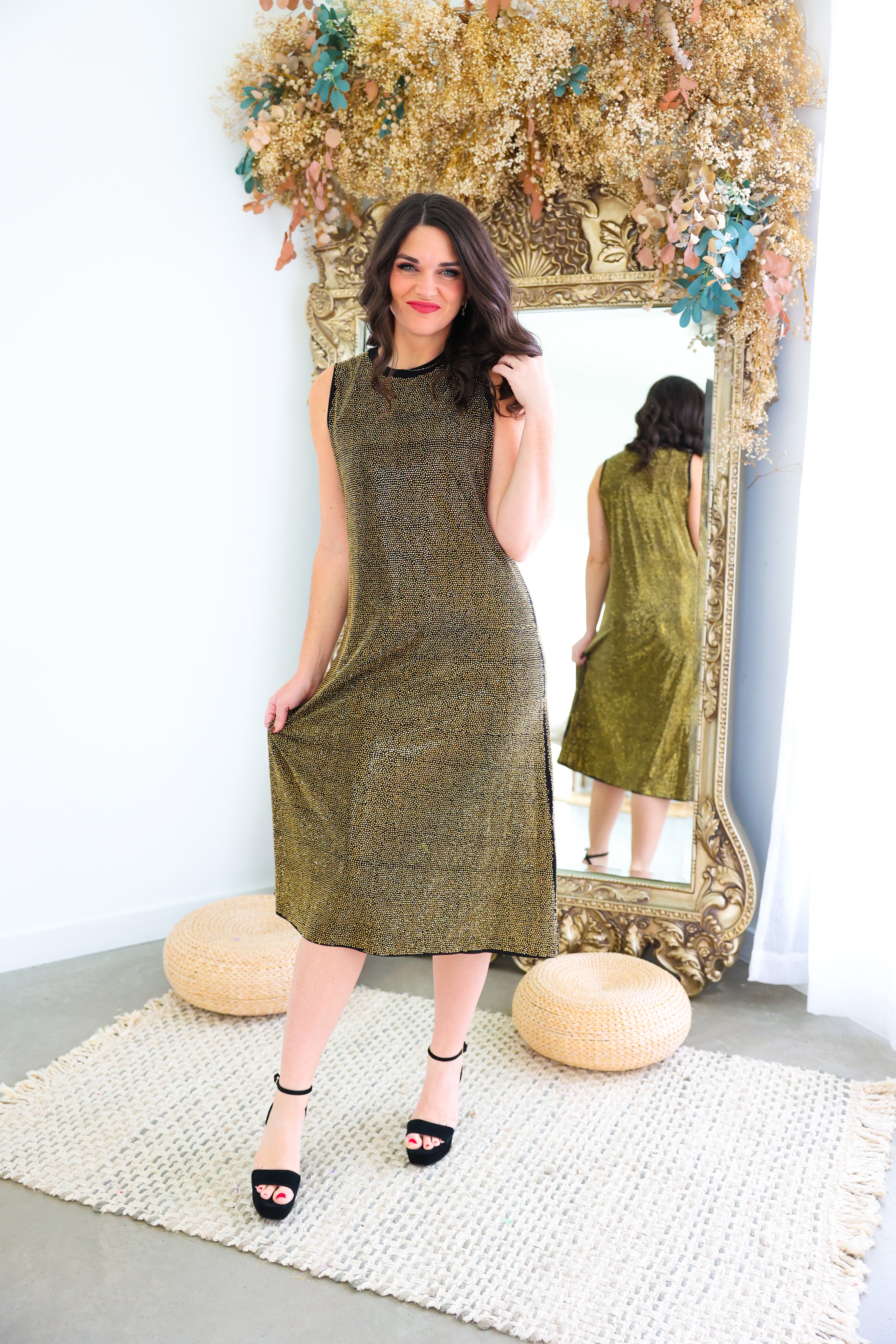 Black & Gold Full Rhinestone Active Midi Dress Queen of Sparkles