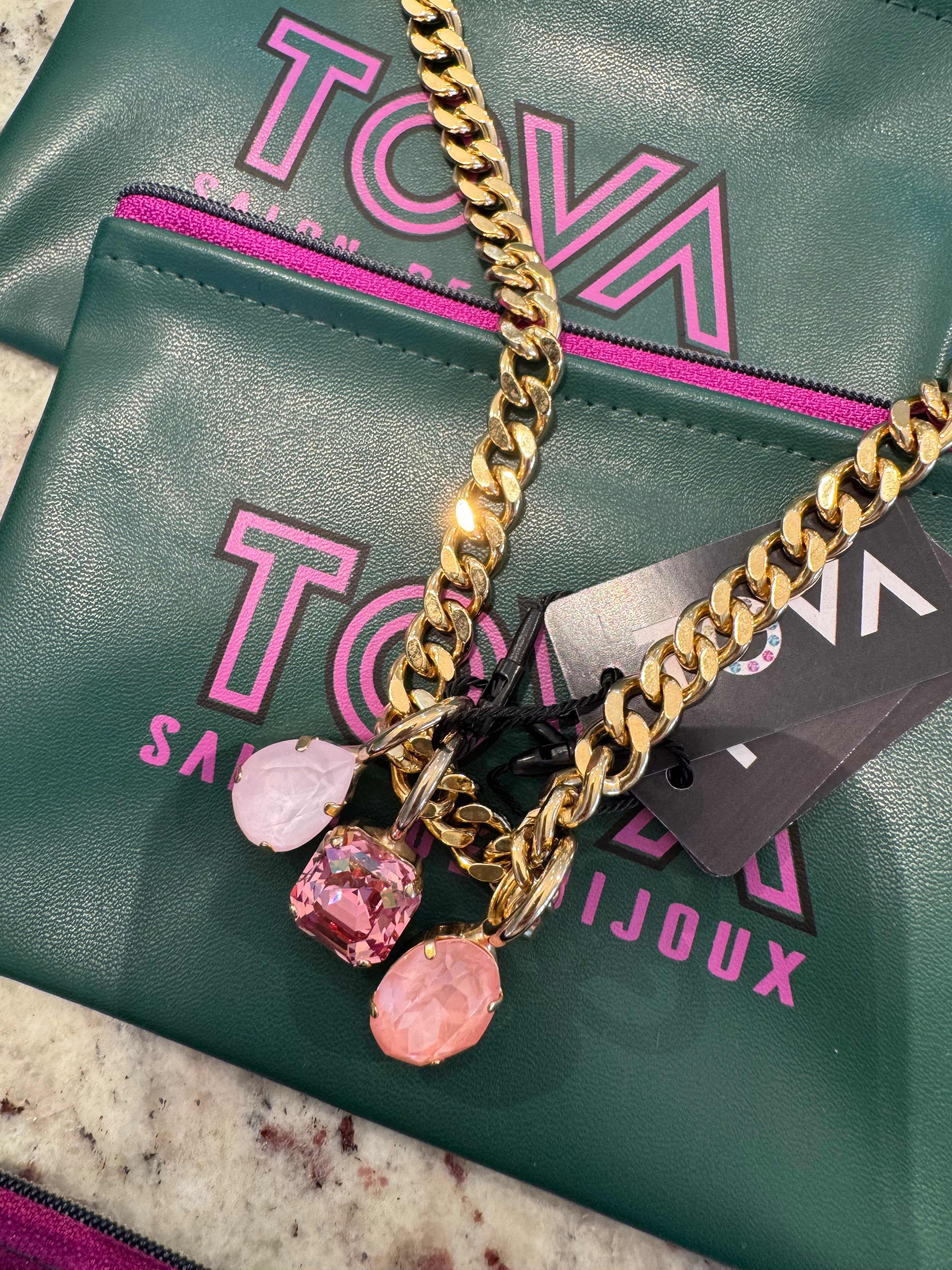 Bold, feminine, and thoughtfully layered, this custom TOVA necklace brings together signature shapes and soft, romantic hues for a statement piece that feels both playful and refined. Featuring the Dallas Necklace as the base, this design is finished with a trio of hand-selected pendants for a one-of-a-kind look you won’t find anywhere else.