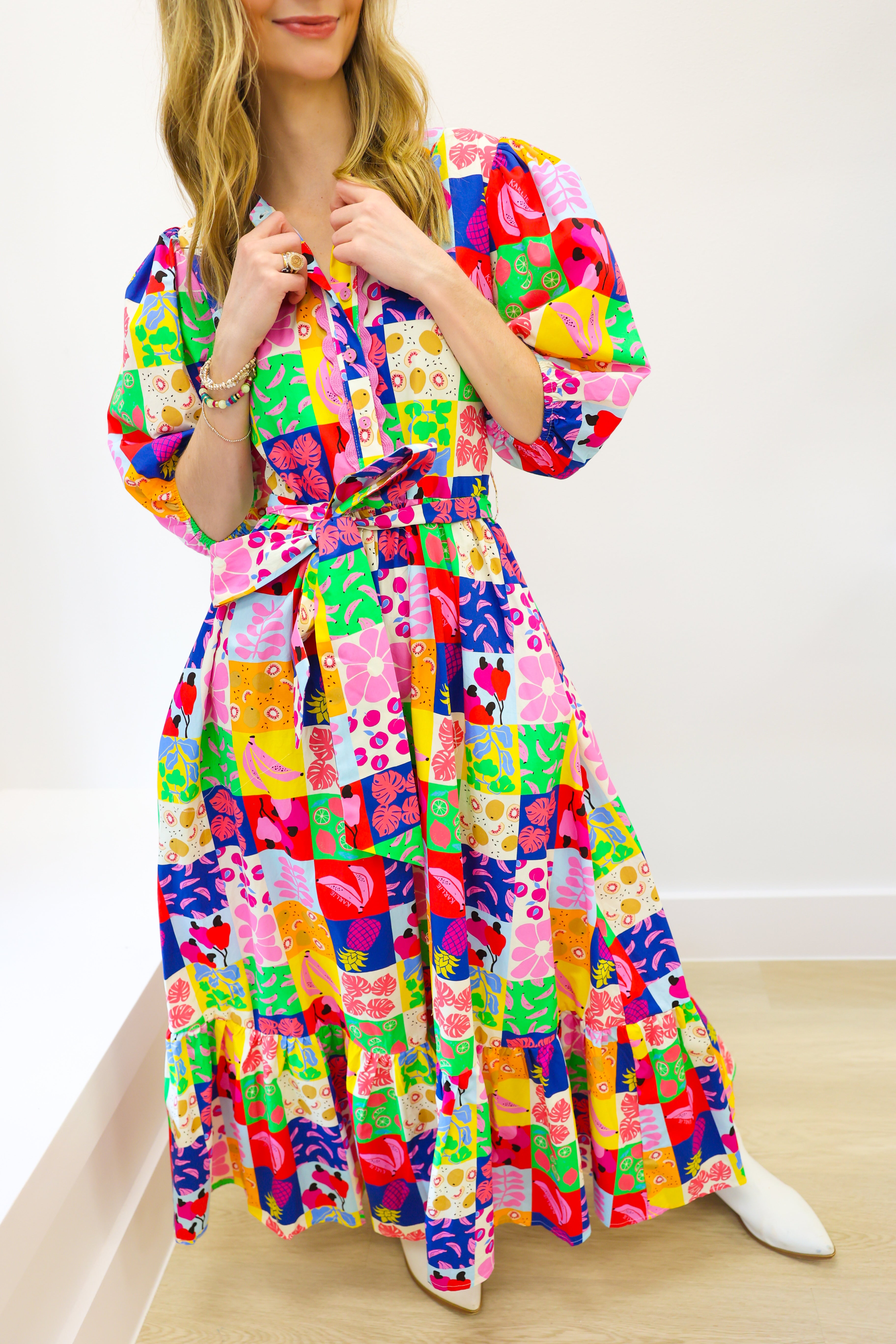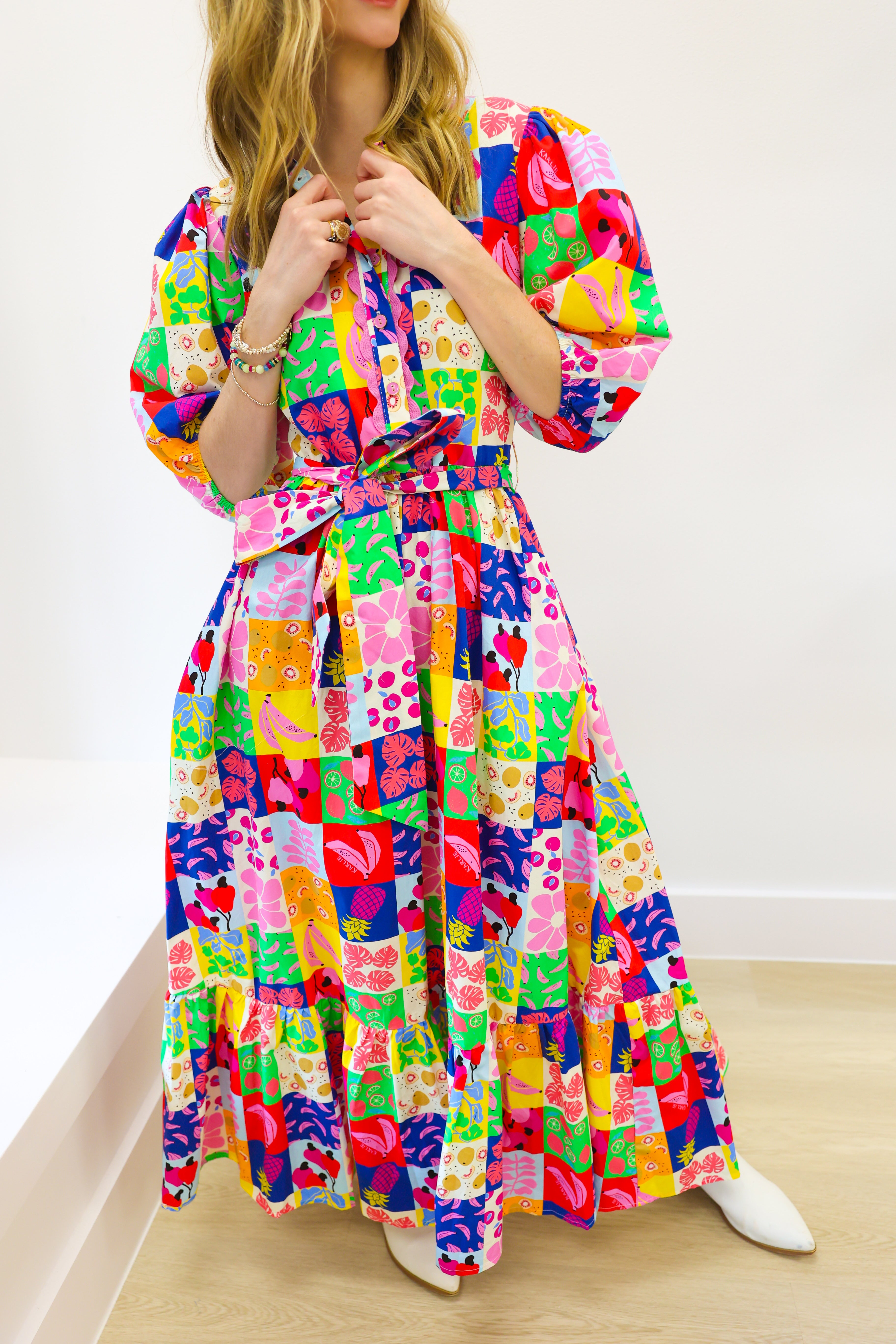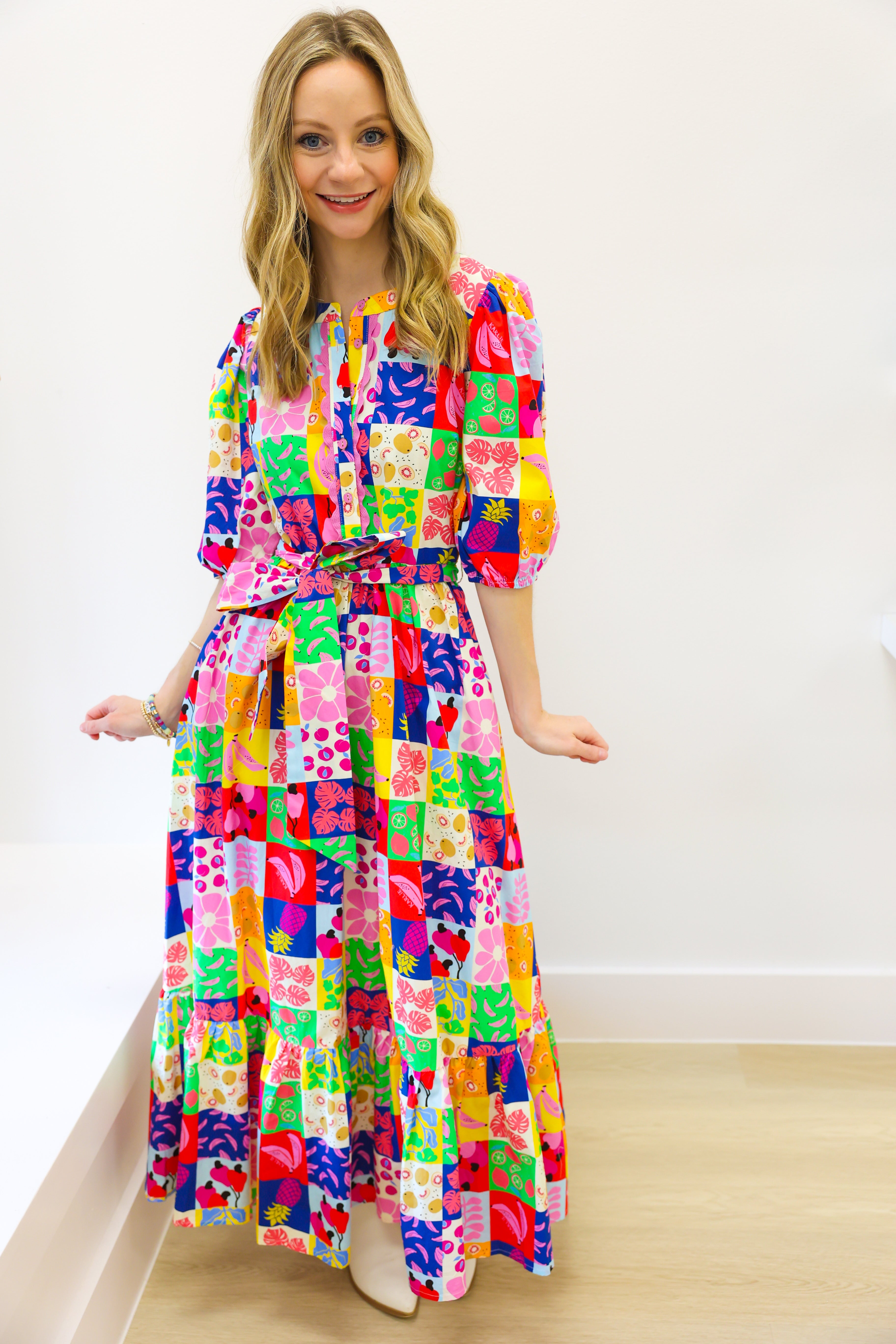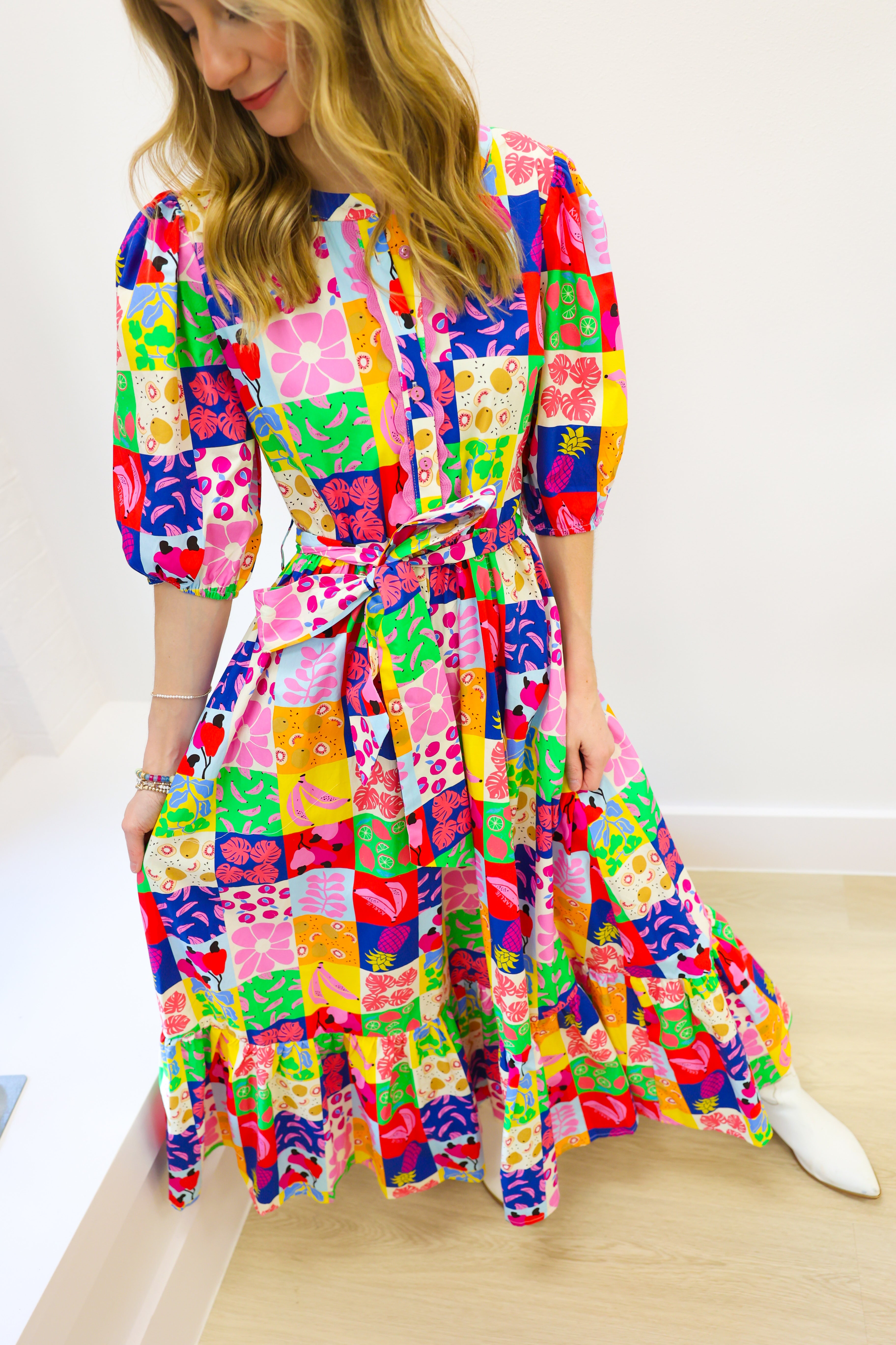 Embrace effortless style with the KARLIE Fruit Quilt Ric Rac Tier Maxi Dress. Featuring a playful fruit quilt pattern and delicate ric rac trims, this tiered maxi dress offers a perfect blend of comfort and charm. Its flowing silhouette moves gracefully with you, making it ideal for sunny days, garden parties, or casual outings where you want to stand out. Lightweight and breezy, it keeps you comfortable while elevating your wardrobe with a fresh, lively look. Make every step a statement in this uniquely feminine dress.