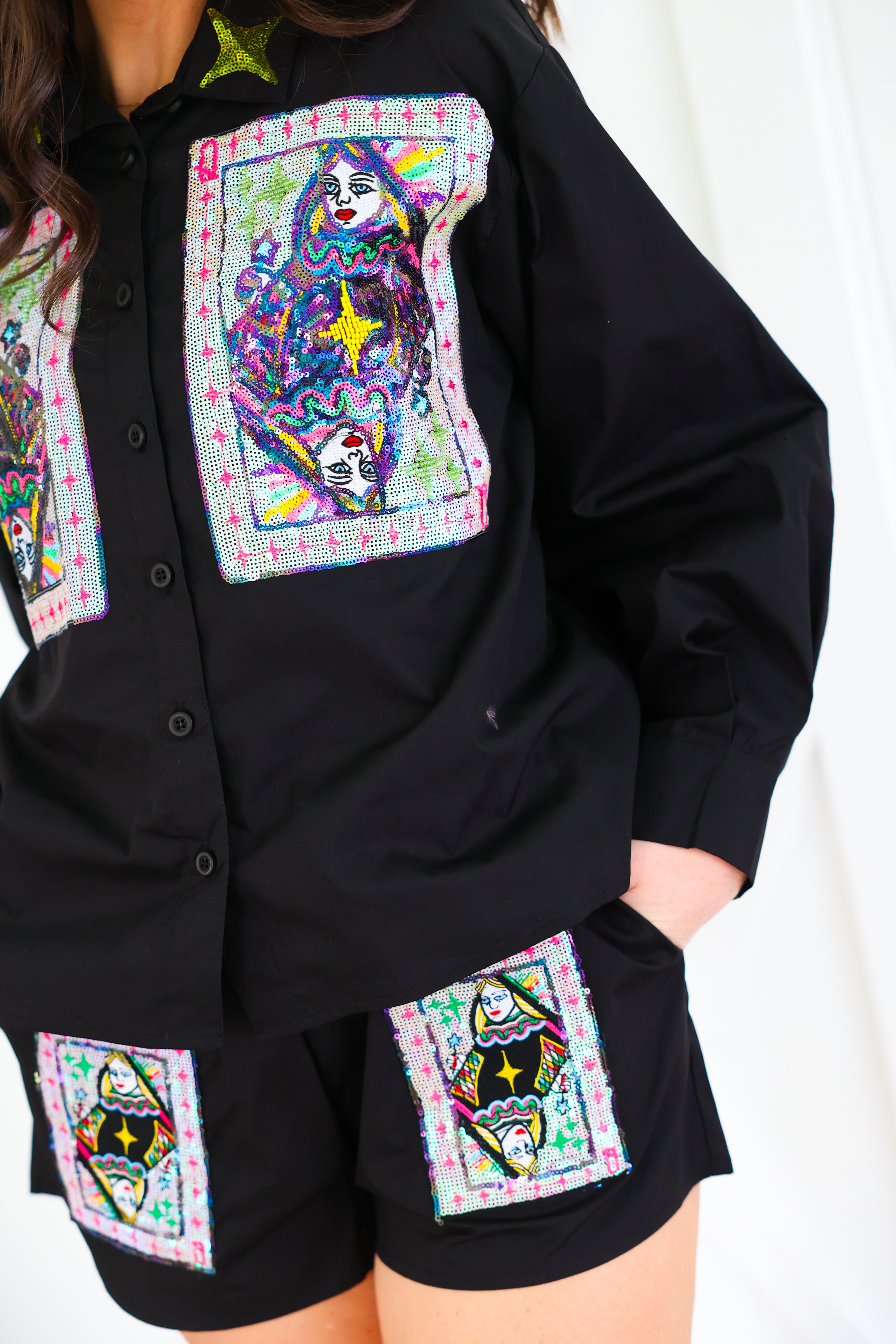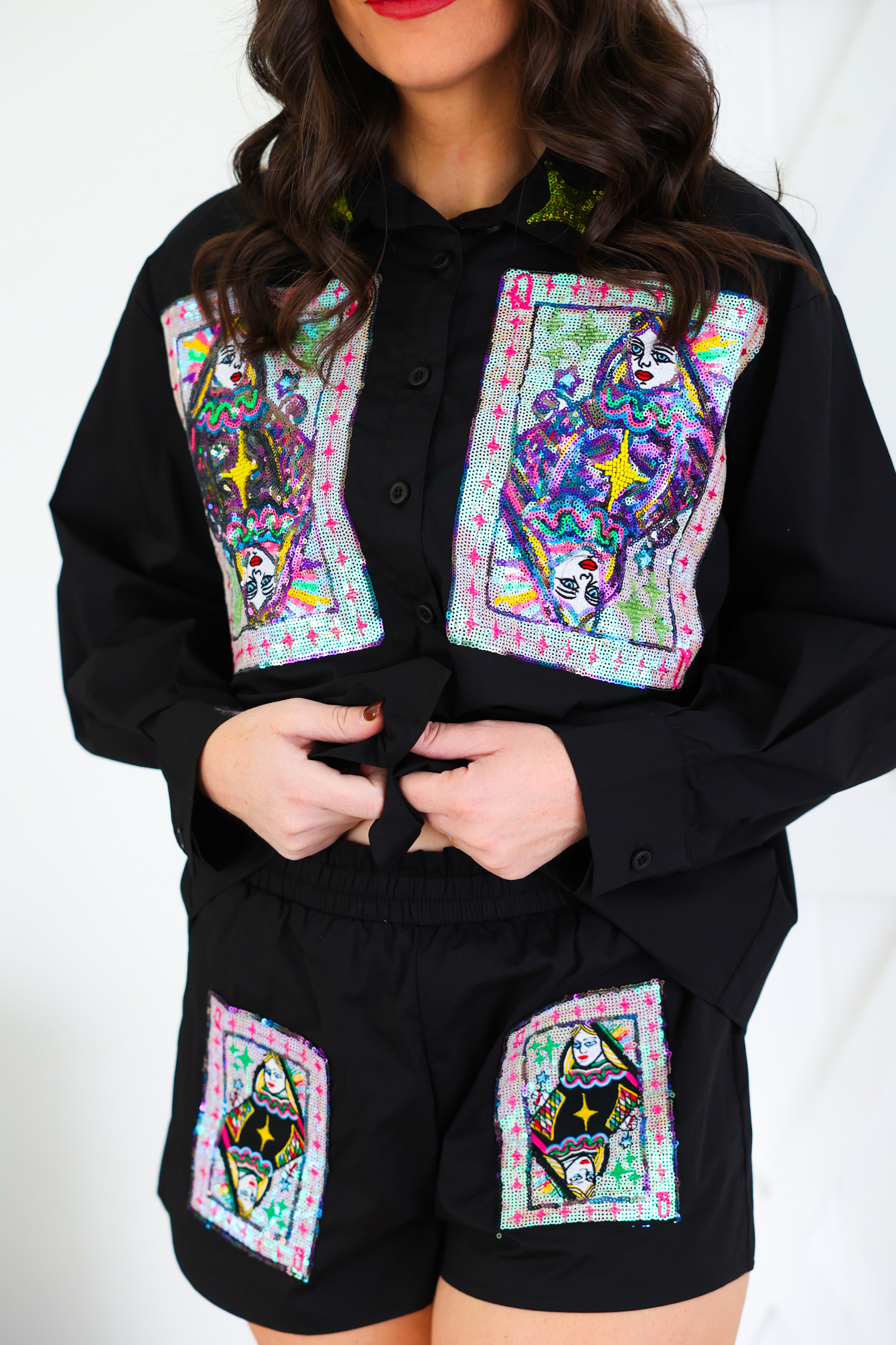 Black Queen Card & Sparkle Collar Button Up Cotton Top Queen of Sparkles
