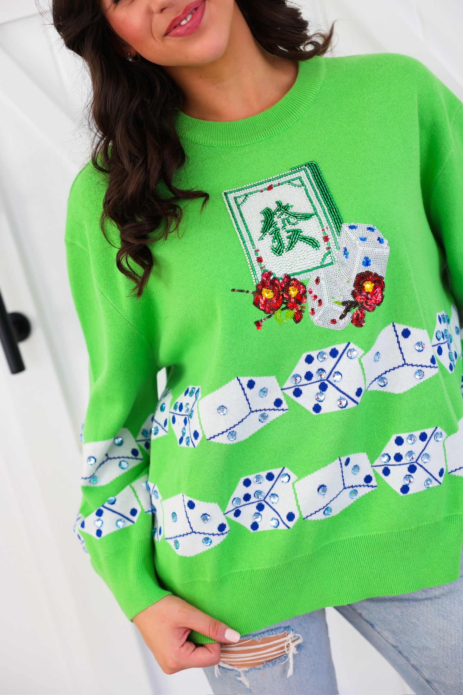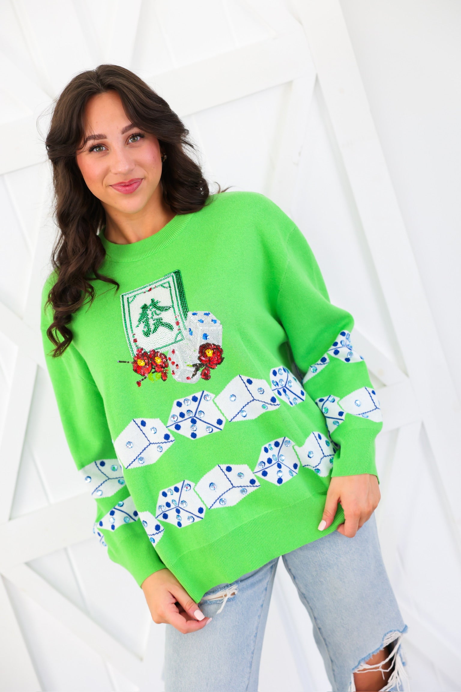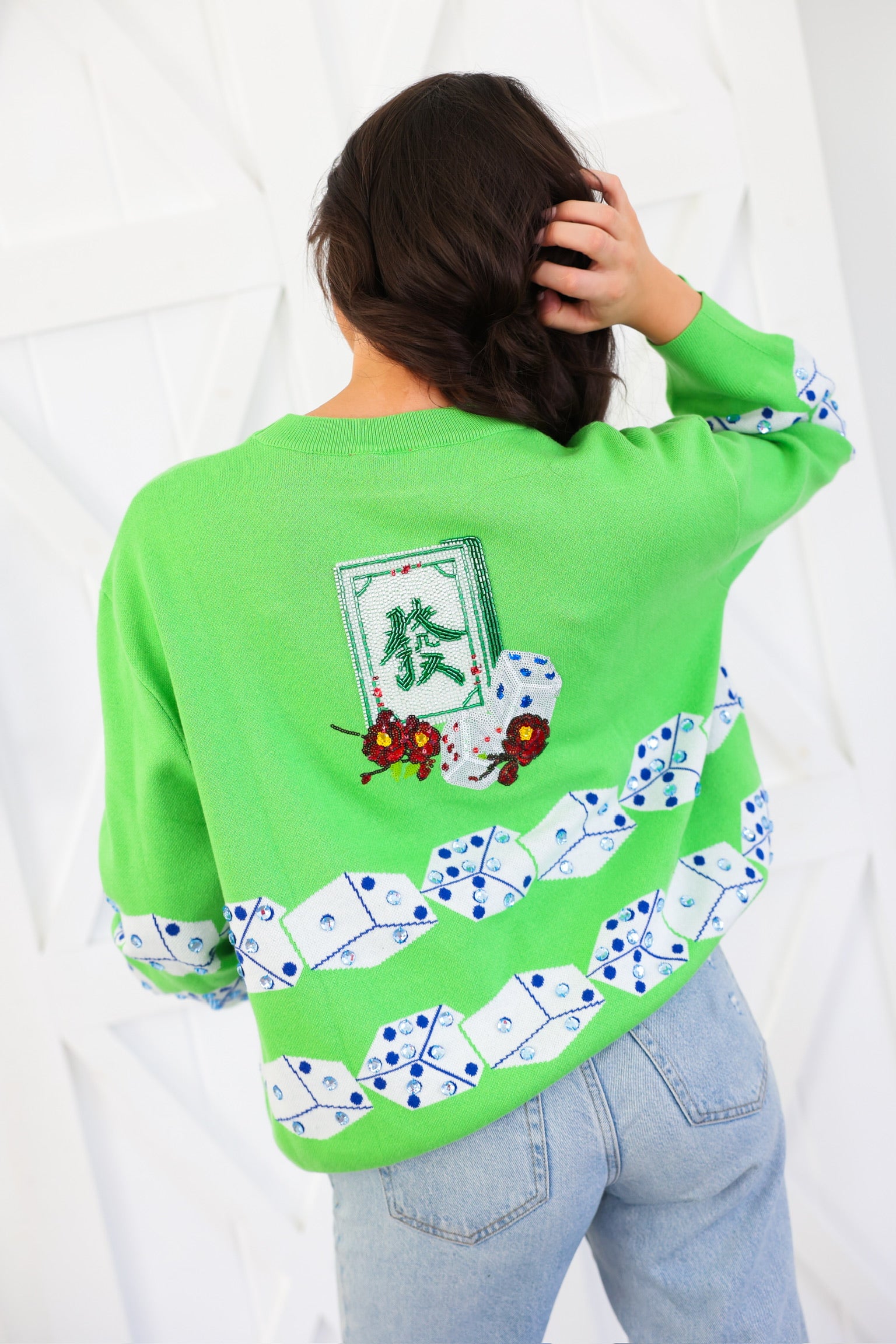 Green Mahjong Tile & Dice Sweater Queen of Sparkles