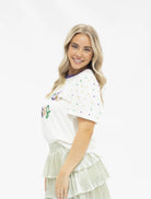 Let the good times shine ✨🎭 The Sequin “Mardi Gras” Princess Top is made for celebrating in full sparkle. Designed on a soft white tee, this festive favorite features bold sequin “Mardi Gras” lettering in classic purple, green, and gold, plus colorful studded polka dots along the sleeves for an extra pop of party-ready flair. With a relaxed fit and stretchy feel, it’s as comfortable as it is eye-catching—perfect for parades, parties, and all things Mardi Gras.