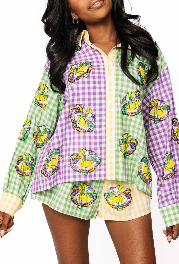 Colorblock Mardi Gras Gingham King Cake Button Up Top Queen of Sparkles