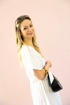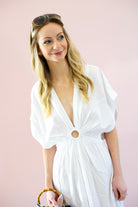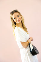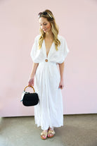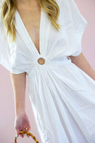 Breezy, elegant, and effortlessly flattering. The Elan Coastal Knot Maxi Dress features a soft, flowy silhouette with a statement front knot detail that creates a beautifully gathered waistline. The deep V-neckline and relaxed flutter sleeves give this dress an easy, resort-ready feel while the maxi length adds just the right amount of elegance.