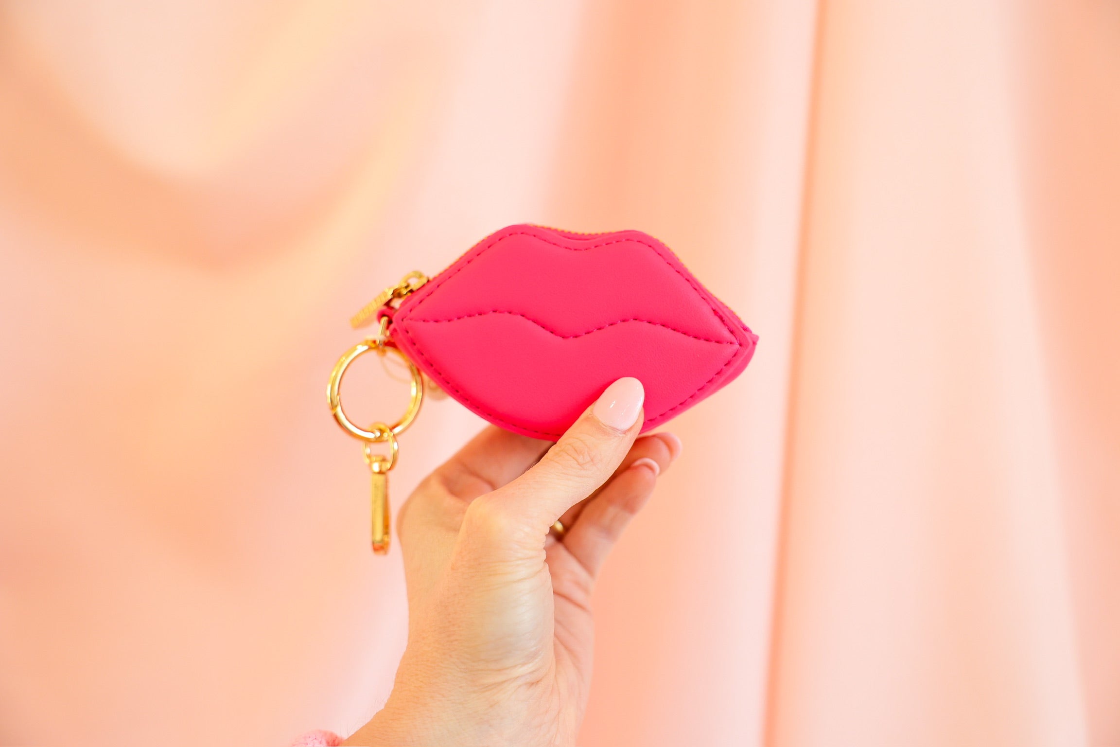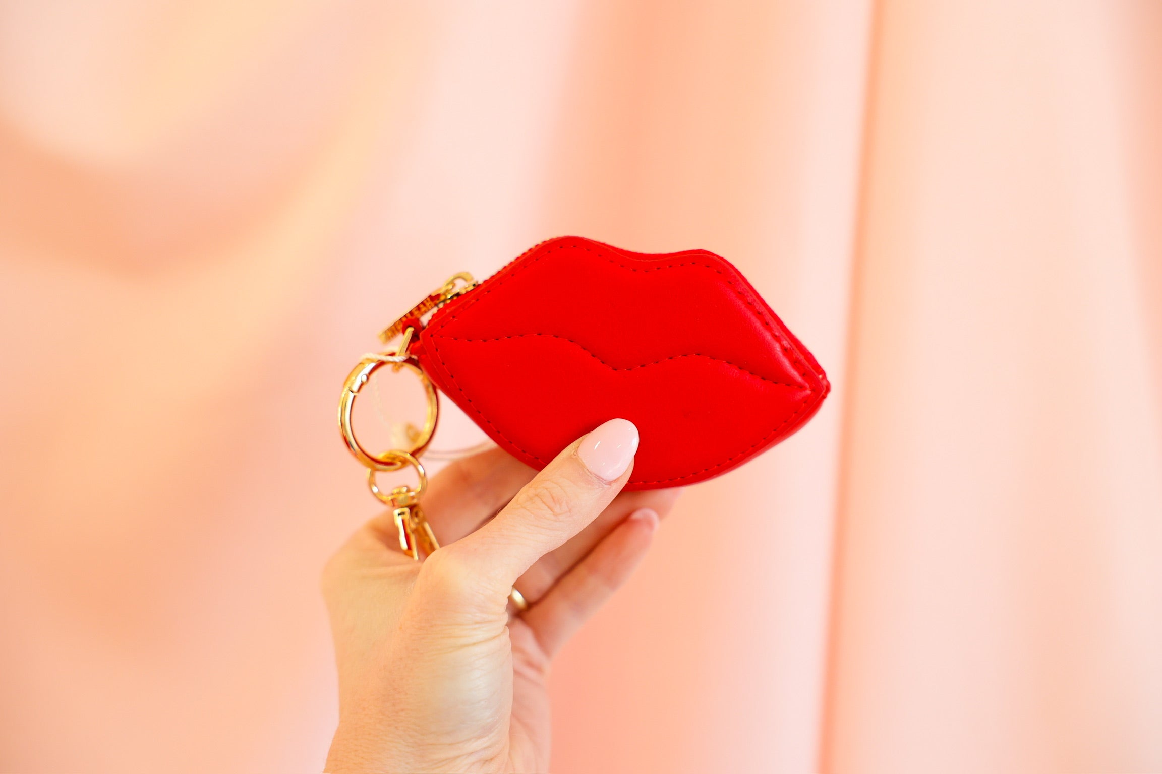 Pucker up 💋 The Kisses Zip Card Case adds a flirty twist to your everyday essentials with its bold lip-shaped design and plush texture. Designed to bring personality wherever it goes, this petite zip pouch is perfect for holding cash, cards, earbuds, or lip balm. Finished with shiny gold hardware, it clips effortlessly to your keys, tote, backpack, or belt loop—making it as functional as it is fun.