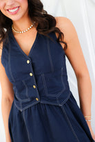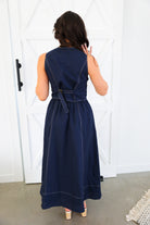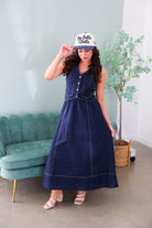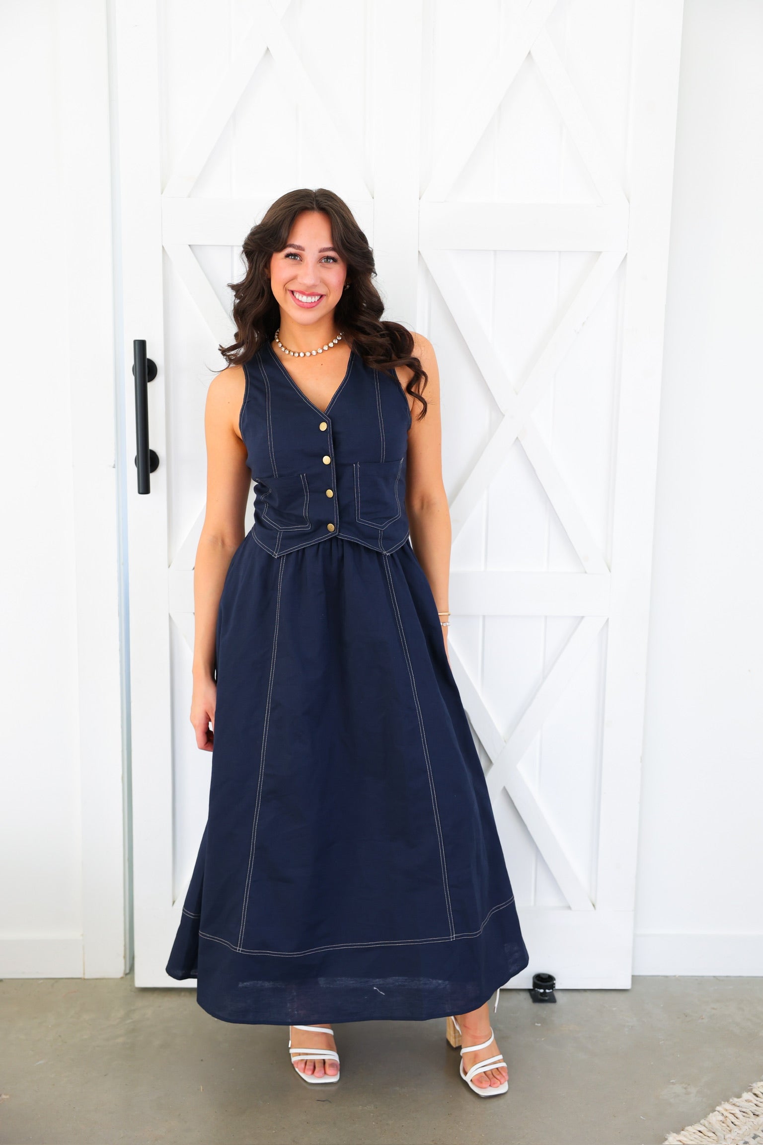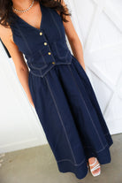 Modern utility meets effortless femininity šŸ¤ Th Charleston Stitch Midi Dress features a structured sleeveless bodice with bold contrast stitching and gold button-front details for a polished yet relaxed look.