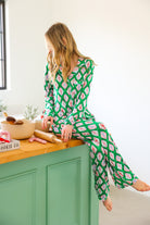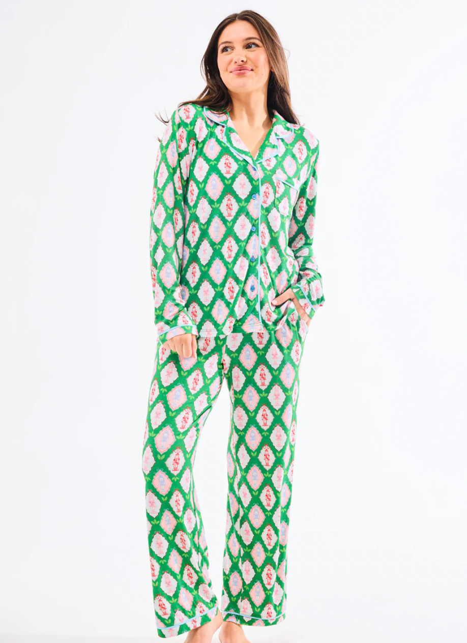 Introducing our Holiday Charlotte Pajama Set, where comfort meets festive charm. Perfect for sipping cocoa by the tree or enjoying Christmas morning in cozy style, this pajama set brings holiday cheer to every moment. Featuring a long-sleeve button-front top with a classic collar and straight-leg pants with an adjustable drawstring, our Charlotte Pajama Set combines classic holiday style with all-day comfort.